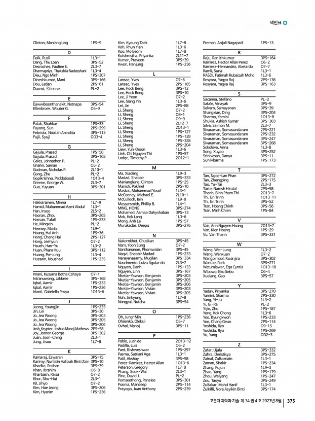 색인표 고분자 과학과 기술 제 34 권 4 호 2023년 8월 375 Clinton, Manianglung 1PS-9 D Daik, Rusli 1L3-1 Dang, Thu Loan 3PS-52 Desroches, Pauline E. 2L3-7 Dharmapriya, Thakshila Nadeeshani 1L3-4 Dieu, Ngo Minh 1PS-307 Dineshkumar, Mani 3PS-166 Dou, Letian 2PS-61 Ducrot, tienne PL-2 E Eawwiboonthanakit, Netnapa 3PS-54 Ellenbroek, Wouter G. O5-9 F Falak, Shahkar 1PS-33 Fayong, Sun 2PS-299 Febriola, Nabilah Anindita 3PS-113 Fujii, Syuji OD3-4 G Gajula, Prasad 1PS-50 Gajula, Prasad 3PS-165 Gales, Johnathon P. PL-2 Ghahri, Saman O5-2 Godman, Nicholas P. 2L10-1 Gong, Zhe PL-2 Gopikrishna, Peddaboodi 1O13-4 Greene, George W. 2L3-7 Guo, Yuyuan 3PS-301 H Hakkarainen, Minna 1L7-9 Hamid, Muhammad Azmi Abdul 1L3-1 Han, Insoo 2L5-2 Haoran, Zhou 3PS-265 Hassan, Tufail 1PS-233 He, Mingxin PL-2 Heeney, Martin 1L9-1 Hoang, Hai Anh 1PS-36 Hong, Cheng Hai 2PS-127 Hong, Jeehyun O7-2 Hsueh, Han-Yu 1L3-2 Huan, Pham Huu 3PS-112 Huang, Po-Jung 1L3-4 Hussain, Noushad 1PS-235 I Imani, Kusuma Betha ...