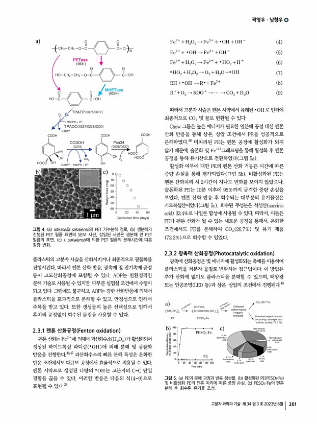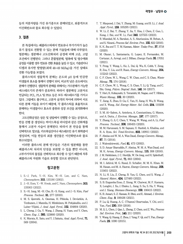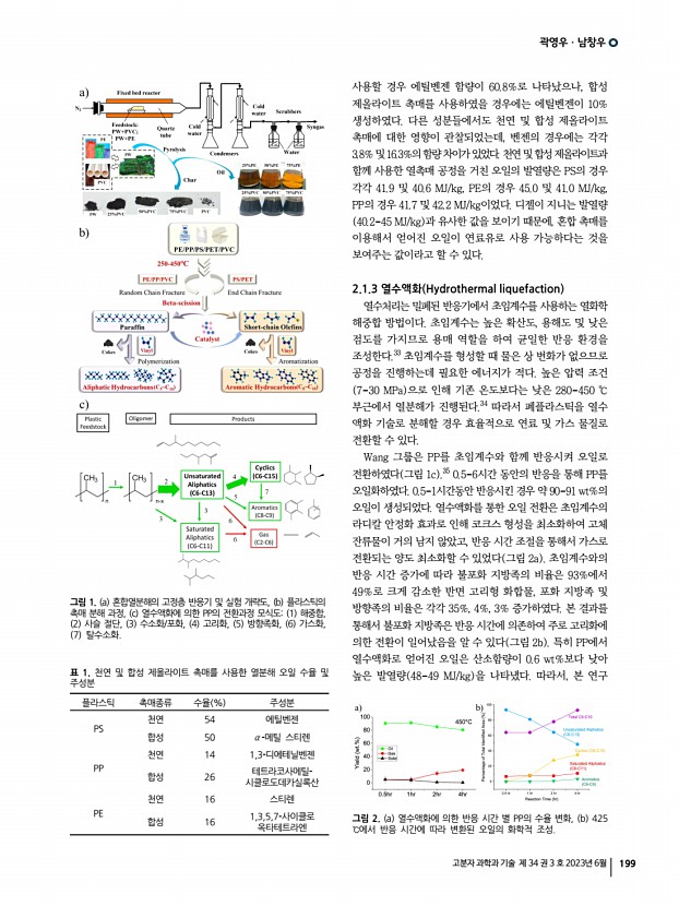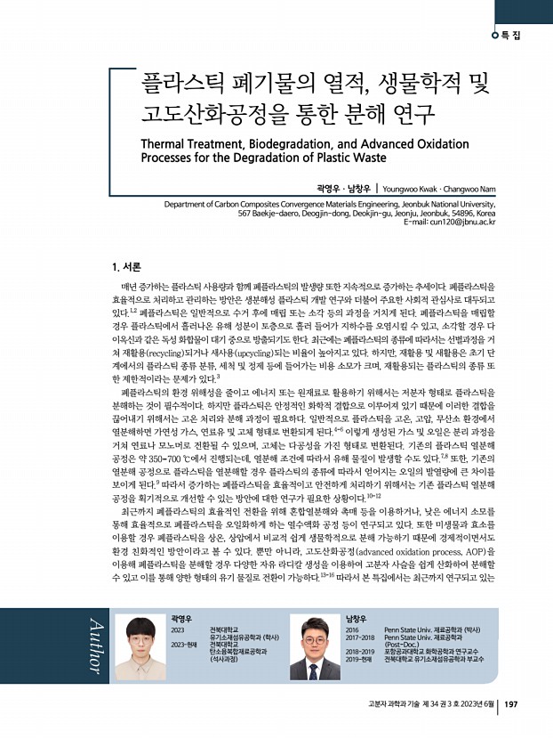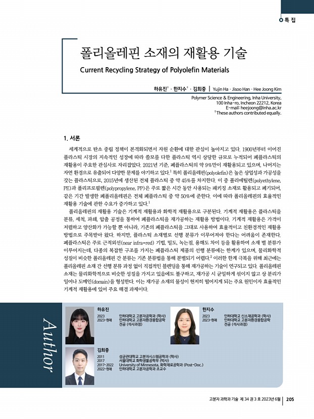 특 집 고분자 과학과 기술 제 34 권 3 호 2023년 6월 205 1. 서론 세계적으로 탄소 중립 정책이 본격화되면서 자원 순환에 대한 관심이 높아지고 있다. 1900년부터 이어진 플라스틱 시장의 지속적인 성장에 따라 쓸모를 다한 플라스틱 역시 상당한 규모로 누적되어 폐플라스틱의 재활용이 주요한 관심사로 자리잡았다. 2021년 기준, 폐플라스틱의 약 9%만이 재활용되고 있으며, 나머지는 자연 환경으로 유출되어 다양한 문제를 야기하고 있다.1 특히 폴리올레핀 polyolefin 은 높은 상업성과 가공성을 갖는 플라스틱으로, 2015년에 생산된 전체 플라스틱 중 약 45%를 차지한다. 이 중 폴리에틸렌 polyethylene, PE 과 폴리프로필렌 polypropylene, PP 은 주로 짧은 시간 동안 사용되는 패키징 소재로 활용되고 폐기되어, 같은 기간 발생한 폐폴리올레핀은 전체 폐플라스틱 중 약 50%에...