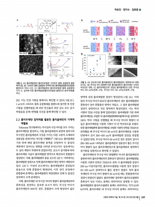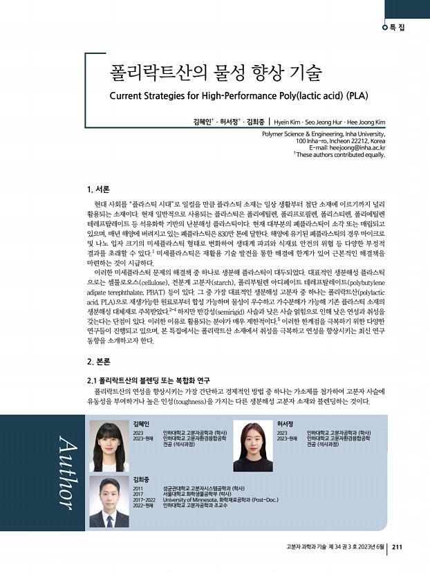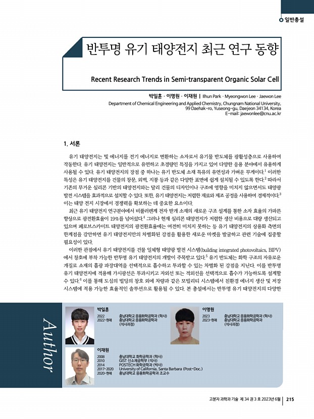 일반총설 고분자 과학과 기술 제 34 권 3 호 2023년 6월 215 반투명 유기 태양전지 최근 연구 동향 Recent Research Trends in Semi-transparent Organic Solar Cell 박일훈ㆍ이명원ㆍ이재원 | Ilhun ParkㆍMyeongwon LeeㆍJaewon Lee Department of Chemical Engineering and Applied Chemistry, Chungnam National University, 99 Daehak-ro, Yuseong-gu, Daejeon 34134, Korea E-mailjaewonlee@cnu.ac.kr 1. 서론 유기 태양전지는 빛 에너지를 전기 에너지로 변환하는 소자로서 유기물 반도체를 광활성층으로 사용하여 작동한다. 유기 태양전지는 일반적으로 유연하고 초경량인 특징을 가지고 있어 다양한 응용 분야에서 유용하게 사용될 수 있다. 유기 태양전지의 장점 중 하나는 유기 반도체 소재 특유의 유연성과 가벼운 무게이다.1 이러한 특성은 유기 태양전지를 건물의 창문, 외벽, 지붕 등과 같은 다양한 표면에 쉽게 설치될 수 있도...