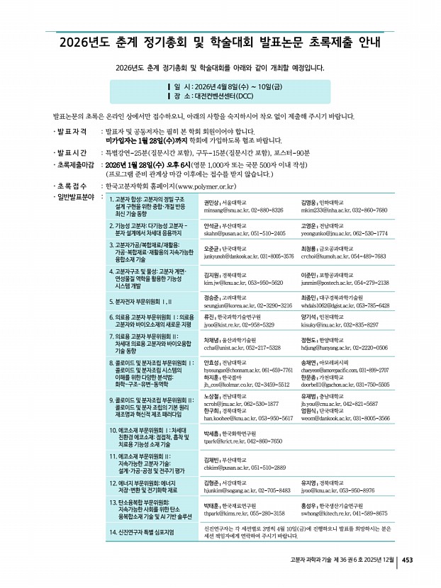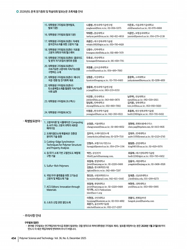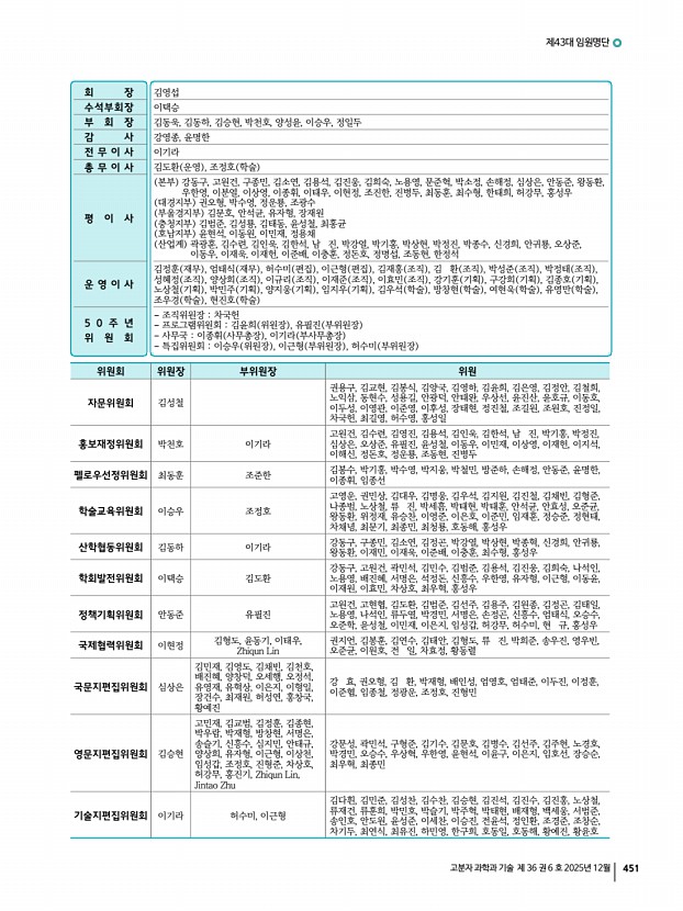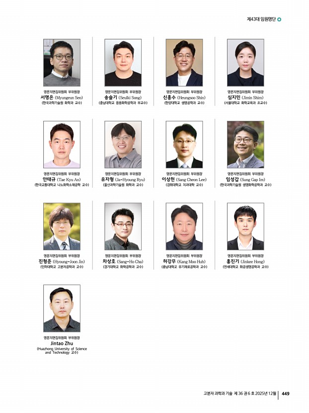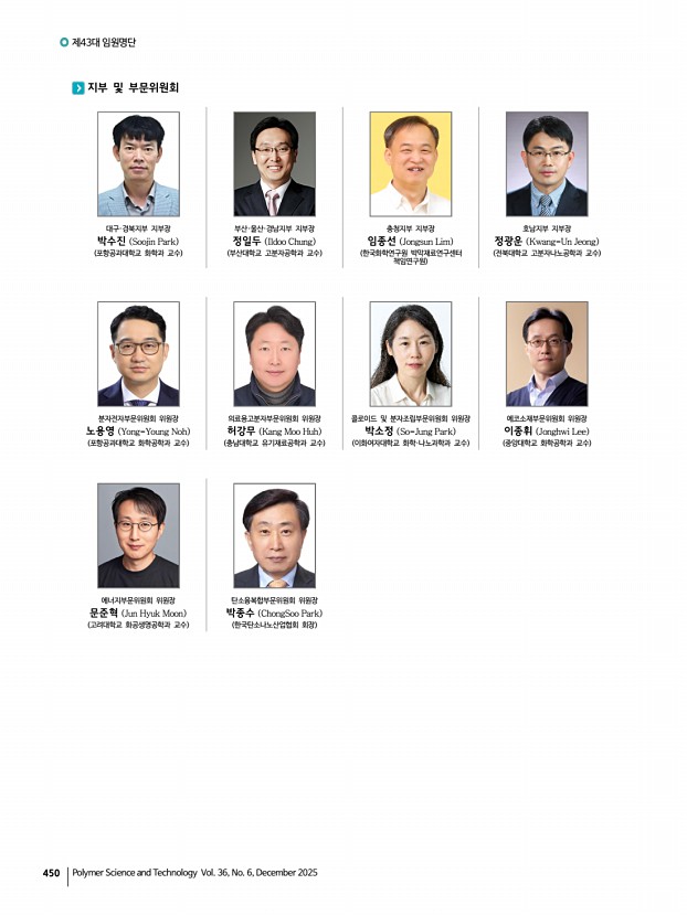 제43대 임원명단 고분자 과학과 기술 제 36 권 6 호 2025년 12월 451 회 장 김영섭 수석부회장 이택승 부 회 장 김동욱, 김동하, 김승현, 박천호, 양성윤, 이승우, 정일두 감 사 강영종, 윤명한 전 무 이 사 이기라 총 무 이 사 김도환 운영 , 조정호 학술 평 이 사 본부 강동구, 고원건, 구종민, 김소연, 김용석, 김진웅, 김희숙, 노용영, 문준혁, 박소정, 손해정, 심상은, 안동준, 왕동환, 우한영, 이분열, 이상영, 이종휘, 이태우, 이현정, 조진한, 진병두, 최동훈, 최수형, 한태희, 허강무, 홍성우 대경지부 권오형, 박수영, 정운룡, 조광수 부울경지부 김문호, 안석균, 유자형, 장재원 충청지부 김범준, 김성룡, 김태동, 윤성철, 최홍균 호남지부 윤현석, 이동원, 이민재, 정용채 산업계 곽광훈, 김수련, 김인욱, 김한석, 남 진, 박강열, 박기홍, 박상현, 박정진, 박종수, 신경...