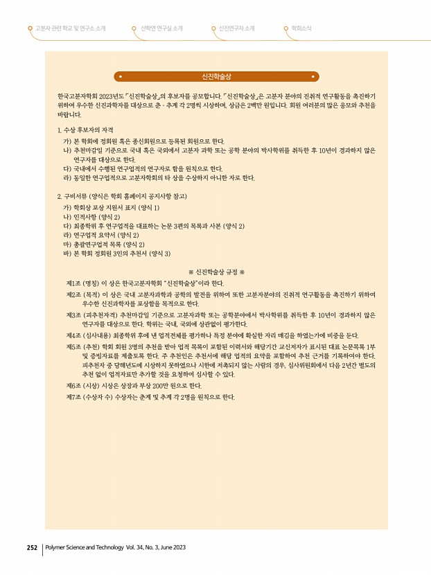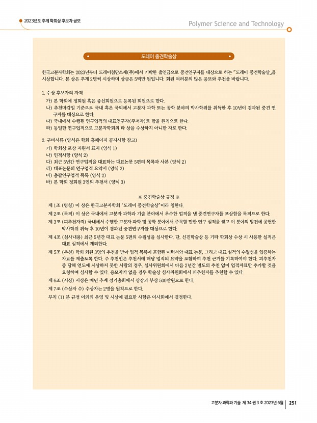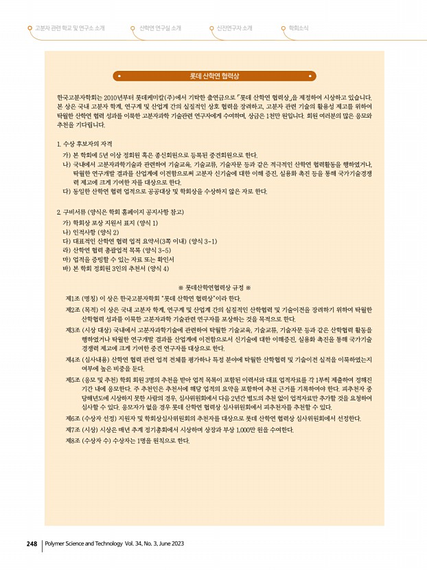 ...소개 학회소식 248 Polymer Science and Technology Vol. 34, No. 3, June 2023 롯데 산학연 협력상 한국고분자학회는 2010년부터 롯데케미칼 주 에서 기탁한 출연금으로 「롯데 산학연 협력상」을 제정하여 시상하고 있습니다. 본 상은 국내 고분자 학계, 연구계 및 산업계 간의 실질적인 상호 협력을 장려하고, 고분자 관련 기술의 활용성 제고를 위하여 탁월한 산학연 협력 성과를 이룩한 고분자과학 기술관련 연구자에게 수여하며, 상금은 1천만 원입니다. 회원 여러분의 많은 응모와 추천을 기다립니다. 1. 수상 후보자의 자격 가 본 학회에 5년 이상 정회원 혹은 종신회원으로 등록된 중견회원으로 한다. 나 국내에서 고분자과학기술과 관련하여 기술교육, 기술교류, 기술자문 등과 같은 적극적인 산학연 협력활동을 행하였거나, 탁월한 연구개발 결과를 산업계에 이전함...