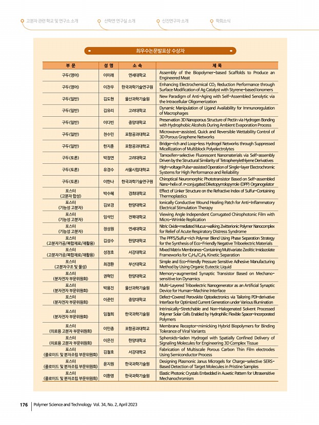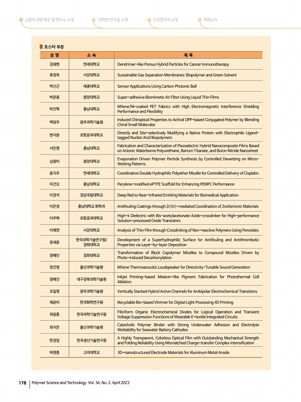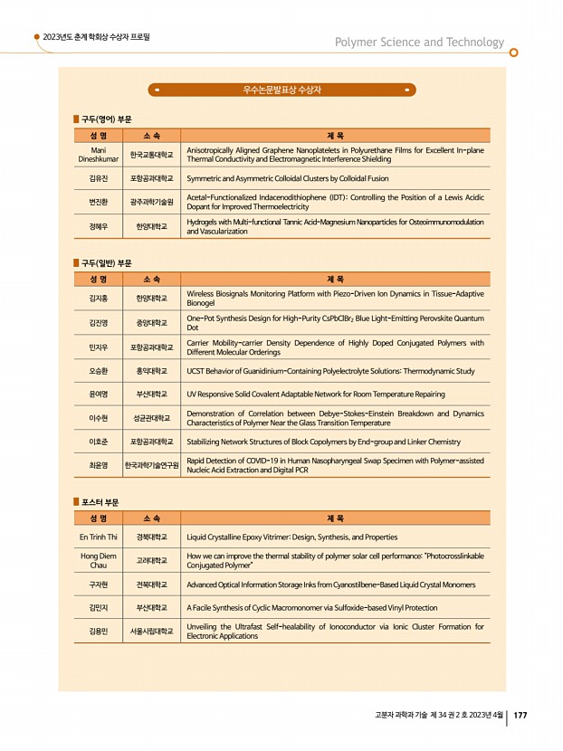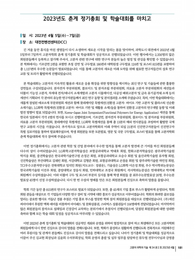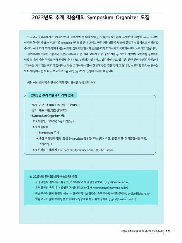 고분자 과학과 기술 제 34 권 2 호 2023년 4월 179 한국고분자학회에서는 1998년부터 심포지엄 형식의 발표를 학술논문발표회에 도입하여 시행해 오고 있으며, 이러한 형식의 발표는 심포지엄 organizer 및 초청 연사 그리고 학회 회원님들의 협조에 힘입어 성공적으로 정착되었 습니다. 이에 따라 우리 학회에서는 이러한 심포지엄 형식의 발표를 더욱 확대시키고 국제화하고자 노력하고 있습니다. 심포지엄의 주제는 전통적인 고분자 과학과 기술, 미래 고분자 기술, 융합 기술 등 제한이 없으며, 고분자를 응용하는 인접 분야의 기술 주제도 적극 환영합니다. 다소 부담되는 일이라고 생각하실 수도 있지만, 관련 분야 논의의 활성화에 기여하는 의미 있는 학회 활동이라는 점을 고려하셔서 많이 신청해 주실 것을 부탁 드립니다. 심포지엄 조직을 원하는 학회 ...