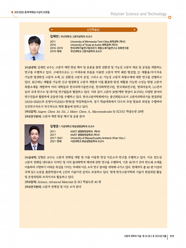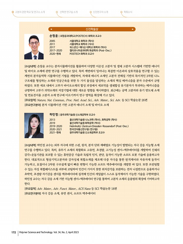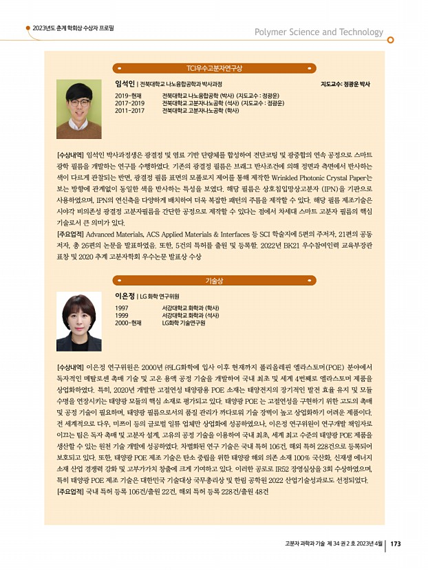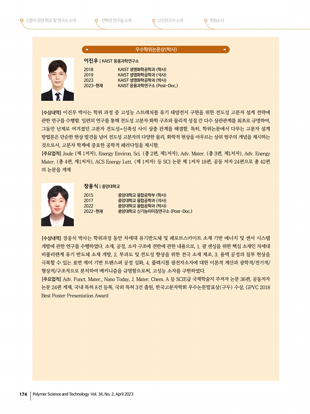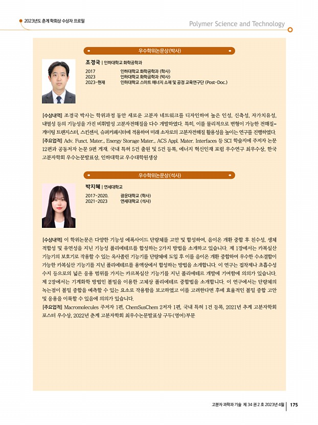 2023년도 춘계 학회상 수상자 프로필 고분자 과학과 기술 제 34 권 2 호 2023년 4월 175 우수학위논문상 박사 조경국|인하대학교 화학공학과 2017 인하대학교 화학공학과 학사 2023 인하대학교 화학공학과 박사 2023-현재 인하대학교 스마트 에너지 소재 및 공정 교육연구단 Post-Doc. [수상내역] 조경국 박사는 학위과정 동안 새로운 고분자 네트워크를 디자인하여 높은 인성, 신축성, 자가치유성, 내열성 등의 기능성을 가진 비휘발성 고분자전해질을 다수 개발하였다. 특히, 이를 물리적으로 변형이 가능한 전해질- 게이팅 트랜지스터, 스킨센서, 슈퍼커패시터에 적용하여 미래 소자로의 고분자전해질 활용성을 높이는 연구를 진행하였다. [주요업적] Adv. Funct. Mater., Energy Storage Mater., ACS Appl. Mater. Interfaces 등 SCI 학술지에 주저자 논문 12편과 공동저자 논문 9편 게재....