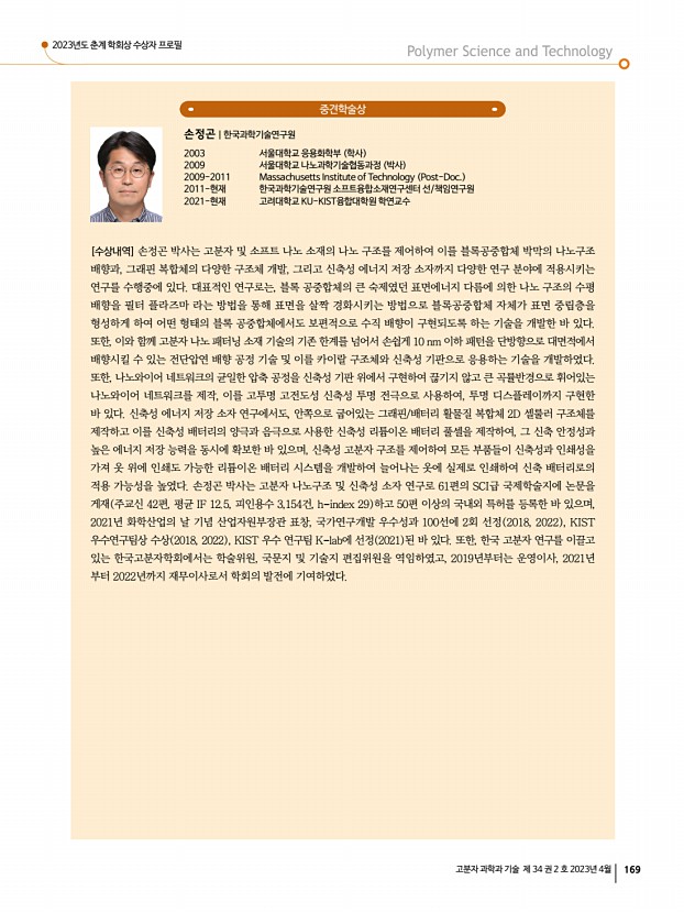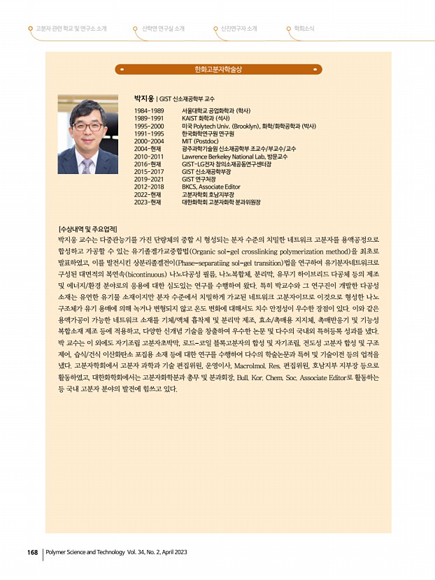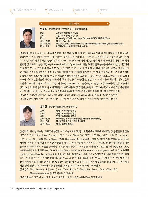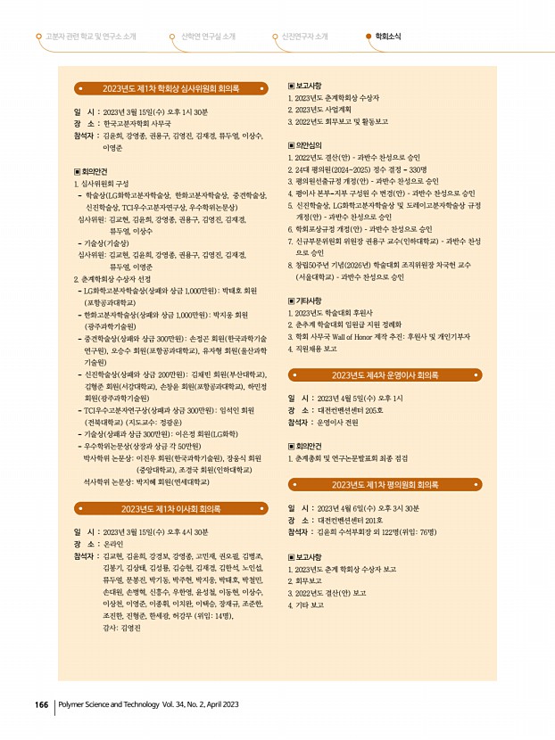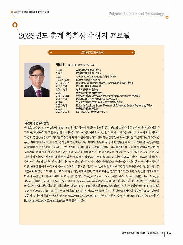 ...상, 신진학술상, TCI우수고분자연구상, 우수학위논문상 심사위원김교현, 김윤희, 강영종, 권용구, 김영진, 김재경, 류두열, 이상수 기술상 기술상 심사위원김교현, 김윤희, 강영종, 권용구, 김영진, 김재경, 류두열, 이영준 2. 춘계학회상 수상자 선정 LG화학고분자학술상 상패와 상금 1,000만원 박태호 회원 포항공과대학교 한화고분자학술상 상패와 상금 1,000만원 박지웅 회원 광주과학기술원 중견학술상 상패와 상금 300만원 손정곤 회원 한국과학기술 연구원 , 오승수 회원 포항공과대학교 , 유자형 회원 울산과학 기술원 신진학술상 상패와 상금 200만원 김채빈 회원 부산대학교 , 김형준 회원 서강대학교 , 손창윤 회원 포항공과대학교 , 하민정 회원 광주과학기술원 TCI우수고분자연구상 상패과 상금 300만원 임석인 회원 전북대학교 지도교수정광운 기술상 ...