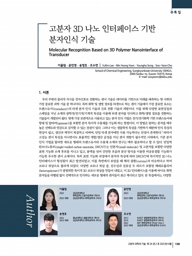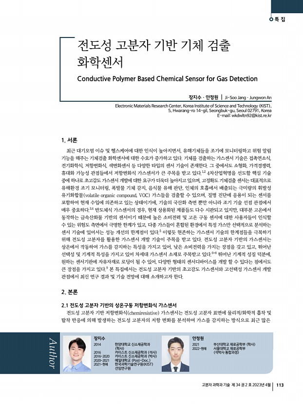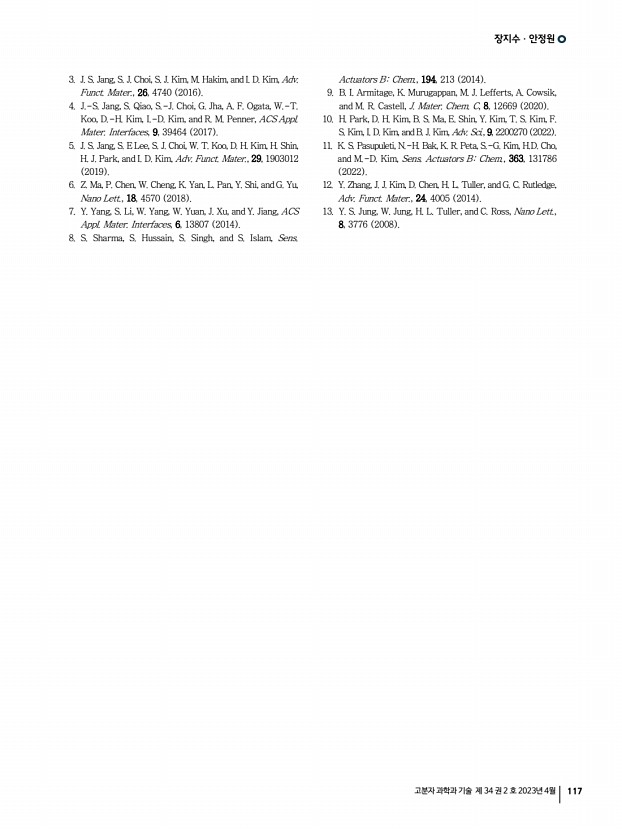 장지수ㆍ안정원 고분자 과학과 기술 제 34 권 2 호 2023년 4월 117 3. J. S. Jang, S. J. Choi, S. J. Kim, M. Hakim, and I. D. Kim, Adv. Funct. Mater., 26, 4740 2016 4. J.-S. Jang, S. Qiao, S.-J. Choi, G. Jha, A. F. Ogata, W.-T. Koo, D.-H. Kim, I.-D. Kim, and R. M. Penner, ACS Appl. Mater. Interfaces, 9, 39464 2017 5. J. S. Jang, S. E Lee, S. J. Choi, W. T. Koo, D. H. Kim, H. Shin, H. J. Park, and I. D. Kim, Adv. Funct. Mater., 29, 1903012 2019 6. Z. Ma, P. Chen, W. Cheng, K. Yan, L. Pan, Y. Shi, and G. Yu, Nano Lett., 18, 4570 2018 7. Y. Yang, S. Li, W. Yang, W. Yuan, J. Xu, and Y. Jiang, ACS Appl. Mater. Interfaces, 6, 13807 2014 8. S. Sharma, S. Hussain, S. Singh, and S. Islam, Sens. Actuators BChem., 194, 213 2014 9. B. I. Armitage, K. Murugappan, M. J. Lefferts, A. Cowsik, and M. R. Castell, J. Mater. Chem. C, 8, 12669 2020 10. H. Park, D. H. Kim, B. S. Ma, E. Shin, Y. Kim, T. S. Kim, F. S. Kim, I. D. Kim, and B. J. Kim, Adv. Sci., 9, 2200270 2022 11. K. S. Pasupulet...