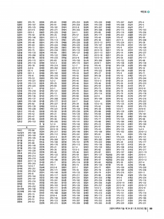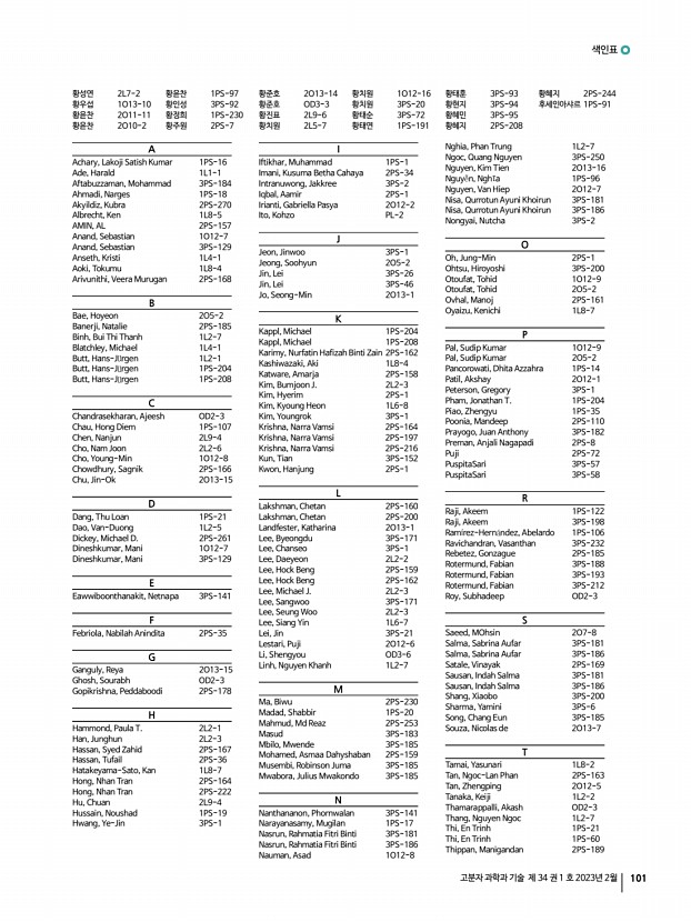 색인표 고분자 과학과 기술 제 34 권 1 호 2023년 2월 101 황성연 2L7-2 황우섭 1O13-10 황윤찬 2O11-11 황윤찬 2O10-2 황윤찬 1PS-97 황인성 3PS-92 황정희 1PS-230 황주원 2PS-7 황준호 2O13-14 황준호 OD3-3 황진표 2L9-6 황치원 2L5-7 황치원 1O12-16 황치원 3PS-20 황태순 3PS-72 황태연 1PS-191 황태훈 3PS-93 황현지 3PS-94 황혜민 3PS-95 황혜지 2PS-208 황혜지 2PS-244 후세인아샤르 1PS-91 A Achary, Lakoji Satish Kumar 1PS-16 Ade, Harald 1L1-1 Aftabuzzaman, Mohammad 3PS-184 Ahmadi, Narges 1PS-18 Akyildiz, Kubra 2PS-270 Albrecht, Ken 1L8-5 AMIN, AL 2PS-157 Anand, Sebastian 1O12-7 Anand, Sebastian 3PS-129 Anseth, Kristi 1L4-1 Aoki, Tokumu 1L8-4 Arivunithi, Veera Murugan 2PS-168 B Bae, Hoyeon 2O5-2 Banerji, Natalie 2PS-185 Binh, Bui Thi Thanh 1L2-7 Blatchley, Michael 1L4-1 Butt, Hans-J rgen 1L2-1 Butt, Hans-J rgen 1PS-204 Butt, Hans-J rgen 1PS-208 C Chandrasekharan, Ajeesh OD2-3 Chau, Hong Diem 1PS-107 Chen, Nanjun 2L9-4 Cho,...