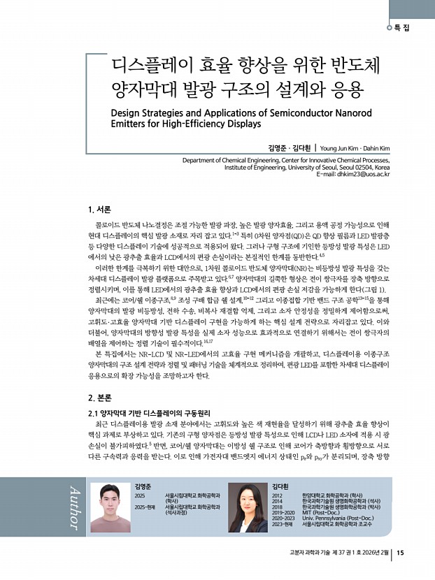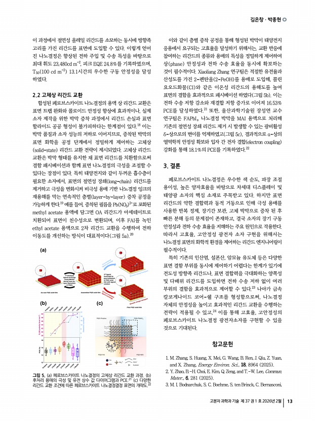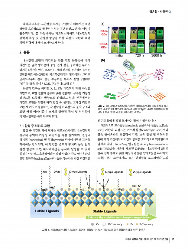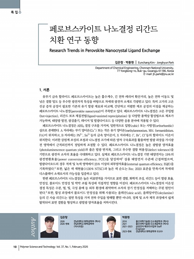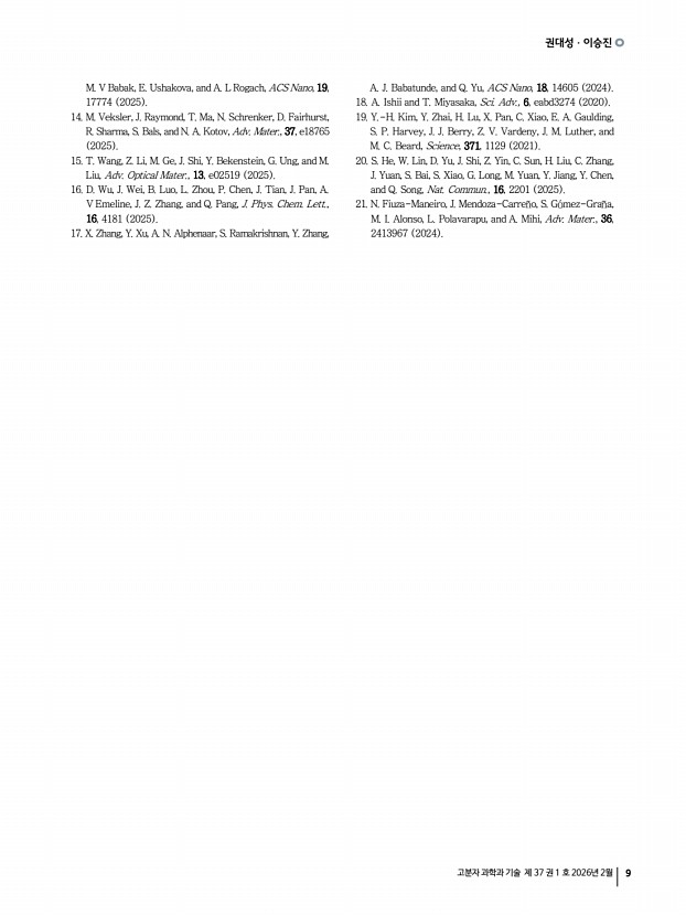 권대성ㆍ이승진 고분자 과학과 기술 제 37 권 1 호 2026년 2월 9 M. V Babak, E. Ushakova, and A. L Rogach, ACS Nano, 19, 17774 2025 14. M. Veksler, J. Raymond, T. Ma, N. Schrenker, D. Fairhurst, R. Sharma, S. Bals, and N. A. Kotov, Adv. Mater., 37, e18765 2025 15. T. Wang, Z. Li, M. Ge, J. Shi, Y. Bekenstein, G. Ung, and M. Liu, Adv. Optical Mater., 13, e02519 2025 16. D. Wu, J. Wei, B. Luo, L. Zhou, P. Chen, J. Tian, J. Pan, A. V Emeline, J. Z. Zhang, and Q. Pang, J. Phys. Chem. Lett., 16, 4181 2025 17. X. Zhang, Y. Xu, A. N. Alphenaar, S. Ramakrishnan, Y. Zhang, A. J. Babatunde, and Q. Yu, ACS Nano, 18, 14605 2024 18. A. Ishii and T. Miyasaka, Sci. Adv., 6, eabd3274 2020 19. Y.-H. Kim, Y. Zhai, H. Lu, X. Pan, C. Xiao, E. A. Gaulding, S. P. Harvey, J. J. Berry, Z. V. Vardeny, J. M. Luther, and M. C. Beard, Science, 371, 1129 2021 20. S. He, W. Lin, D. Yu, J. Shi, Z. Yin, C. Sun, H. Liu, C. Zhang, J. Yuan, S. Bai, S. Xiao, G. Long, M. Yuan, Y. Jiang, Y. Chen, and Q. Son...