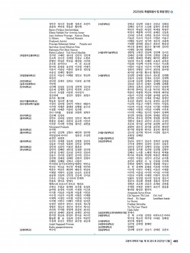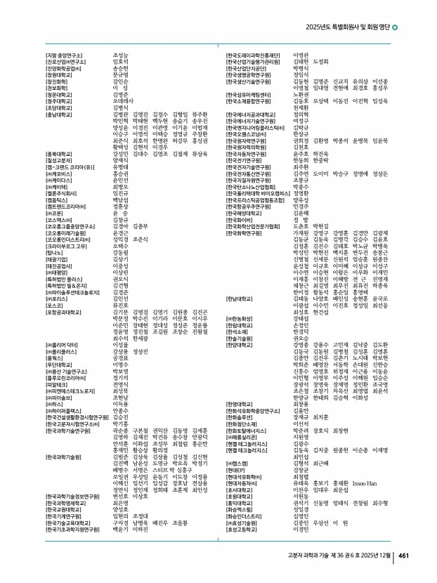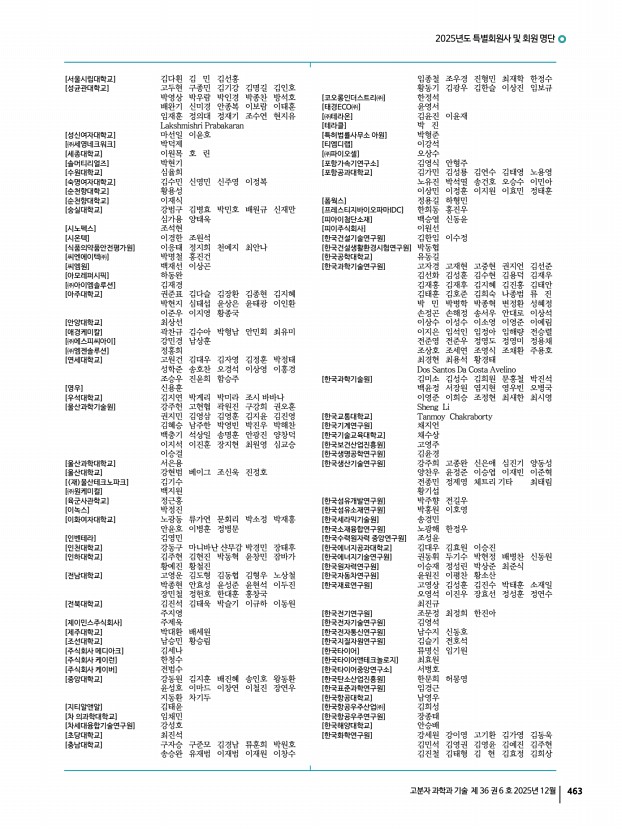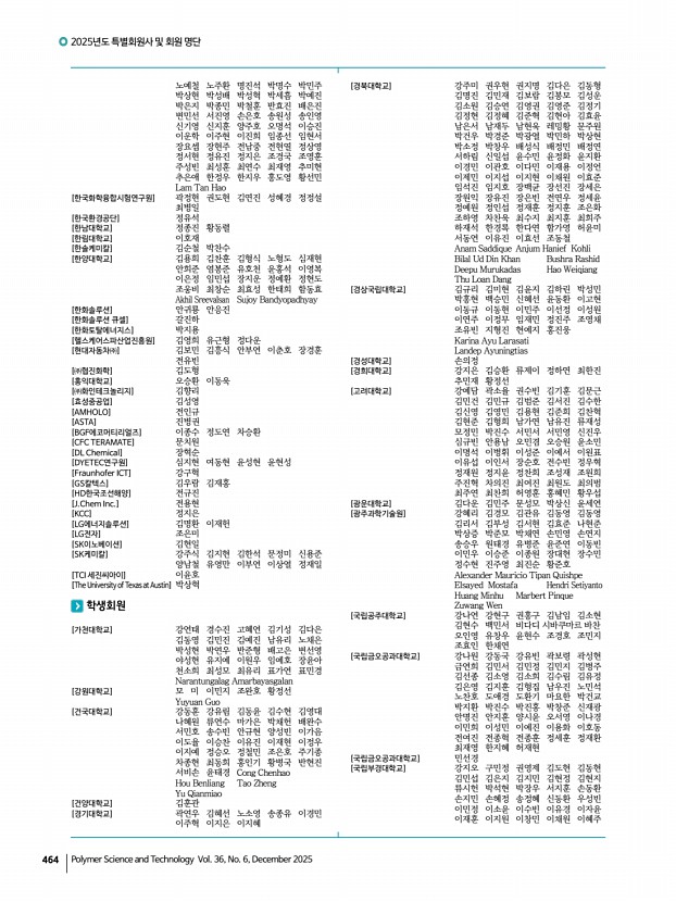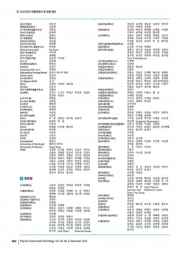2025년도 특별회원사 및 회원 명단 고분자 과학과 기술 제 36 권 6 호 2025년 12월 461 [지팜 중앙연구소] 조성능 [진로산업㈜연구소] 임호석 [진양화학공업㈜] 송승헌 [창원대학교] 문규열 [창진화학] 강인순 [천보화학] 이 성 [청운대학교] 김영준 [청주대학교] 오데레사 [초당대학교] 김병식 [충남대학교] 김병관 김영진 김정수 김형일 류주환 박인혁 박태현 백두현 송슬기 송우진 양성윤 이경진 이관영 이기윤 이범재 이승구 이영석 이택승 정영규 주창환 최준식 최호석 한명완 허강무 홍성권 황택성 김현석 이경우 [충북대학교] 강성민 김대수 김영조 김철재 류상욱 [칠성고분자] 양재식 [캠-크랜드 코리아 유 ] 유병태 [㈜케모비스] 홍승권 [㈜케미다스] 윤인선 [㈜케미텍] 최병오 [켈론주식회사] 임진규 [켐옵틱스] 백남섭 [켐트랜드코리아㈜] 정훈상 [㈜코본] 윤...