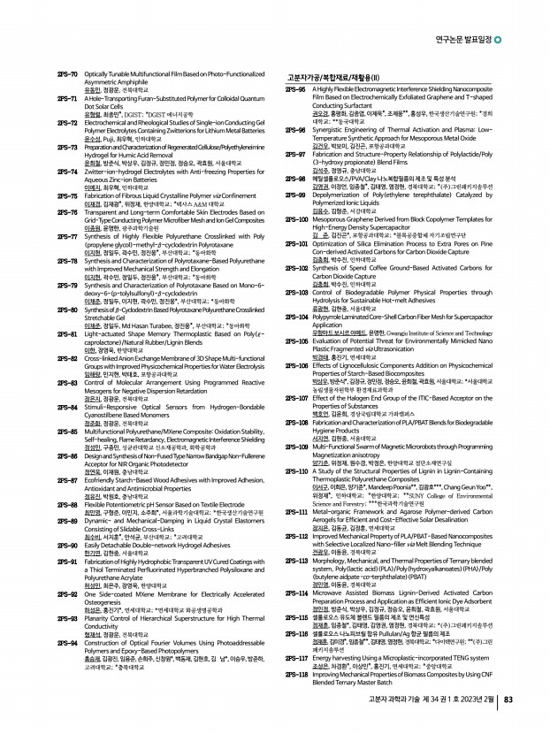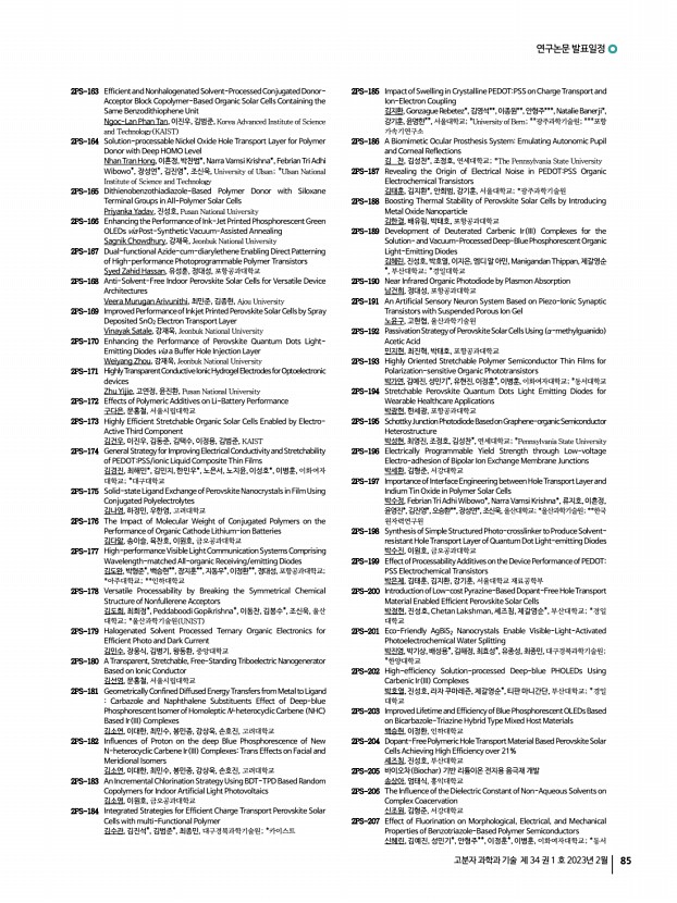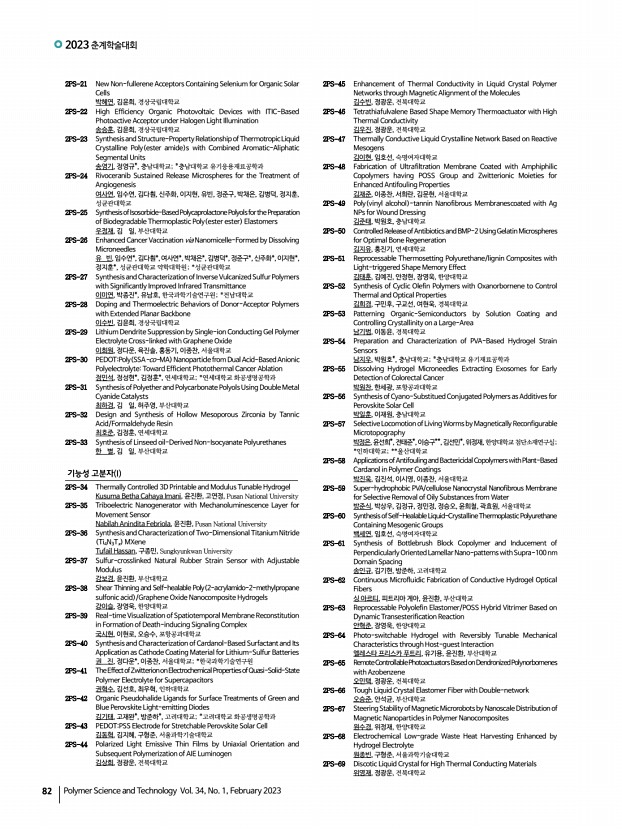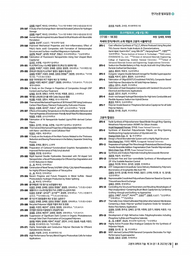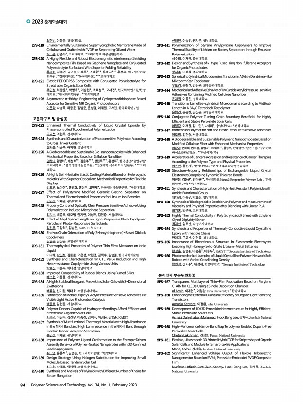 ...연, 이성주, 김현중, 서울대학교 2PS-129 Effect of Alkyl Spacer Length on Light-Responsive Block Copolymer Particles in Photo-Responsive Surfactants 김진우, 구강희*, 김범준, KAIST; *UNIST 2PS-130 End-on Chain Orientation of Poly 3-hexylthiophene -Based Diblock Copolymers 김필곤, 김진곤, 포항공과대학교 2PS-131 Thermophysical Properties of Polymer Thin Films Measured on Ionic Liquid 이다혜, 박진석, 김동준, 오은성, 박현정, 김택수, 김범준, 한국과학기술원 2PS-132 Synthesis and Characterization for CTE Value Reduction and High Heat-resistance Copolyimide Using Various Units 박효진, 이승우, 채다정, 영남대학교 2PS-133 Improved Compatibility of Rubber Blends Using Fumed Silica 배소현, 이동윤, 경북대학교 2PS-134 A Highly Stable all Inorganic Perovskites Solar Cells with 3-Dimensional Zwitterions 배유림, 신기원, 박태호, 포항공과대학교 2PS-135 Fabrication of Mobile Displays’ Acrylic Pressure Sens...