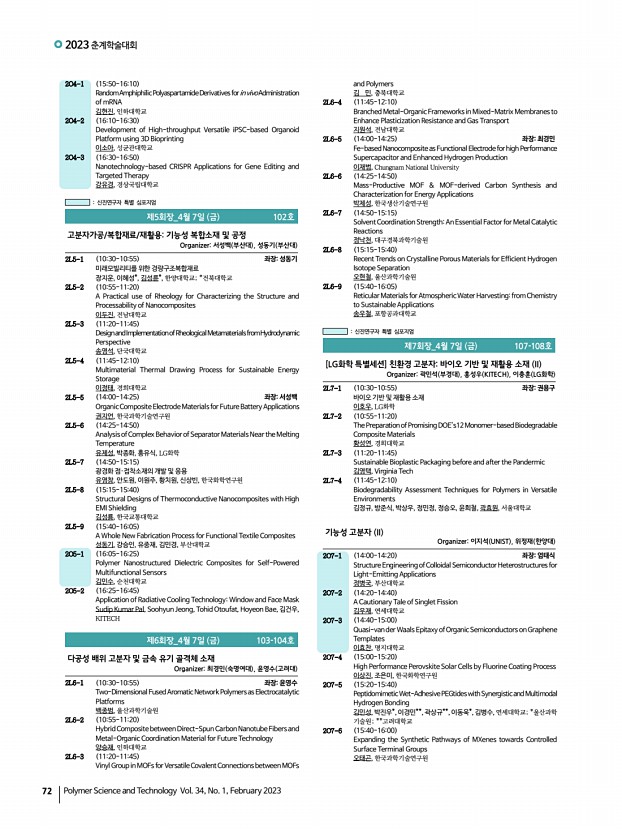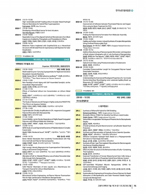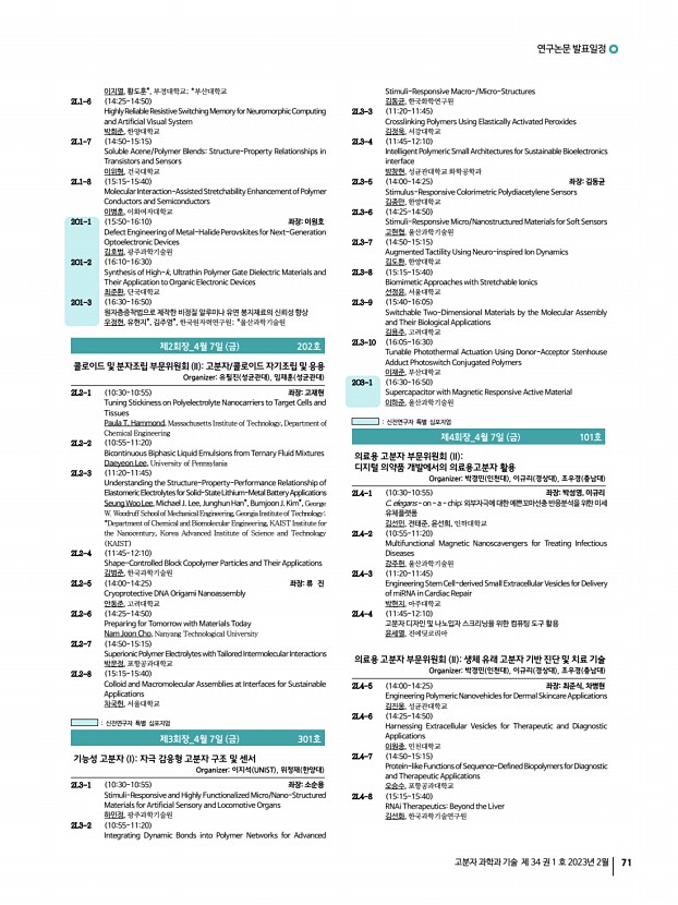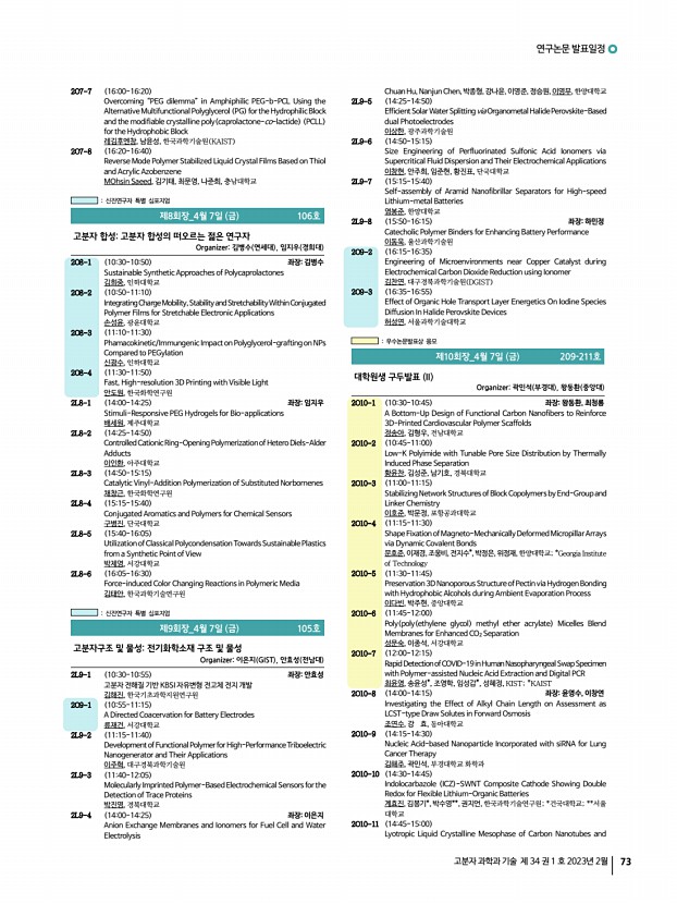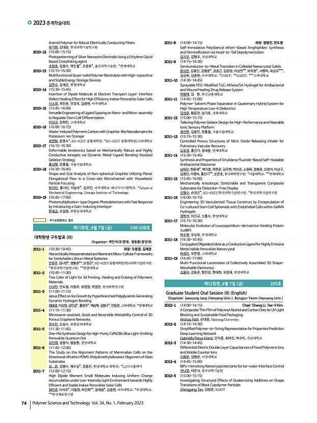 2023 춘계학술대회 74 Polymer Science and Technology Vol. 34, No. 1, February 2023 Aramid Polymer for Robust Electrically Conducting Fibers 유기현, 김대윤, 한국과학기술연구원 2O10-12 1500-1515 Photopatterning of Silver Nanowire Electrode Using a Ethylene Glycol Based Crosslinking agent 조완호, 김봉수, 곽인철*, 조정호*, 울산과학기술원; *연세대학교 2O10-13 1515-1530 Multifunctional Quasi-solid Polymer Electrolyte with High-capacitive and StableEnergy Storage Devices 김은수, 김재균, 한양대학교 2O10-14 1530-1545 Insertion of Dipole Molecule at Electron Transport LayerInterface Defect Healing Effect for High Efficiency Indoor Perovskite Solar Cells 신소정, 최민준, 전경국, 김종현, 아주대학교 2O10-15 1545-1600 Versatile Engineering of Ligand Spacing on Nano- and Micro-assembly to Regulate Stem Cell Differentiation 이성규, 강희민, 고려대학교 2O10-16 1600-1615 Waste-induced Polymeric Carbon with Graphite-like Nan...