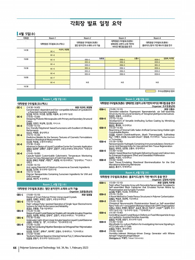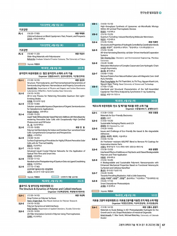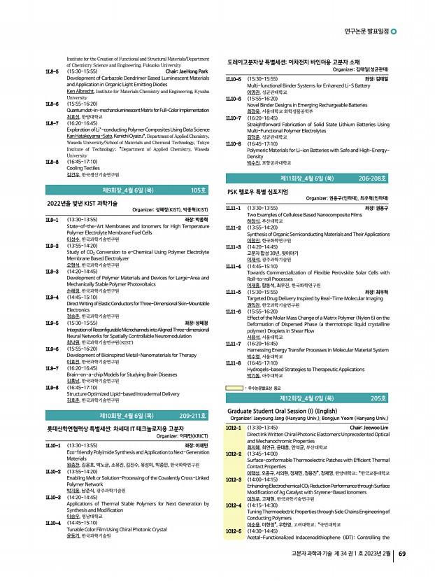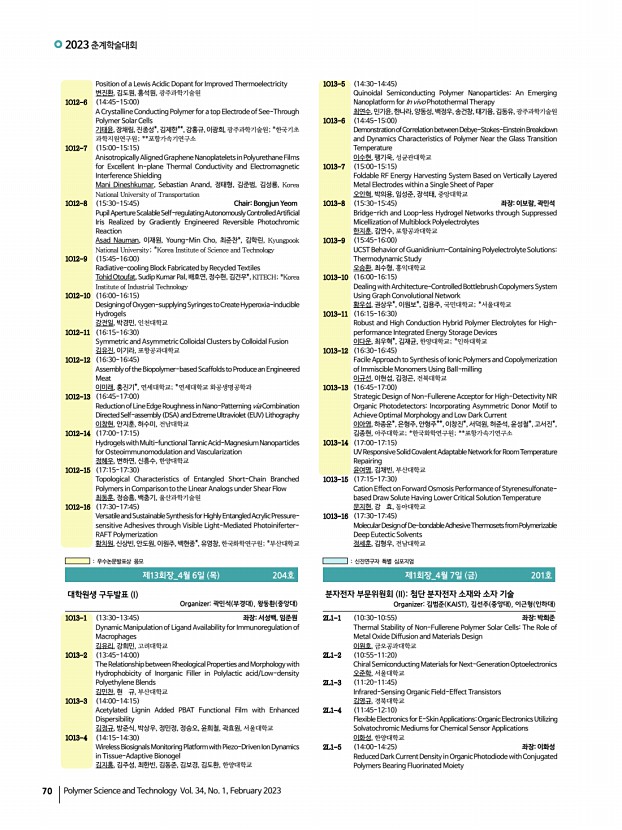 2023 춘계학술대회 70 Polymer Science and Technology Vol. 34, No. 1, February 2023 Position of a Lewis Acidic Dopant for Improved Thermoelectricity 변진환, 김도원, 홍석원, 광주과학기술원 1O12-6 1445-1500 A Crystalline Conducting Polymer for a top Electrode of See-Through Polymer Solar Cells 기태윤, 장채림, 진종성*, 김제한**, 강홍규, 이광희,광주과학기술원; *한국기초 과학지원연구원; **포항가속기연구소 1O12-7 1500-1515 Anisotropically Aligned Graphene Nanoplatelets in Polyurethane Films for Excellent In-plane Thermal Conductivity and Electromagnetic Interference Shielding Mani Dineshkumar, Sebastian Anand, 정태형, 김준범, 김성룡, Korea National University of Transportation 1O12-8 1530-1545 ChairBongjun Yeom Pupil ApertureScalable Self-regulatingAutonomously ControlledArtificial Iris Realized by Gradiently Engineered Reversible Photochromic Reaction Asad Nauman, 이재원, Young-Min Cho, 최준찬*, 김학린, Kyungp...