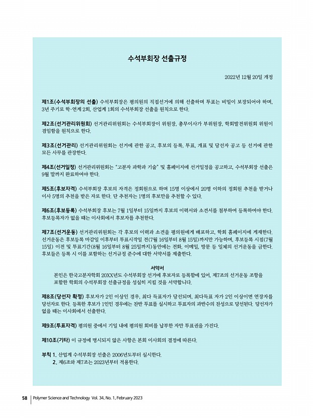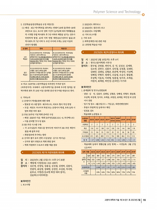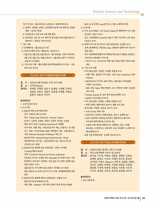 고분자 과학과 기술 제 34 권 1 호 2023년 2월 53 · 일시 및 장소5월 19일 금 20일 토 , 롯데부여리조트 1 등록비25만원, 교재비25만원 만 60세 이상 회원 및 산업체 회원 등록비 면제 2 산업체 참가 독려 프로그램 개발 필요 3 준비일정골프 및 숙소 예약 및 연사섭외 준비 3월 운영이사 회의까지 회장님, 전무이사님 7. 기타 사항 1 춘계학회상3월 3일 금 마감 2 운영이사회의 일정 해당요일목요일 4시 2월 16일, 3월 16일, 4월 5일 수 , 7월 10일 월 고분자 아카데미, 8월 17일, 9월 14일, 10월 11일 수 , 11월 8일 고분자 기기분석 , 12월 초 신구합동 3 기타 토의 사항 펠로우회원 춘추계학술대회 식사 장소 자문 위와 같은 장소로 2023년도 제1차 국제협력위원회 회의록 일 시 2023년 2월 6일 월 오전 10시 30분 장 소 온라인 Zoom 참석자 손대원, 박철민, 윤동기, 윤명한, 고현협, ...