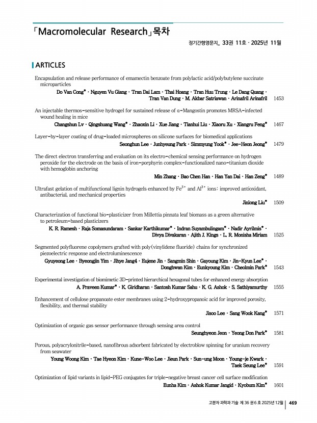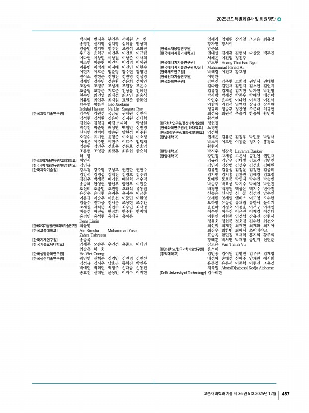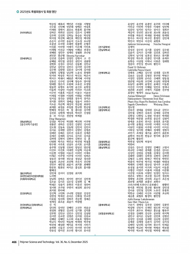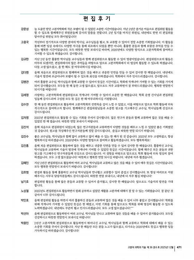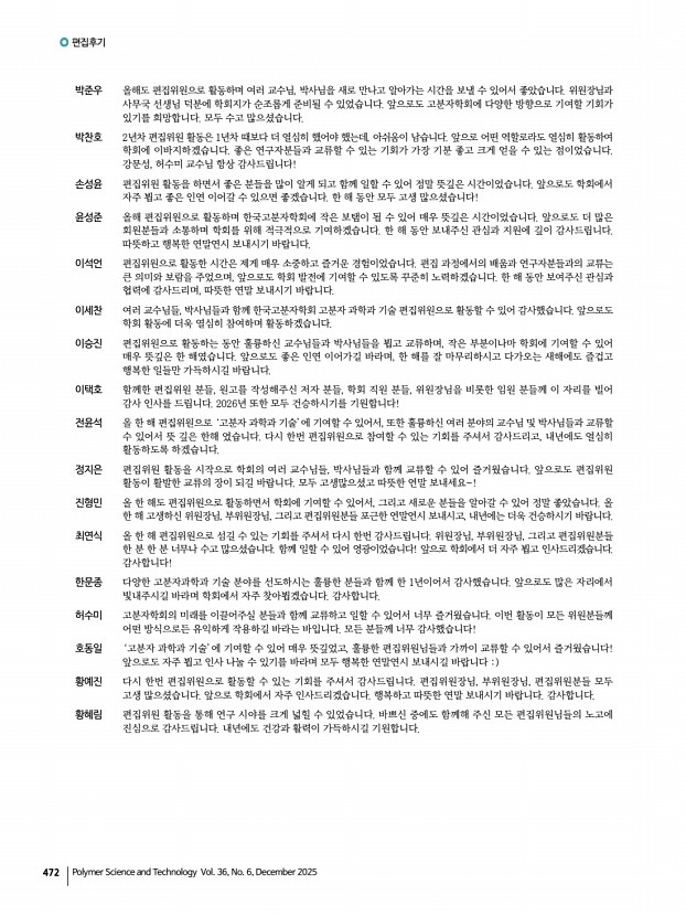 고분자 과학과 기술 제 36 권 6 호 2025년 12월 471 강문성 늘 도움만 받던 고분자학회에 작은 보탬이 될 수 있었던 소중한 시간이었습니다. 지난 2년간 즐거운 마음으로 편집위원 활동을 할 수 있도록 함께해주신 위원분들께 감사의 말씀을 전합니다. 2년 임기를 마치신 위원님, 내년에도 한번 더 편집위를 맡아주실 위원님 모두 화이팅입니다! 고종국 작년부터 정기적으로 다양한 분야의 박사님, 교수님들을 뵙고, 또 교류할 수 있어서 정말 소중한 기회였습니다. 이 활동을 통해 바쁜 일상 속에서도 다양한 자극을 통해 리프레시 되었을 뿐만 아니라, 훌륭한 분들과 함께 보람찬 추억을 만들 수 있는 행복한 시간이었습니다. 모두 따뜻한 연말 보내시길 바라며, 2026년에도 다양한 방식으로 고분자학회에 참여하고 기여할 수 있도록 하겠습니다. 감사합니다. 김...