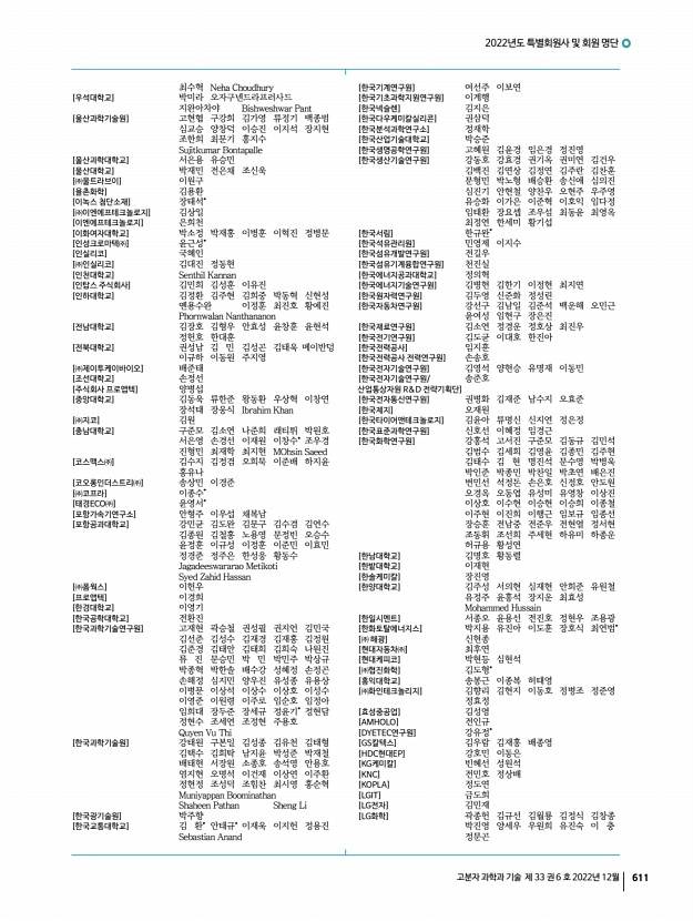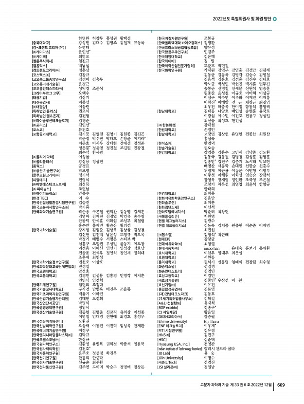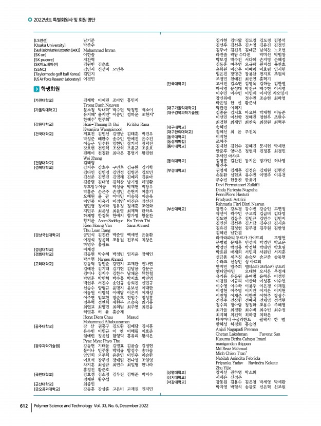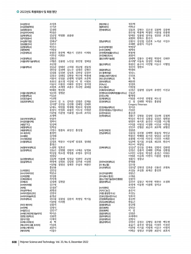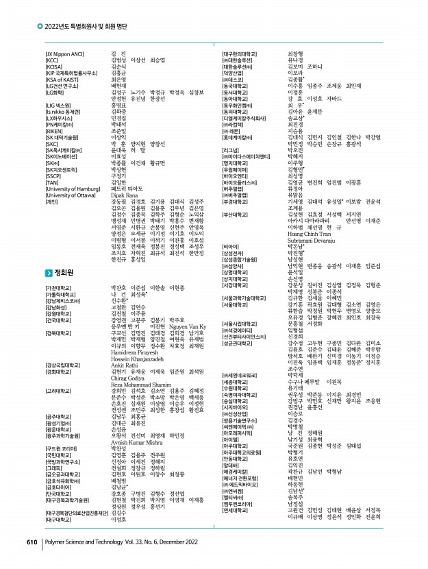 ...원 명단 608 Polymer Science and Technology Vol. 33, No. 6, December 2022 [㈜삼양사] 조성호 [㈜삼양알앤피] 신기준 [삼양화성㈜] 김경원 [㈜삼우티씨씨] 박상순 [삼육대학교] 김남정 박명환 최종완 [삼익정공㈜] 진문영 [㈜삼화기업] 강태규* [상공물산㈜] 김준수 [상명대학교] 박진수 [새한화학] 이범상 [서강대학교] 문봉진 문준혁 백운기 신관우 이재욱 이후성 이희우 [서경대학교] 김환건 [서울과학기술대학교] 구형준 김용범 노인섭 류민영 정택상 조은범 [서울대학교] 강승균 강태진 고석원 곽승엽 권동일 권민상 김경택 김노수 김대진 김병수 김상용 김성련 김성호 김연상 김장주 김창규 김태일 김현중 박수영 박종래 서용석 선정윤 손병혁 안철희 오준학 유효선 윤도영 이강원 이 연 이원보 이윤식 이종찬 이태우 장정식 장지영 조원호 조재영 조종수 차국헌 최태림 ...