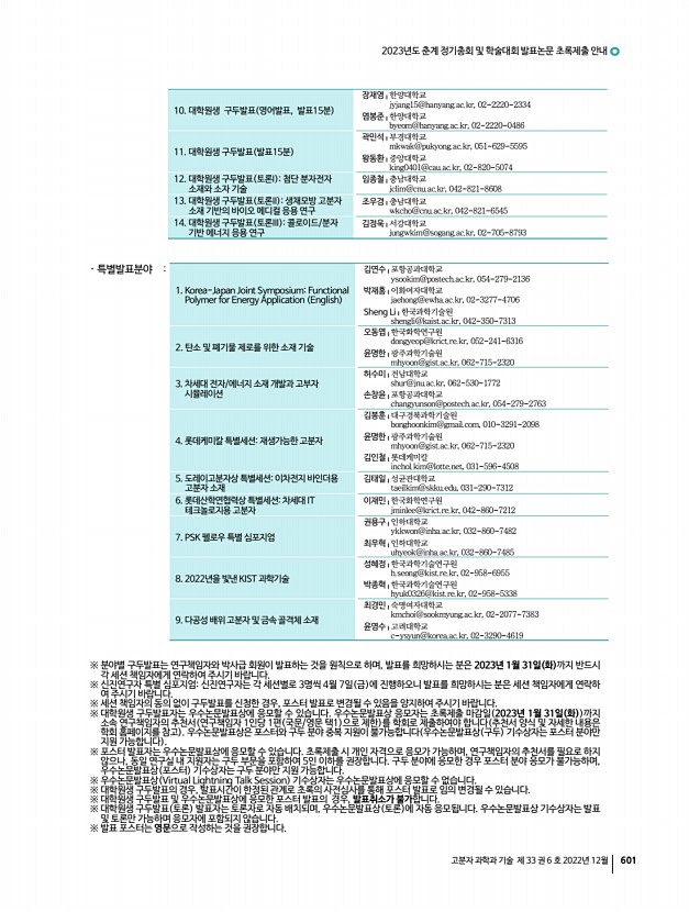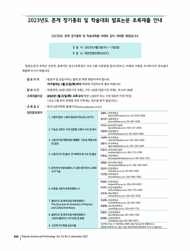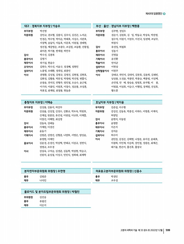 제40대 임원명단 고분자 과학과 기술 제 33 권 6 호 2022년 12월 599 대구ㆍ경북지부 지부장 | 이승우 부산ㆍ울산ㆍ경남지부 지부장 | 백현종 부지부장 자문위원 감사 총무이사 재무이사 조직이사 섭외이사 이사 박진영 강인규, 권오형, 김봉식, 김우식, 김진곤, 노석균, 민경은, 박수영, 박이순, 박태호, 서길수, 서관호, 서장혁, 송동익, 이동호, 이문호, 이원철, 장태현, 정진철, 제갈영순, 조광수, 조길원, 조동환, 진왕철, 최이준, 하기룡, 한세광, 허만우 박수진, 김종복 김영기 곽기섭, 한윤수 김연수, 박수진, 이윤구, 정경혜, 정현민 노용영, 오태환, 정대성, 최종민 권영환, 김성철, 김영규, 김영진, 김현철, 김현호, 김화정, 김황용, 박문정, 박영태, 박진영, 변홍식, 손창윤, 전석진, 안형주, 엄인철, 오승수, 윤근병, 이기라, 이용민, 이원호, 이창수, 정운룡, 조...