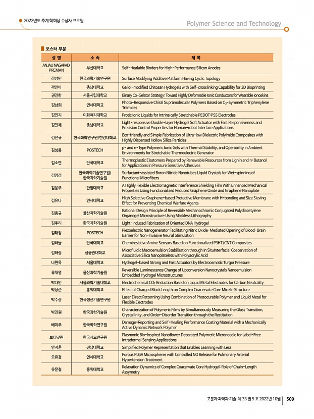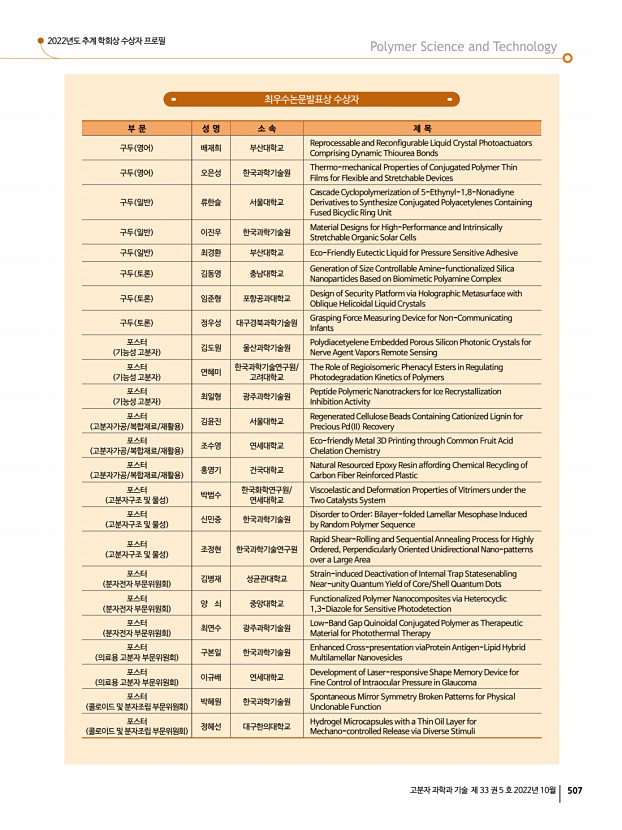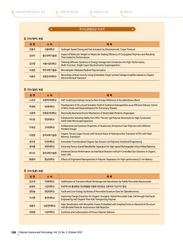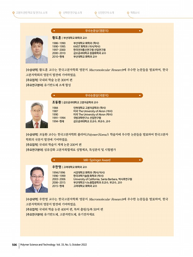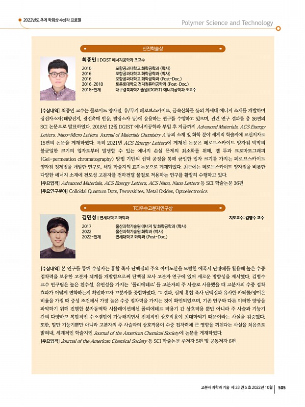 2022년도 추계 학회상 수상자 프로필 고분자 과학과 기술 제 33 권 5 호 2022년 10월 505 신진학술상 최종민|DGIST 에너지공학과 조교수 2010 포항공과대학교 화학공학과 학사 2016 포항공과대학교 화학공학과 박사 2016 포항공과대학교 화학공학과 Post-Doc. 2016-2018 토론토대학교 전자컴퓨터공학과 Post-Doc. 2018-현재 대구경북과학기술원 DGIST 에너지공학과 조교수 [수상내역] 최종민 교수는 콜로이드 양자점, 유/무기 페로브스카이트, 금속산화물 등의 차세대 에너지 소재를 개발하여 광전자소자 태양전지, 광전촉매 반응, 발광소자 등 에 응용하는 연구를 수행하고 있으며, 관련 연구 결과를 총 36편의 SCI 논문으로 발표하였다. 2018년 12월 DGIST 에너지공학과 부임 후 지금까지 Advanced Materials, ACS Energy Letters, Nano-Micro Letters, Journal of Materials Chemistry A 등의 소재 및 화학 분...