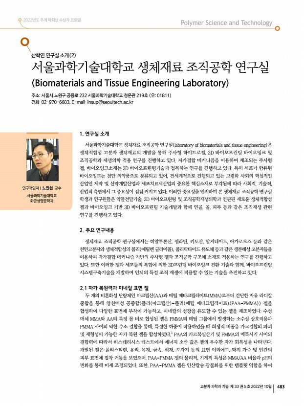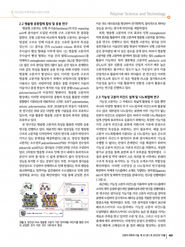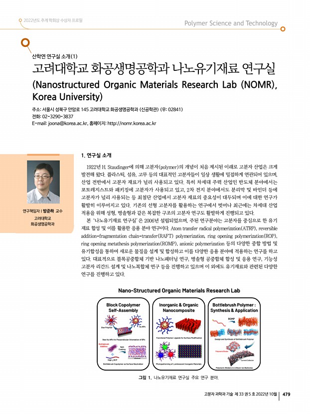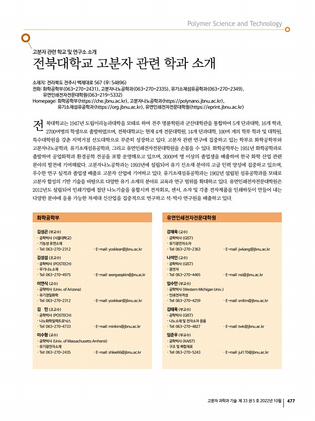 고분자 과학과 기술 제 33 권 5 호 2022년 10월 477 고분자 관련 학교 및 연구소 소개 전북대학교 고분자 관련 학과 소개 소재지전라북도 전주시 백제대로 567 우54896 전화화학공학부 063-270-2431 , 고분자나노공학과 063-270-2335 , 유기소재섬유공학과 063-270-2349 , 유연인쇄전자전문대학원 063-219-5332 Homepage화학공학부 https//che.jbnu.ac.kr , 고분자나노공학과 https//polynano.jbnu.ac.kr , 유기소재섬유공학과 https//org.jbnu.ac.kr , 유연인쇄전자전문대학원 https//eprint.jbnu.ac.kr 북대학교는 1947년 도립이리농과대학을 모태로 하여 전주 명륜학원과 군산대학관을 통합하여 5개 단과대학, 16개 학과, 2700여명의 학생으로 출발하였으며, 전북대학교는 현재 4개 전문대학원, 14개 단과대학, 100여 개의 학부 학과 및 대학원, 특수대학원을 갖춘 지역거점 선도대학으로 꾸준히 성장하고 있다. 고...