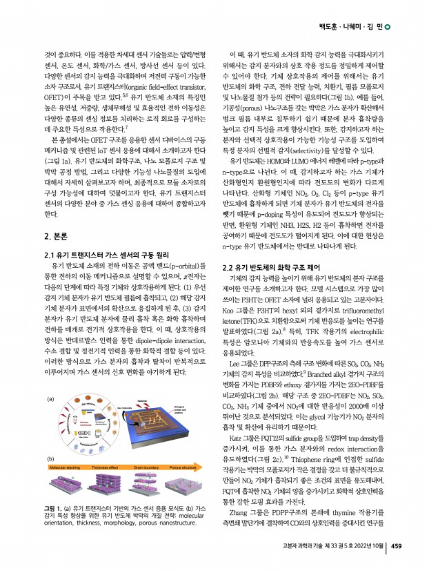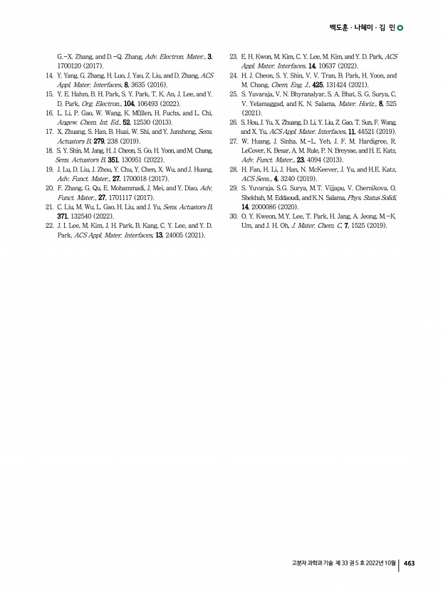 백도훈ㆍ나혜미ㆍ김 민 고분자 과학과 기술 제 33 권 5 호 2022년 10월 463 G.-X. Zhang, and D.-Q. Zhang, Adv. Electron. Mater., 3, 1700120 2017 14. Y. Yang, G. Zhang, H. Luo, J. Yao, Z. Liu, and D. Zhang, ACS Appl. Mater. Interfaces, 8, 3635 2016 15. Y. E. Hahm, B. H. Park, S. Y. Park, T. K. An, J. Lee, and Y. D. Park, Org. Electron., 104, 106493 2022 16. L. Li, P. Gao, W. Wang, K. M llen, H. Fuchs, and L. Chi, Angew. Chem. Int. Ed., 52, 12530 2013 17. X. Zhuang, S. Han, B. Huai, W. Shi, and Y. Junsheng, Sens. Actuators B, 279, 238 2019 18. S. Y. Shin, M. Jang, H. J. Cheon, S. Go, H. Yoon, and M. Chang, Sens. Actuators B, 351, 130951 2022 19. J. Lu, D. Liu, J. Zhou, Y. Chu, Y. Chen, X. Wu, and J. Huang, Adv. Funct. Mater., 27, 1700018 2017 20. F. Zhang, G. Qu, E. Mohammadi, J. Mei, and Y. Diao, Adv. Funct. Mater., 27, 1701117 2017 21. C. Liu, M. Wu, L. Gao, H. Liu, and J. Yu, Sens. Actuators B, 371, 132540 2022 22. J. I. Lee, M. Kim, J. H. Park, B. Kang, C. Y. Lee, a...