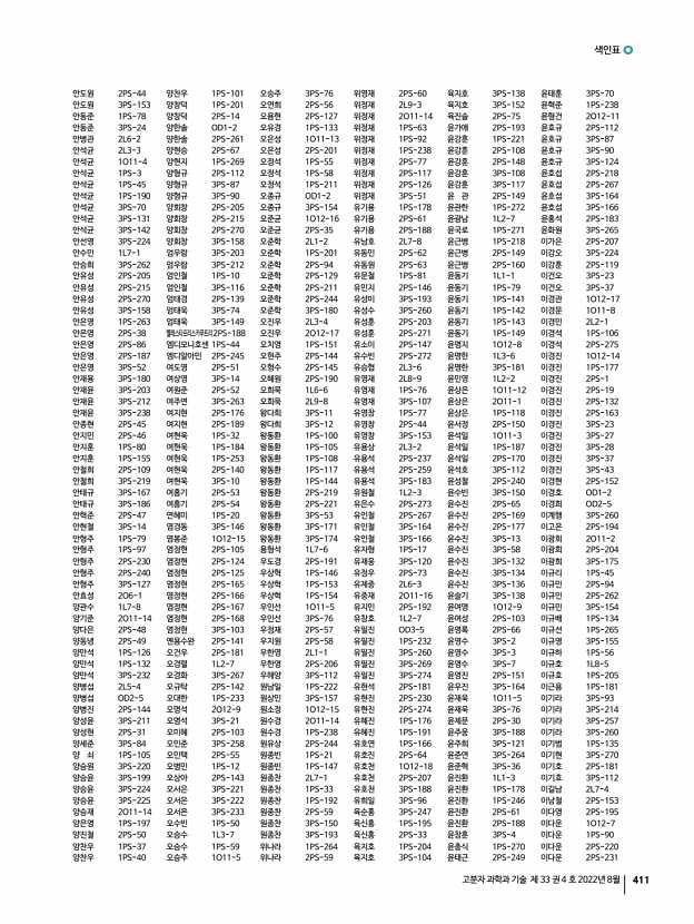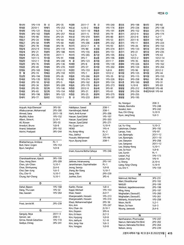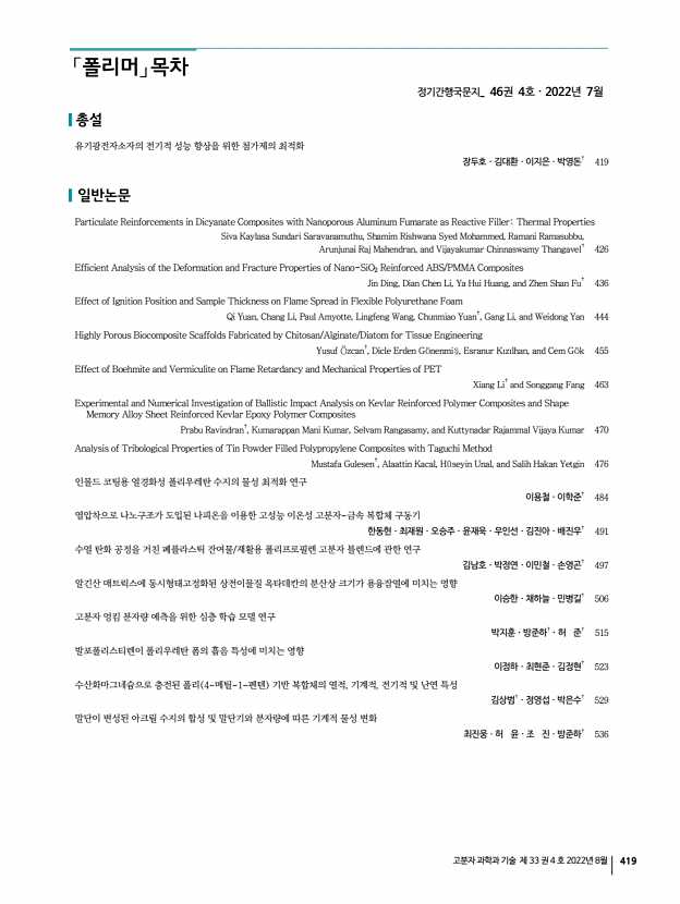 고분자 과학과 기술 제 33 권 4 호 2022년 8월 419 총설 유기광전자소자의 전기적 성능 향상을 위한 첨가제의 최적화 장두호ㆍ김대환ㆍ이지은ㆍ박영돈† 419 일반논문 Particulate Reinforcements in Dicyanate Composites with Nanoporous Aluminum Fumarate as Reactive FillerThermal Properties Siva Kaylasa Sundari Saravanamuthu, Shamim Rishwana Syed Mohammed, Ramani Ramasubbu, Arunjunai Raj Mahendran, and Vijayakumar Chinnaswamy Thangavel† 426 Efficient Analysis of the Deformation and Fracture Properties of Nano-SiO2 Reinforced ABS/PMMA Composites Jin Ding, Dian Chen Li, Ya Hui Huang, and Zhen Shan Fu† 436 Effect of Ignition Position and Sample Thickness on Flame Spread in Flexible Polyurethane Foam Qi Yuan, Chang Li, Paul Amyotte, Lingfeng Wang, Chunmiao Yuan†, Gang Li, and Weidong Yan 444 Highly Porous Biocomposite Scaffolds Fabricated by Chitosan/Alginate/Diatom for Tissue Engineering Yusuf zcan†, Dicle Erden G nenmi , Esranur Kız...