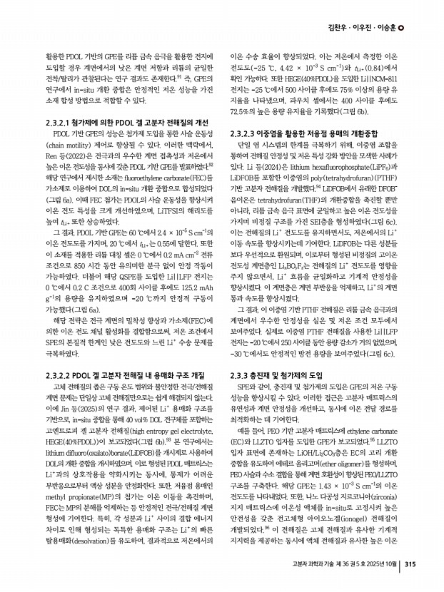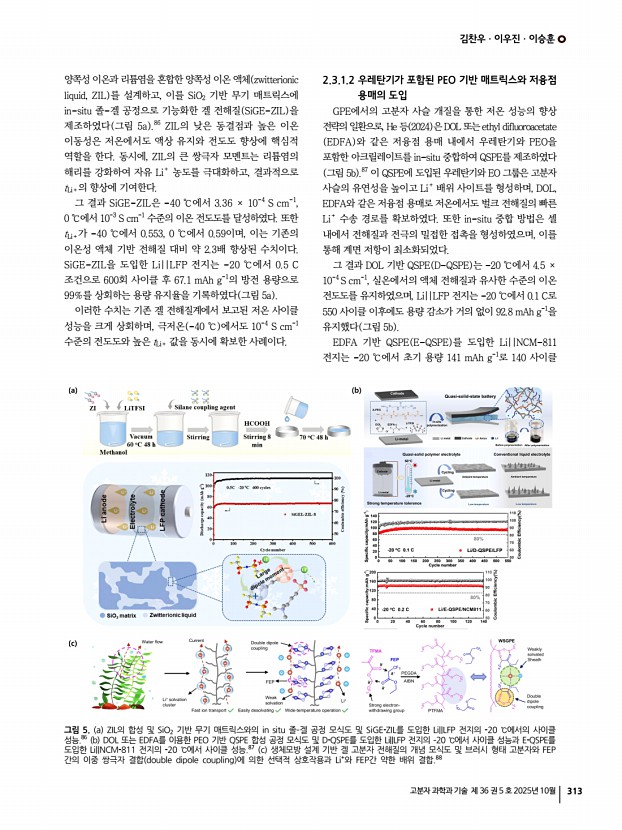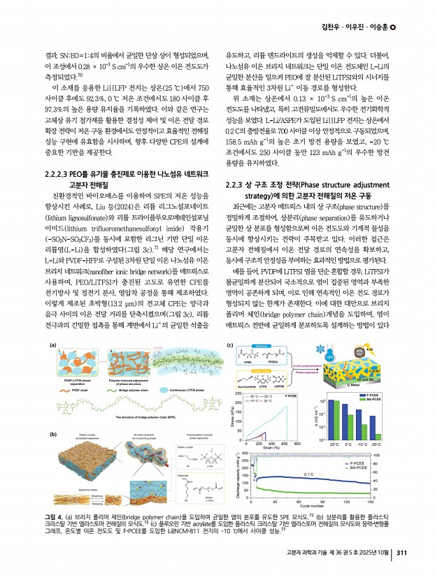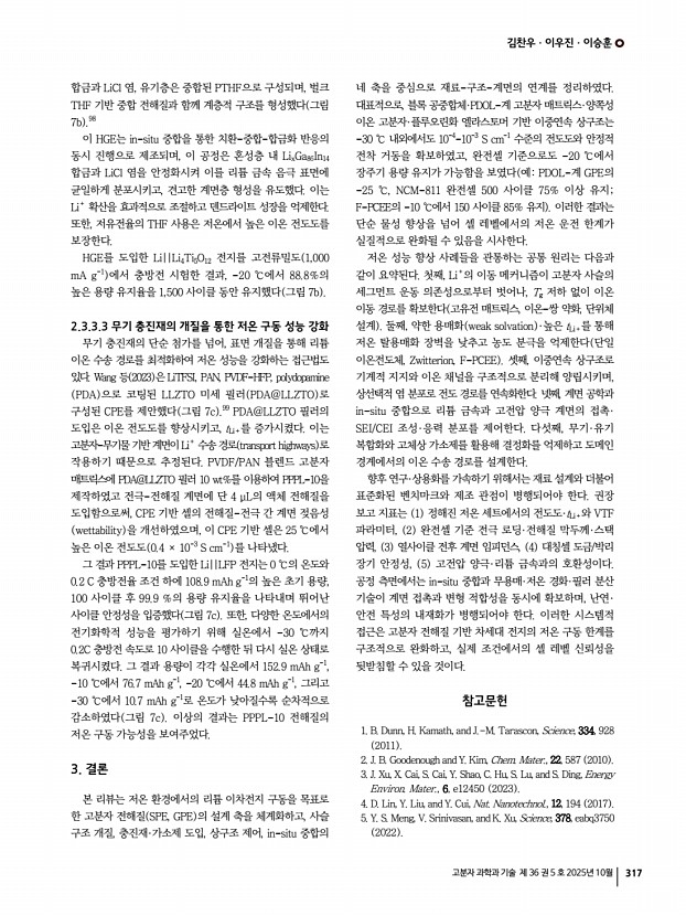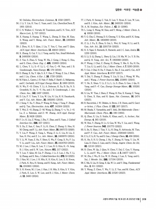 김찬우ㆍ이우진ㆍ이승훈 고분자 과학과 기술 제 36 권 5 호 2025년 10월 319 M. Osi ska, Electrochem. Commun., 9, 1558 2007 56. J. Li, Y. Lin, H. Yao, C. Yuan, and J. Liu, ChemSusChem, 7, 1901 2014 57. C. N. Walker, C. Versek, M. Touminen, and G. N. Tew, ACS Macro Lett., 1, 737 2012 58. X. Huang, S. Huang, T. Wang, L. Zhong, D. Han, M. Xiao, S. Wang, and Y. Meng, Adv. Funct. Mater., 33, 2300683 2023 59. J. Zhou, H. Ji, Y. Qian, J. Liu, T. Yan, C. Yan, and T. Qian, ACS Appl. Mater. Interfaces, 13, 48810 2021 60. X. Zhang, X. Cui, Y. Li, J. Yang, and Q. Pan, Small Methods, 8, 2400356 2024 61. Z. Yao, S. Zhao, S. Yang, W. Ma, J. Gong, J. Rong, G. Hou, and S. Chen, Chem. Eng. J., 495, 153005 2024 62. L. Chen, Y. Li, S.-P. Li, L.-Z. Fan, C.-W. Nan, and J. B. Goodenough, Nano Energy, 46, 176 2018 63. D. Zhang, X. Xu, Y. Qin, S. Ji, Y. Huo, Z. Wang, Z. Liu, J. Shen, and J. Liu, Chem. A Eur. J., 26, 1720 2020 64. M. Falco, L. Castro, J. R. Nair, F. Bella, F. Bard , G. Meligr...