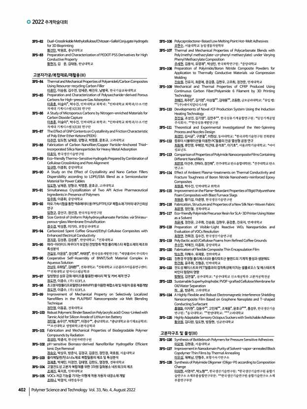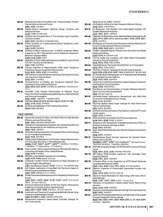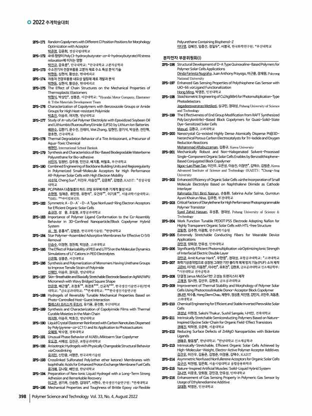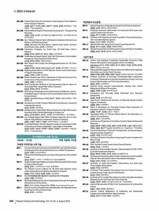 ...ansistors via Structural Optimization of Polymer Semiconductors 유성훈, Syed Zahid Hassan, 이상준, 임보규*, 정대성, 포항공과대학교; *한국 화학연구원 2PS-272 Development of Hole Transport Materials Using Methoxy-containing Imidazole Derivatives 유수빈, 박상혁, 공주대학교 2PS-273 Acetates Series-Diethyl Ether Mixed Antisolvent for High-Performance Perovskite Solar Cell and Morphology in Ambient Air 유은수, 김도형, 홍승우, 김선주*, 서지연*, 한국과학영재학교; *부산대학교 2PS-274 Low-Voltage Organic Field-Effect Transistors Using Sub-50-nm-thick Polymer Gate Dielectrics Prepared by Solution Processing 유현진, 조웅현*, 강범구*, 이병훈, 이화여자대학교; *숭실대학교 2PS-275 A new Naphthalene-Diimide-Based D-A polymer Containing a Similar Linker group for Photomultiplication-Type Organic Photodiode 이경석, 이상준*, 강민균*, 하연희**, 정대성*, 김윤희**, 경상대학교; *포항공과 대학...
