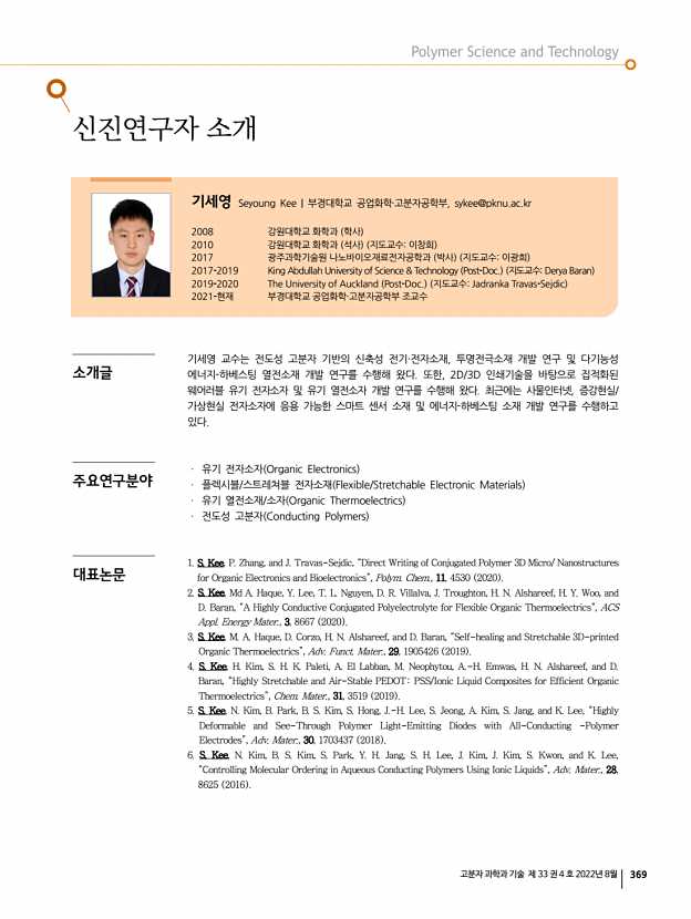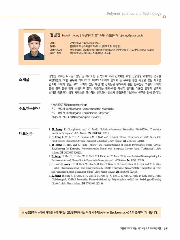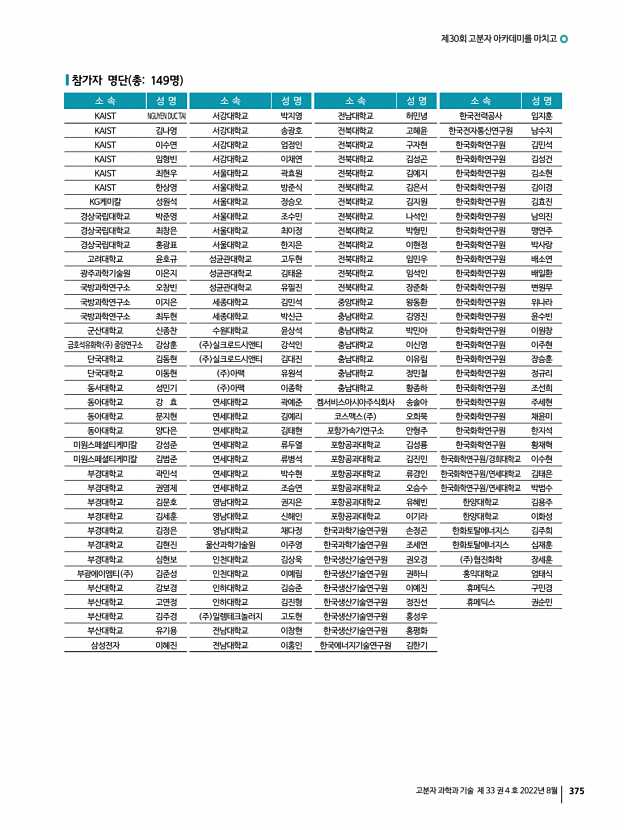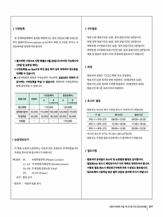 고분자 과학과 기술 제 33 권 4 호 2022년 8월 377 | 사전등록 본 추계학술대회에 참석을 희망하시는 분은 2022년 9월 16일 금 까지 홈페이지 www.polymer.or.kr 에서 회원 로그인을 하시고 사 전등록비를 납입하시면 됩니다. 불가피한 사정으로 인한 환불은 9월 28일 수 까지만 가능합니다 주말 및 공휴일 제외 사전등록을 on-line으로 하신 분은 회비 납부 내역에서 영수증을 인쇄할 수 있습니다. ◆고분자학회의 회원만 사전등록이 가능하며, 2022년도 연회비 미 납시에는 사전등록을 하실 수 없습니다. 연회비와 사전등록비는 함께 납부하실 수 있습니다. 회원구분 연회비 사전등록비 현장등록비 A B 1년연회비면제 A B 1년연회비면제 종신회원 110,000 120,000 정회원 일반 50,000 110,000 160,000 120,000 170,000 학생회원 30,000 50,000 80,000 60,000 90,000 비회원 170,000 | 논문정보보기 · 각 발...