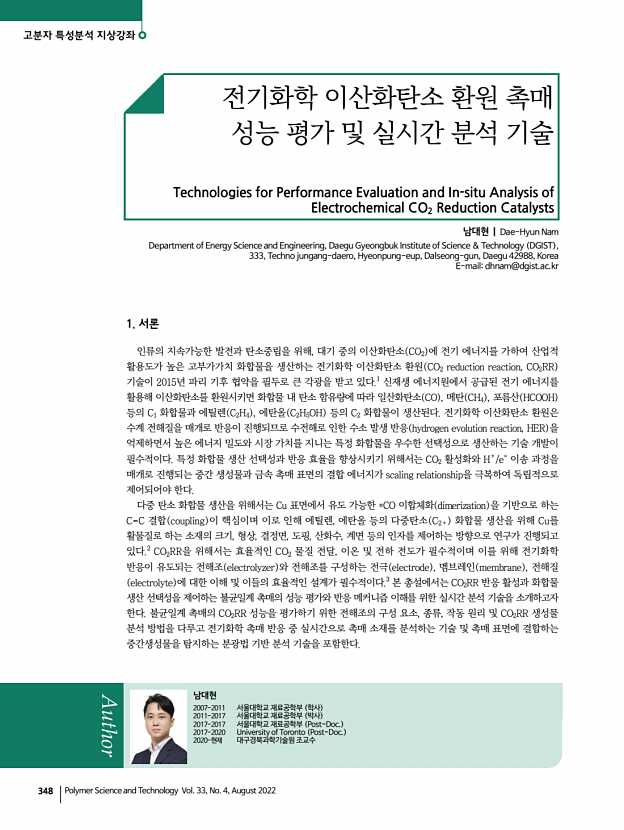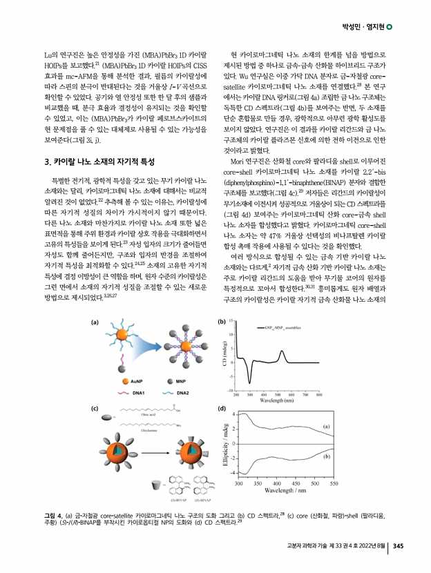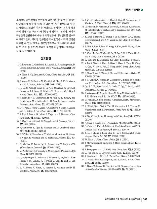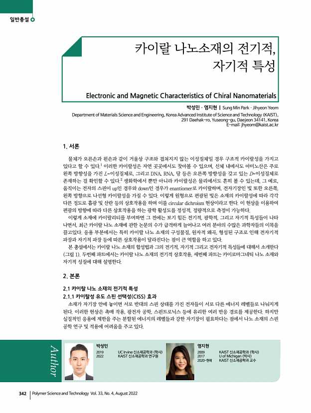 박성민ㆍ염지현 고분자 과학과 기술 제 33 권 4 호 2022년 8월 347 소재여도 카이랄성을 부여하게 되면 제어할 수 있는 성질이 다양해지기 때문에 더욱 폭넓은 연구가 진행되고 있다. 체계적으로 정립된 이론을 바탕으로 실제적인 응용에 적용 하기 위해서는 구조적 카이랄성과 광학적, 전기적, 자기적 특성들의 상관관계에 대한 체계적 연구가 더욱 필요할 것으로 여겨지고 있다. 이러한 연구들은 카이랄성을 소재의 성질을 제어할 수 있는 새로운 접근방법으로서 디스플레이, 촉매, 제약, 의료 등 전반적 분야의 도약을 가능케하는 디딤돌이 될 것으로 기대된다. 참고문헌 1. G. Lebreton, C. G minard, F. Lapraz, S. Pyrpassopoulos, D. Cerezo, P. Sp der, E. Ostap, and S. Noselli, Science, 362, 949 2018 2. X. Zhao, S.-Q. Zang, and X. Chen, Chem. Soc. Rev., 49, 2481 2020 3. J. Yeom, U. S. Santos, M. Chekini, M. Cha, A....