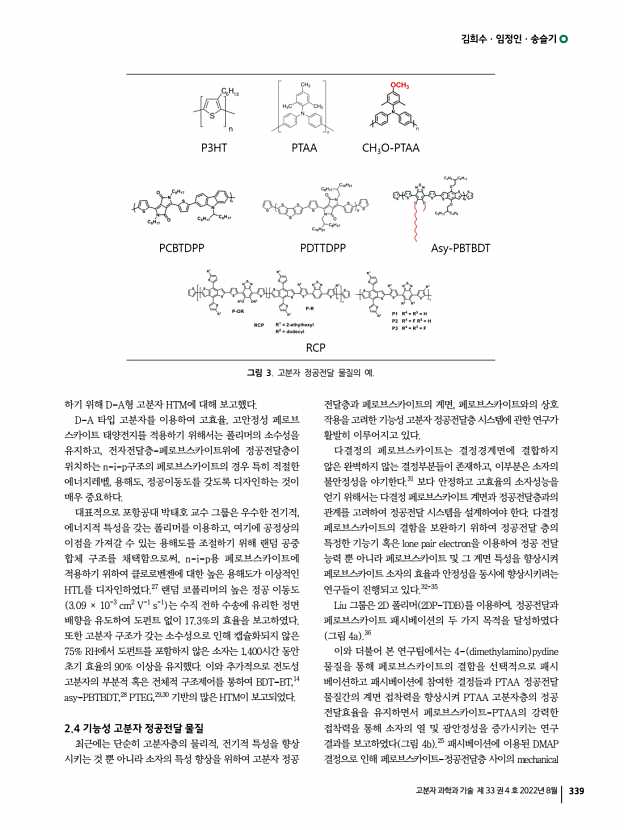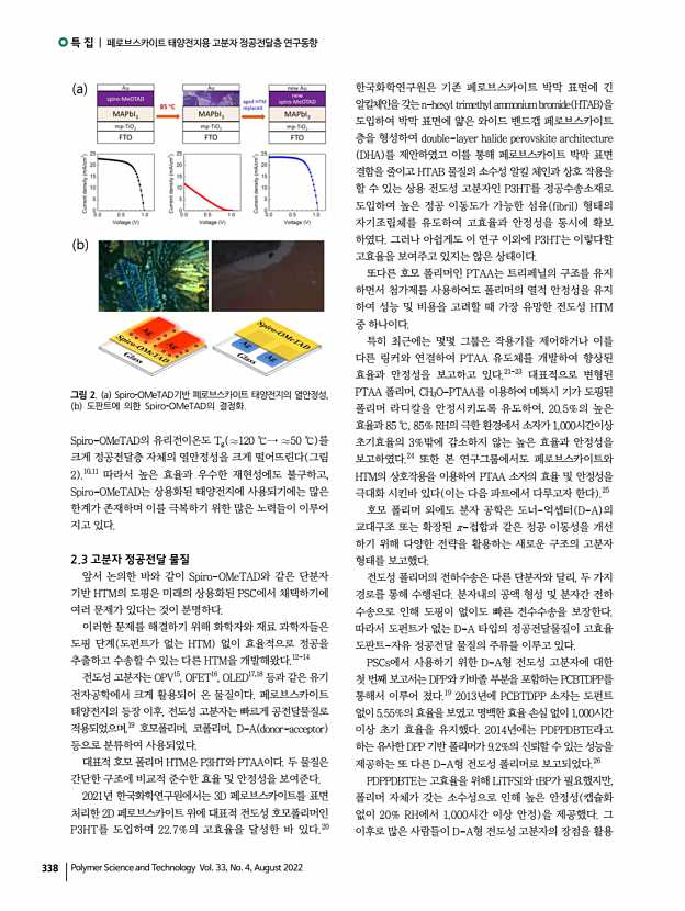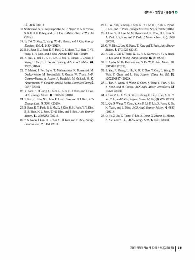 김희수ㆍ임정인ㆍ송슬기 고분자 과학과 기술 제 33 권 4 호 2022년 8월 341 12, 2036 2011 18. Shahnawaz, S. S. Swayamprabha, M. R. Nagar, R. A. K. Yadav, S. Gull, D. K. Dubey, and J.-H. Jou, J. Mater. Chem. C, 7, 7144 2019 19. B. Cai, Y. Xing, Z. Yang, W.-H. Zhang, and J. Qiu, Energy Environ. Sci., 6, 1480 2013 20. E. H. Jung, N. J. Jeon, E. Y. Park, C. S. Moon, T. J. Shin, T.-Y. Yang, J. H. Noh, and J. Seo, Nature, 567, 511 2019 21. Z. Zhu, Y. Bai, H. K. H. Lee, C. Mu, T. Zhang, L. Zhang, J. Wang, H. Yan, S. K. So, and S. Yang, Adv. Funct. Mater., 24, 7357 2014 22. T. Matsui, I. Petrikyte, T. Malinauskas, K. Domanski, M. Daskeviciene, M. Steponaitis, P. Gratia, W. Tress, J.-P. Correa-Baena, A. Abate, A. Hagfeldt, M. Gr tzel, M. K. Nazeeruddin, V. Getautis, and M. Saliba, ChemSusChem, 9, 2567 2016 23. Y. Kim, E. H. Jung, G. Kim, D. Kim, B. J. Kim, and J. Seo, Adv. Energy Mater., 8, 1801668 2018 24. Y. Kim, G. Kim, N. J. Jeon, C. Lim, J. Seo, and B. J. Kim, ACS Energy...