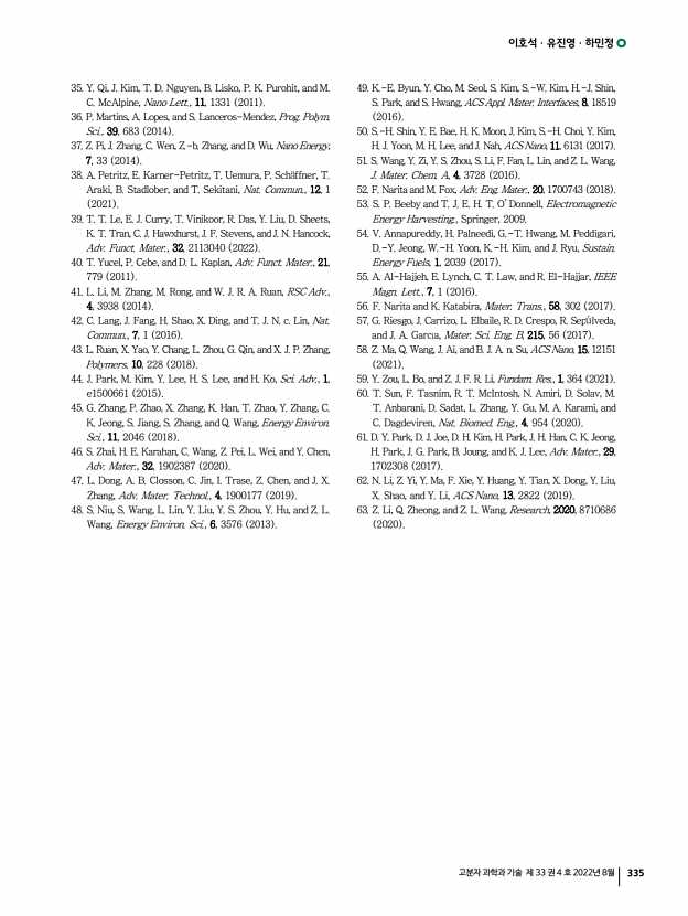 이호석ㆍ유진영ㆍ하민정 고분자 과학과 기술 제 33 권 4 호 2022년 8월 335 35. Y. Qi, J. Kim, T. D. Nguyen, B. Lisko, P. K. Purohit, and M. C. McAlpine, Nano Lett., 11, 1331 2011 36. P. Martins, A. Lopes, and S. Lanceros-Mendez, Prog. Polym. Sci., 39, 683 2014 37. Z. Pi, J. Zhang, C. Wen, Z.-b. Zhang, and D. Wu, Nano Energy, 7, 33 2014 38. A. Petritz, E. Karner-Petritz, T. Uemura, P. Sch ffner, T. Araki, B. Stadlober, and T. Sekitani, Nat. Commun., 12, 1 2021 39. T. T. Le, E. J. Curry, T. Vinikoor, R. Das, Y. Liu, D. Sheets, K. T. Tran, C. J. Hawxhurst, J. F. Stevens, and J. N. Hancock, Adv. Funct. Mater., 32, 2113040 2022 40. T. Yucel, P. Cebe, and D. L. Kaplan, Adv. Funct. Mater., 21, 779 2011 41. L. Li, M. Zhang, M. Rong, and W. J. R. A. Ruan, RSC Adv., 4, 3938 2014 42. C. Lang, J. Fang, H. Shao, X. Ding, and T. J. N. c. Lin, Nat. Commun., 7, 1 2016 43. L. Ruan, X. Yao, Y. Chang, L. Zhou, G. Qin, and X. J. P. Zhang, Polymers, 10, 228 2018 44. J. Park, M. Kim, Y. ...