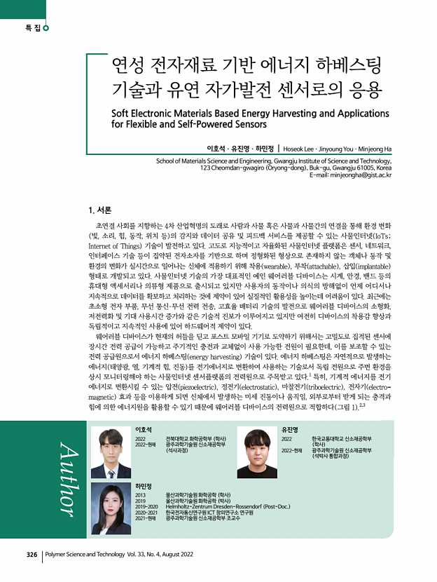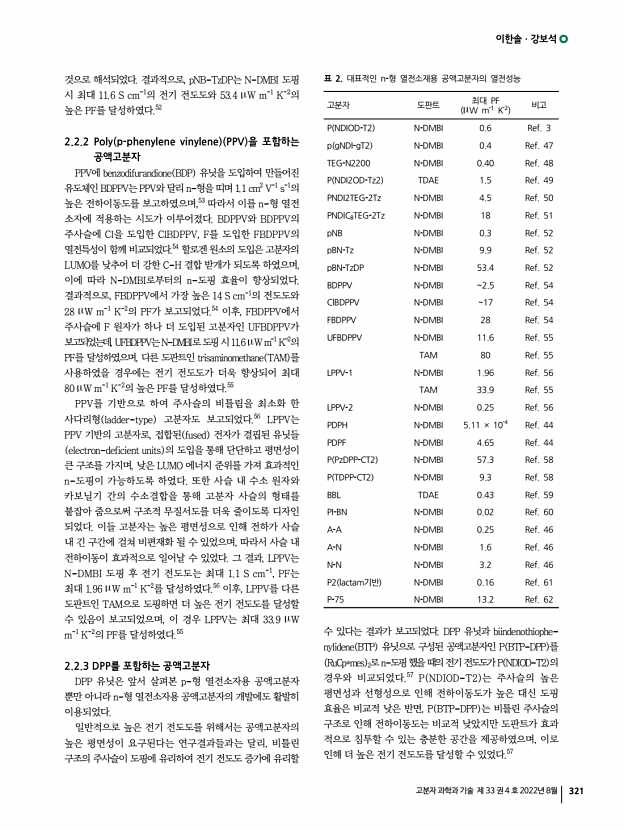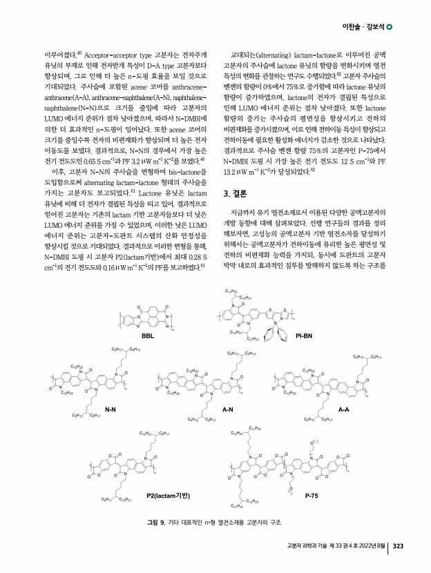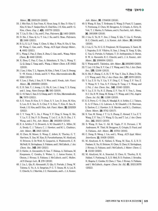 이한솔ㆍ강보석 고분자 과학과 기술 제 33 권 4 호 2022년 8월 325 Mater., 32, 2005129 2020 33. J. Min Han, S. Eun Yoon, K. Hyun Jung, O. Bae, D. Kim, U. Kim, H. Seo, F. Sunjoo Kim, K. Chul Kim, J. H. Kim, and B.-G. Kim, Chem. Eng. J., 431, 133779 2022 34. T. Liu, D. Xie, J. Xu, and C. Pan, Polymers, 12, 1463 2020 35. D. Xie, J. Xiao, Q. Li, T. Liu, J. Xu, and G. Shao, Polymers, 13, 2486 2021 36. B. Li, X. Li, F. Yang, Y. Chen, X. Mao, S. Wan, H. Xin, S. Yan, M. Wang, C. Gao, and L. Wang, ACS Appl. Energy Mater., 4, 4662 2021 37. L. Wang, C. Pan, Z. Chen, X. Zhou, C. Gao, and L. Wang, Polym. Chem., 9, 4440 2018 38. X. Zhou, C. Pan, C. Gao, A. Shinohara, X. Yin, L. Wang, Y. Li, Q. Jiang, C. Yang, and L. Wang, J. Mater. Chem. A, 7, 10422 2019 39. J. Lee, J. Kim, T. L. Nguyen, M. Kim, J. Park, Y. Lee, S. Hwang, Y.-W. Kwon, J. Kwak, and H. Y. Woo, Macromolecules, 51, 3360 2018 40. Y. Lee, J. Park, J. Son, H. Y. Woo, and J. Kwak, Adv. Funct. Mater., 31, 2006900 2020 41. E. H...