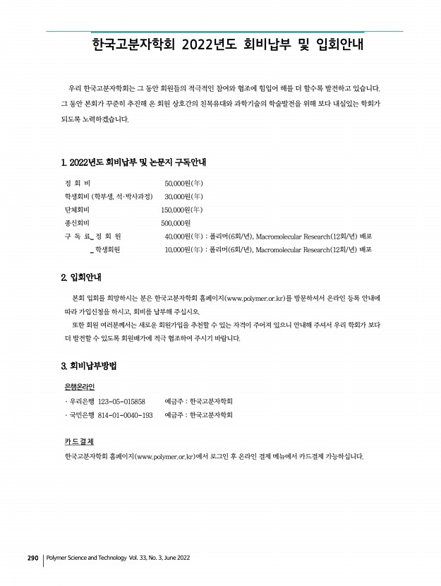 290 Polymer Science and Technology Vol. 33, No. 3, June 2022 우리 한국고분자학회는 그 동안 회원들의 적극적인 참여와 협조에 힘입어 해를 더 할수록 발전하고 있습니다. 그 동안 본회가 꾸준히 추진해 온 회원 상호간의 친목유대와 과학기술의 학술발전을 위해 보다 내실있는 학회가 되도록 노력하겠습니다. 1. 2022년도 회비납부 및 논문지 구독안내 정 회 비 50,000원 학생회비 학부생, 석·박사과정 30,000원 단체회비 150,000원 종신회비 500,000원 구 독 료_ 정 회 원 40,000원 :폴리머 6회/년 , Macromolecular Research 12회/년 배포 _ 학생회원 10,000원 :폴리머 6회/년 , Macromolecular Research 12회/년 배포 2. 입회안내 본회 입회를 희망하시는 분은 한국고분자학회 홈페이지 www.polymer.or.kr 를 방문하셔서 온라인 등록 안내에 따라 가입신청을 하시고, 회비를 납부해 주십시오. 또한 회원 여...
