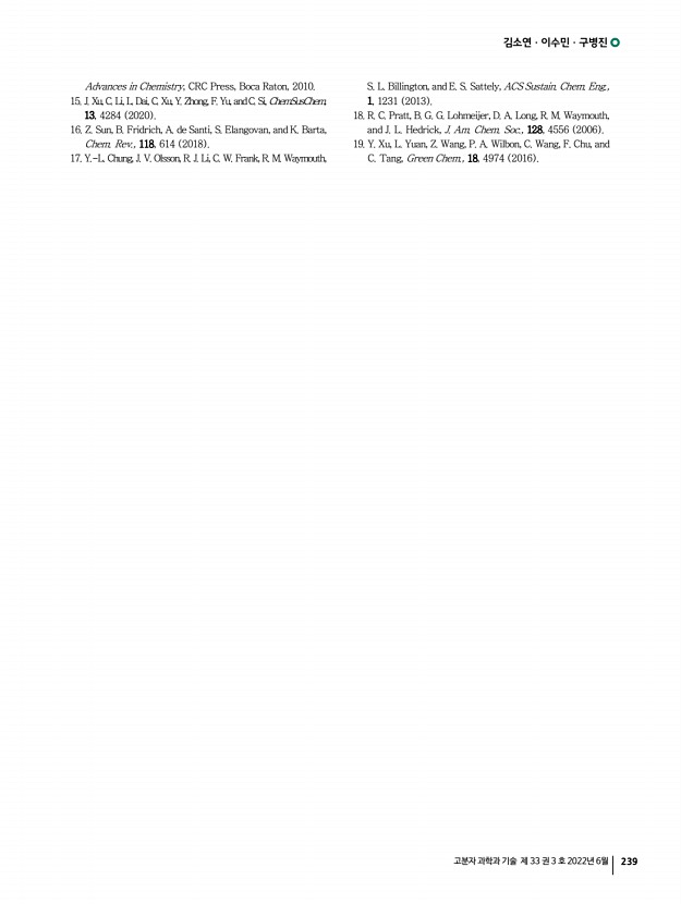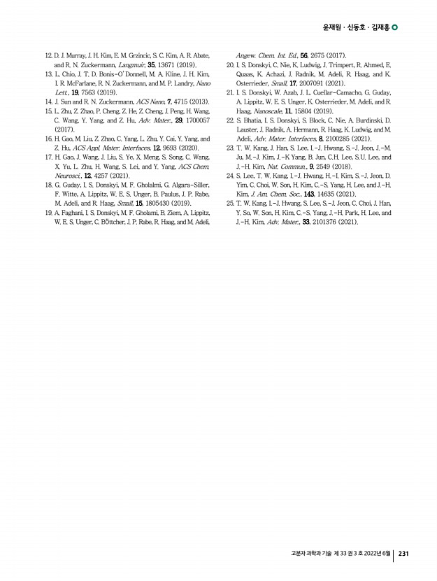 윤재원ㆍ신동호ㆍ김재홍 고분자 과학과 기술 제 33 권 3 호 2022년 6월 231 12. D. J. Murray, J. H. Kim, E. M. Grzincic, S. C. Kim, A. R. Abate, and R. N. Zuckermann, Langmuir, 35, 13671 2019 13. L. Chio, J. T. D. Bonis-O’Donnell, M. A. Kline, J. H. Kim, I. R. McFarlane, R. N. Zuckermann, and M. P. Landry, Nano Lett., 19, 7563 2019 14. J. Sun and R. N. Zuckermann, ACS Nano, 7, 4715 2013 15. L. Zhu, Z. Zhao, P. Cheng, Z. He, Z. Cheng, J. Peng, H. Wang, C. Wang, Y. Yang, and Z. Hu, Adv. Mater., 29, 1700057 2017 16. H. Gao, M. Liu, Z. Zhao, C. Yang, L. Zhu, Y. Cai, Y. Yang, and Z. Hu, ACS Appl. Mater. Interfaces, 12, 9693 2020 17. H. Gao, J. Wang, J. Liu, S. Ye, X. Meng, S. Song, C. Wang, X. Yu, L. Zhu, H. Wang, S. Lei, and Y. Yang, ACS Chem. Neurosci., 12, 4257 2021 18. G. Guday, I. S. Donskyi, M. F. Gholalmi, G. Algara-Siller, F. Witte, A. Lippitz, W. E. S. Unger, B. Paulus, J. P. Rabe, M. Adeli, and R. Haag, Small, 15, 1805430 2019 19. A. Faghani, I. S. Donskyi, M....