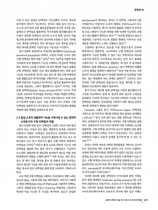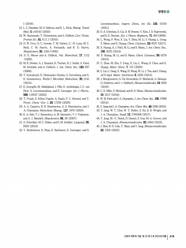 장영선 고분자 과학과 기술 제 33 권 3 호 2022년 6월 219 1 2018 21. L. C. Dunshee, M. O. Sullivan, and K. L. Kiick, Bioeng. Transl. Med., 5, e10145 2020 22. W. Hassouneh, T. Christensen, and A. Chilkoti, Curr. Protoc. Protein Sci., 61, 6.11.1 2010 23. D. W. Urry, D. C. Gowda, T. M. Parker, C.-H. Luan, M. C. Reid, C. M. Harris, A. Pattanaik, and R. D. Harris, Biopolymers, 32, 1243 1992 24. D. E. Meyer and A. Chilkoti, Nat. Biotechnol., 17, 1112 1999 25. M. R. Dreher, A. J. Simnick, K. Fischer, R. J. Smith, A. Patel, M. Schmidt, and A. Chilkoti, J. Am. Chem. Soc., 130, 687 2008 26. T. Kowalczyk, K. Hnatuszko-Konka, A. Gerszberg, and A. K. Kononowicz, World J. Microbiol. Biotechnol., 30, 2141 2014 27. E. Georgilis, M. Abdelghani, J. Pille, E. Aydinlioglu, J. C. van Hest, S. Lecommandoux, and E. Garanger, Int. J. Pharm., 586, 119537 2020 28. T. Frank, D. Kilian Vogele, A. Dupin, F. C. Simmel, and T. Pirzer, Chem.-Eur. J., 26, 17356 2020 29. A. A. Caparco, B. R. Bommarius, A. ...