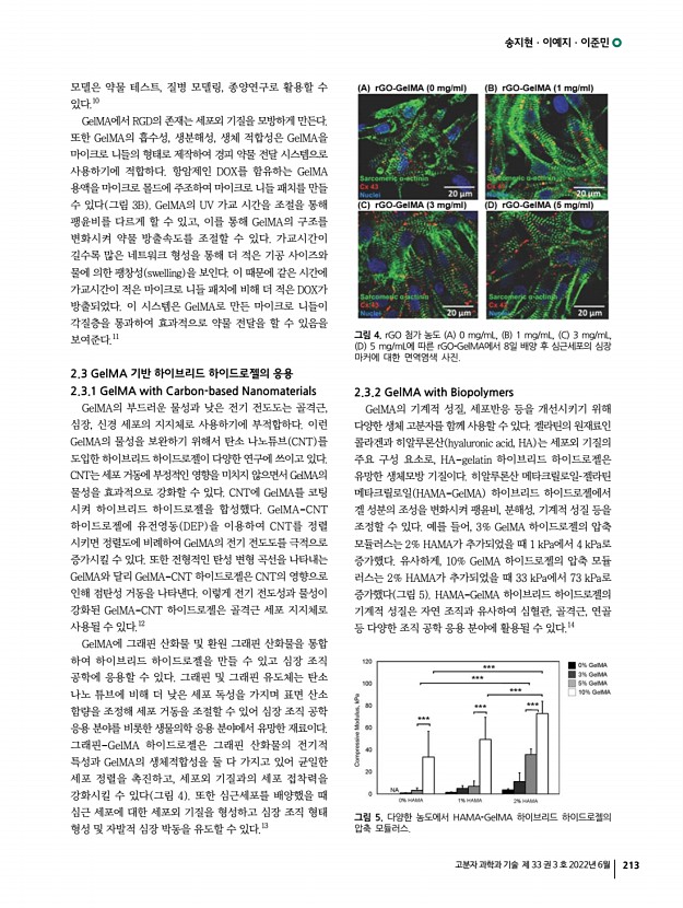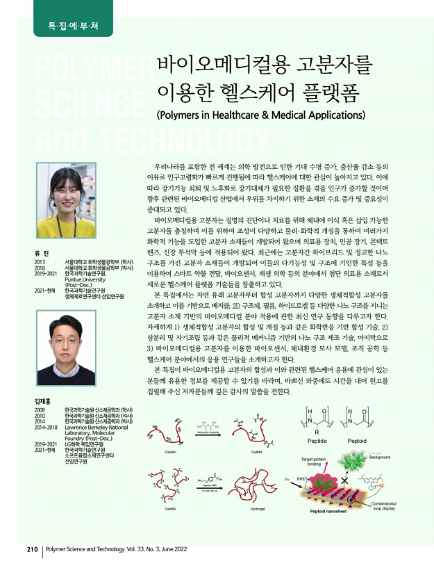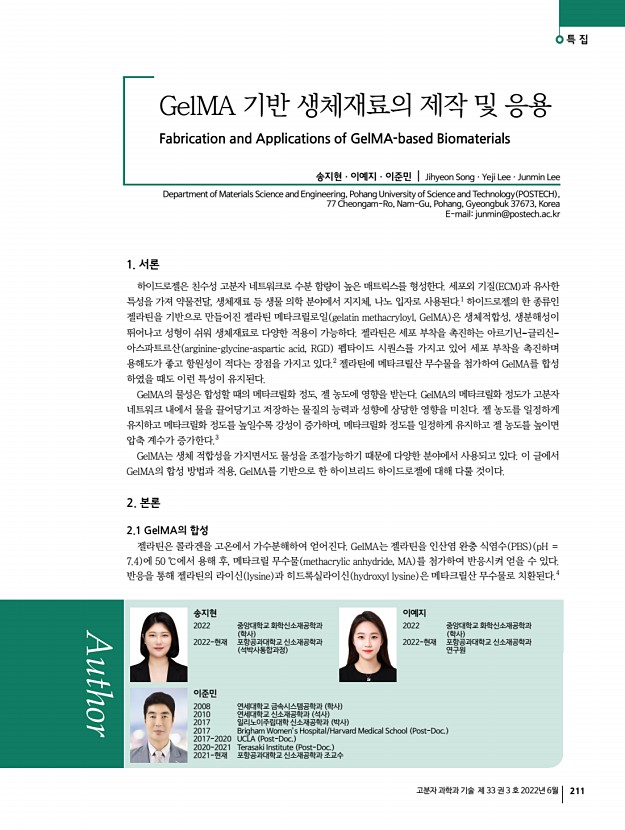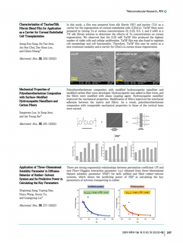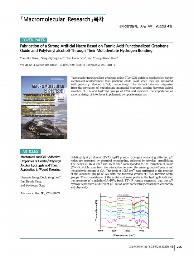 고분자 과학과 기술 제 33 권 2 호 2022년 4월 205 COVER PAPER Fabrication of a Strong Artificial Nacre Based on Tannic Acid-Functionalized Graphene Oxide and Poly vinyl alcohol Through Their Multidentate Hydrogen Bonding Yoo-Bin Kwon, Sang-Ryong Lee*, Tae Hoon Seo*, and Young-Kwan Kim* Vol. 30, No. 4, pp 279-284 2022 │APR 25, 2022│DOI 10.1007/s13233-022-0031-y ARTICLES Mechanical and Cell-Adhesive Properties of Gelatin/Polyvinyl Alcohol Hydrogels and Their Application in Wound Dressing Heeseok Jeong, Deuk Yong Lee*, Dae Hyeok Yang, and Yo-Seung Song Macromol. Res., 30, 223 2022 Gelatin/polyvinyl alcohol PVA g/P porous hydrogels containing different g/P ratios are prepared by chemical crosslinking, followed by physical crosslinking. The peaks at 1623 cm-1 and 1522 cm-1 corresponded to the formation of imine C=N , which came from the interaction between the amine groups of gelatin and the aldehyde groups of GA. The peak at 1086 cm-1 was attributed to the reaction of the al...