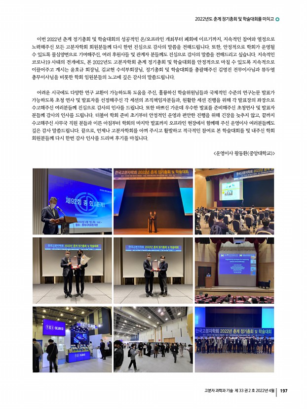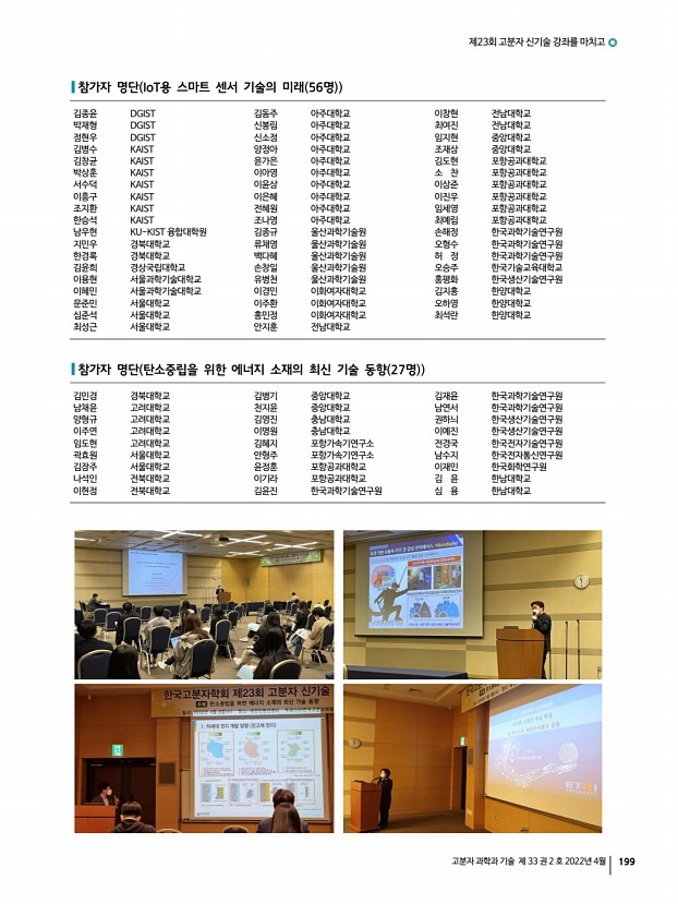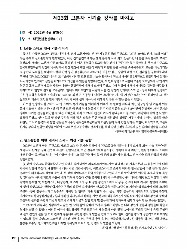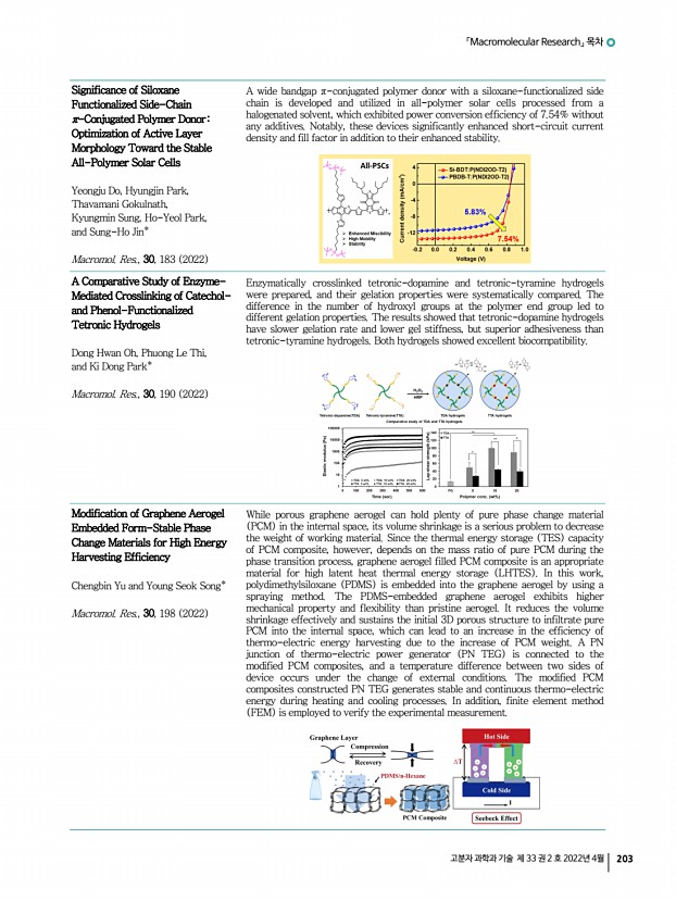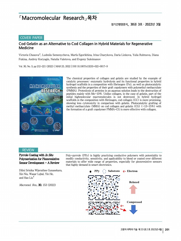 고분자 과학과 기술 제 33 권 2 호 2022년 4월 201 COVER PAPER Cod Gelatin as an Alternative to Cod Collagen in Hybrid Materials for Regenerative Medicine Victoria Chasova*, Ludmila Semenycheva, Marfa Egorikhina, Irina Charykova, Daria Linkova, Yulia Rubtsova, Diana Fukina, Andrey Koryagin, Natalia Valetova, and Evgeny Suleimanov Vol. 30, No. 3, pp 212-221 2022 │MAR 25, 2022│DOI 10.1007/s13233-022-0017-9 REVIEW Pyrrole Coating with In Situ Polymerization for Piezoresistive Sensor Development A Review Dilini Srinika Wijerathne Gunasekara, Xin Niu, Waqar Lqbal, Yin He, and Hao Liu* Macromol. Res., 30, 153 2022 Poly-pyrrole PPy is highly practicing conductive polymers with potentiality to modify conductivity, sensitivity, and applicability to blend or coated over different materials to offer wide range of properties, especially for piezoresistive sensors that highly demand in smart electronics. 「Macromolecular Research」목차 정기간행영문지_ 30권 3호 · 2022년 ...