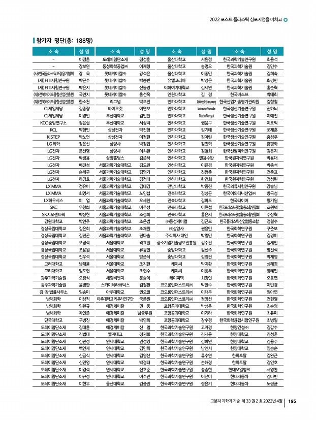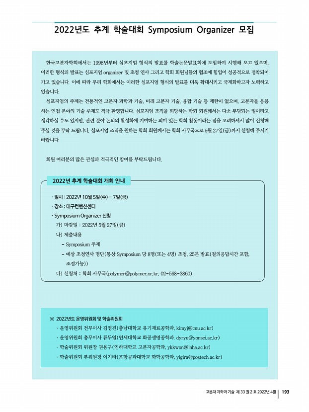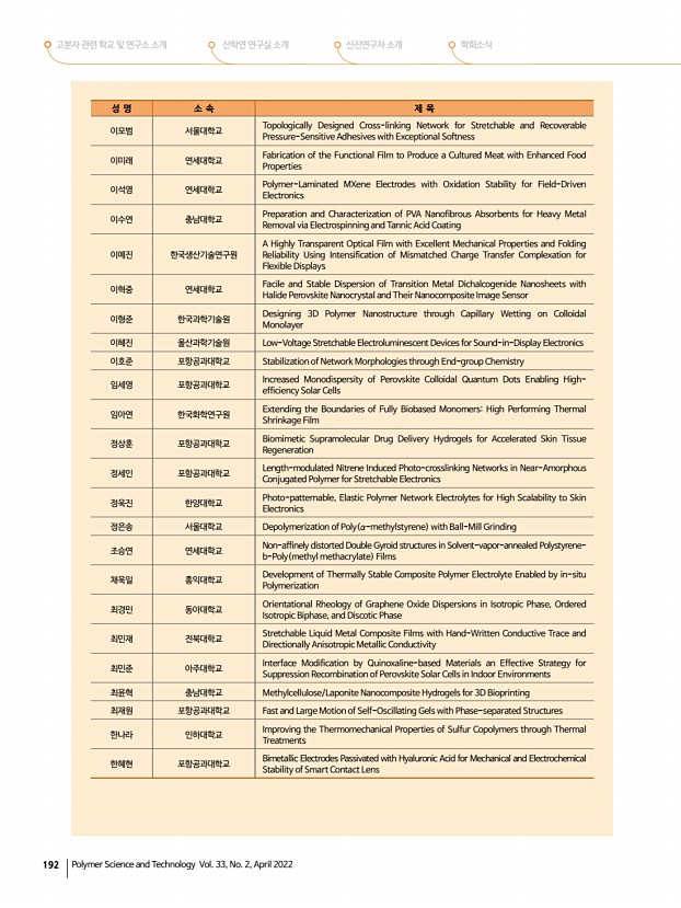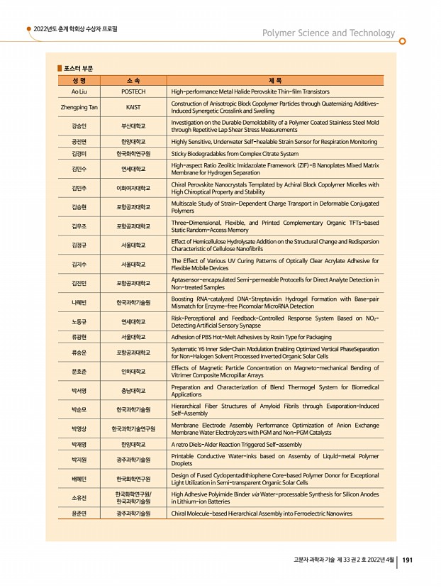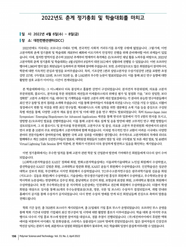 ... 대한 활발한 상호 교류가 이어지는 시간이 전개되었습니다. 본 학술대회에서는 그 어느때보다 더욱 풍성하고 훌륭한 강연이 구성되었습니다. 분자전자 부문위원회, 의료용 고분자 부문위원회, 콜로이드, 분자조립 부문 위원회의 세션들과 미세플라스틱의 위해성 평가 및 청정화 기술, “보다 정밀한, 보다 정확한” 고분자 소재분석 기술, 데이터 및 기계학습을 이용한 고분자 과학 세션 발표장에서는 각 분야의 유능한 연구자분들께서 최신 연구 동향 및 분석 결과를 소개해 주셨습니다. 이를 통해 참여자들이 자유롭게 의견을 나누는 시간을 가질 수 있었고, 더불어 청정에너지 변환 및 저장을 위한 최신 연구동향, 제로웨이스트 사회 실현을 위한 생분해성 소재 기술 등을 중심으로 구성된 특별 세션을 통해, 다양한 고분자 재료 물성 분석 및 이에 대한...