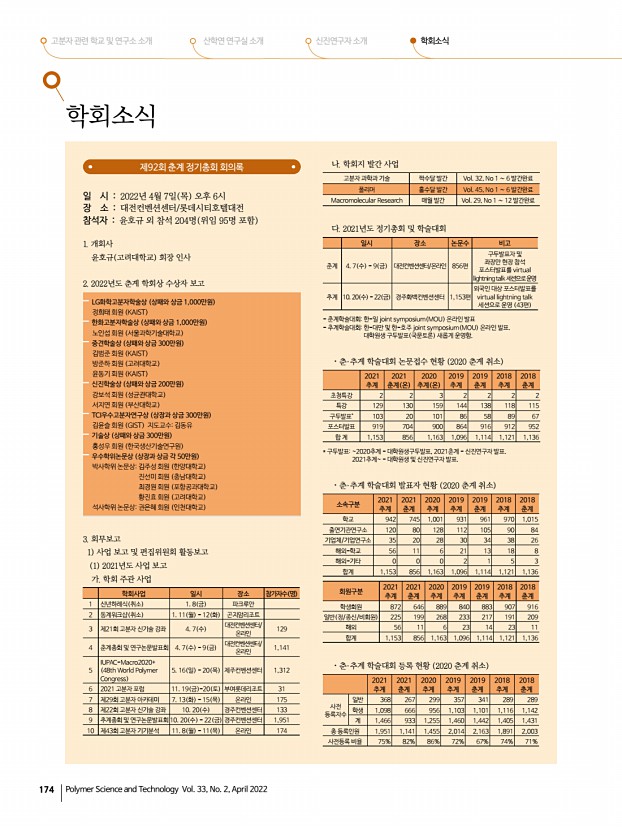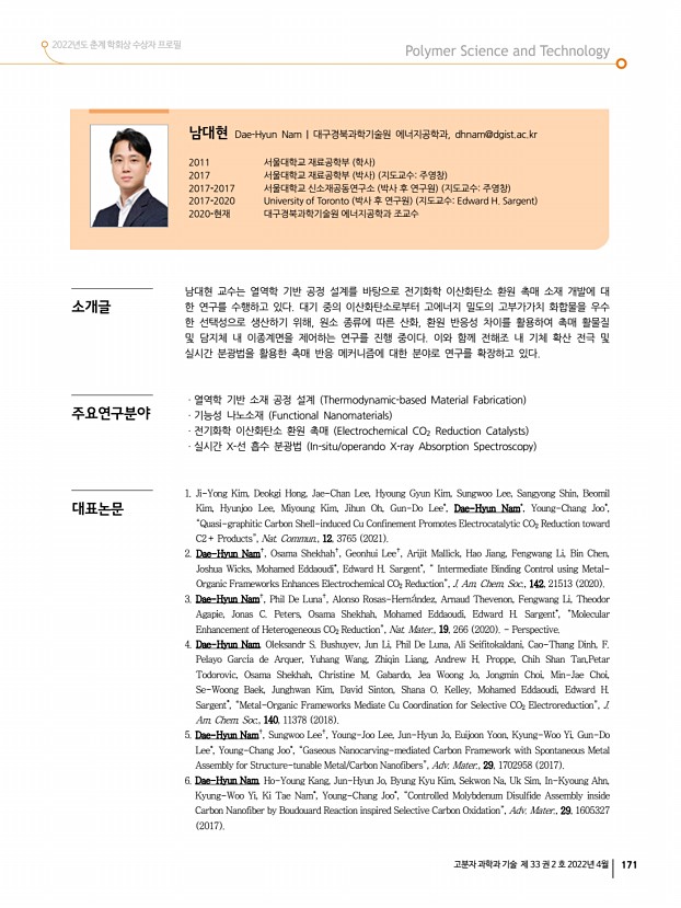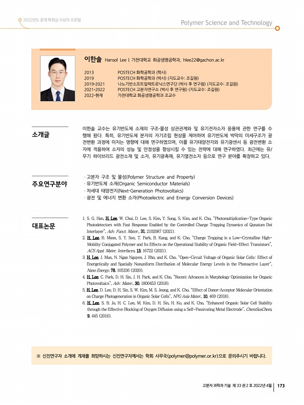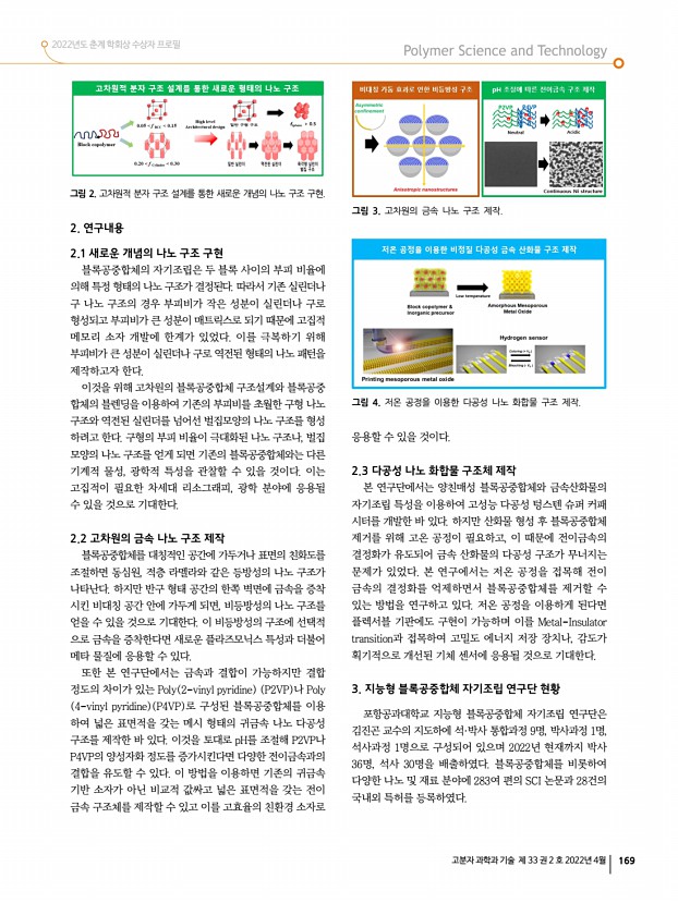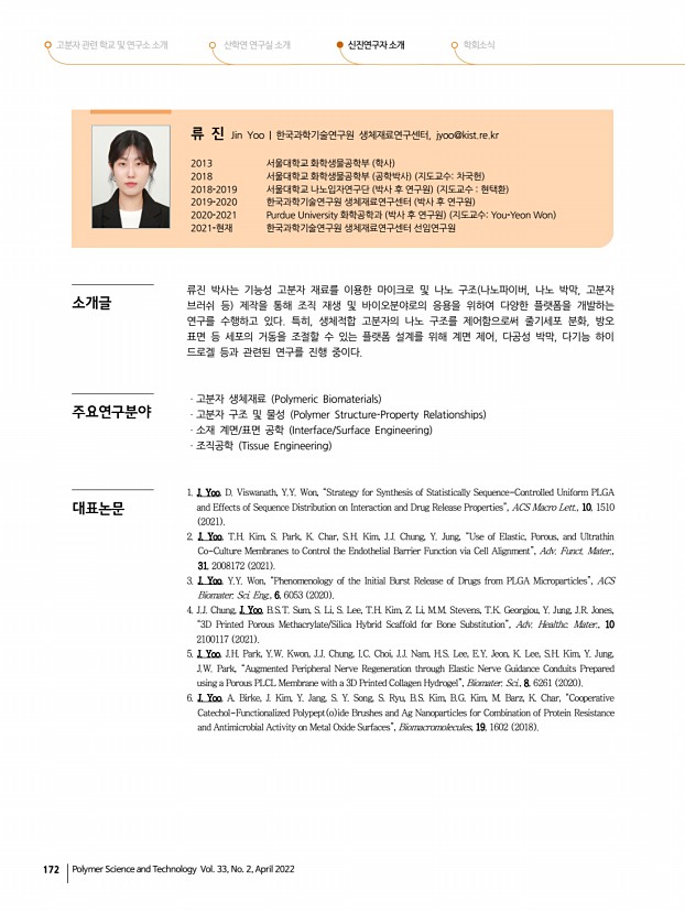 고분자 관련 학교 및 연구소 소개 산학연 연구실 소개 신진연구자 소개 학회소식 172 Polymer Science and Technology Vol. 33, No. 2, April 2022 류 진 Jin Yoo | 한국과학기술연구원 생체재료연구센터, jyoo@kist.re.kr 2013 서울대학교 화학생물공학부 학사 2018 서울대학교 화학생물공학부 공학박사 지도교수차국헌 2018-2019 서울대학교 나노입자연구단 박사 후 연구원 지도교수 현택환 2019-2020 한국과학기술연구원 생체재료연구센터 박사 후 연구원 2020-2021 Purdue University 화학공학과 박사 후 연구원 지도교수You-Yeon Won 2021-현재 한국과학기술연구원 생체재료연구센터 선임연구원 류진 박사는 기능성 고분자 재료를 이용한 마이크로 및 나노 구조 나노파이버, 나노 박막, 고분자 브러쉬 등 제작을 통해 조직 재생 및 바이오분야로의 응용을 위하여 다양한 플랫폼을 개발하는 연구를 ...