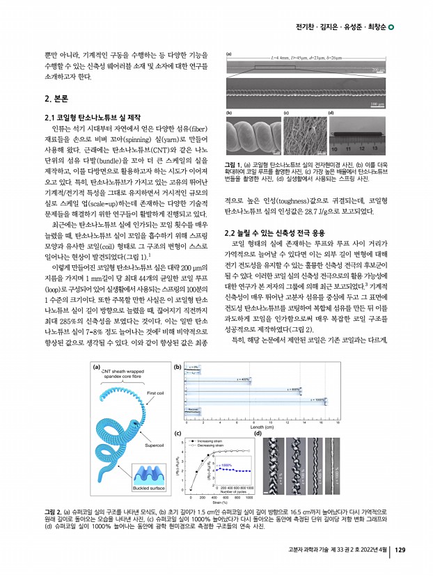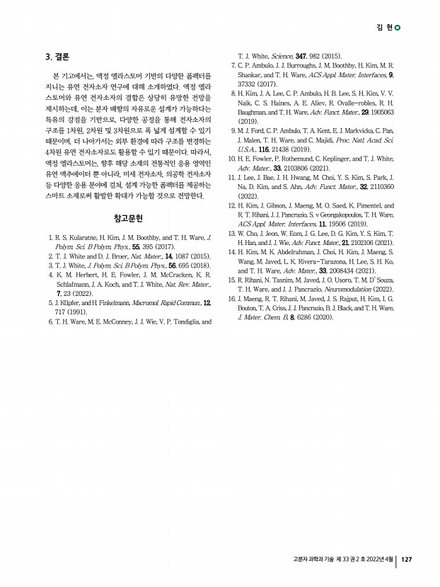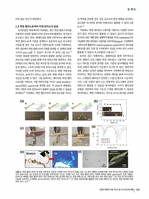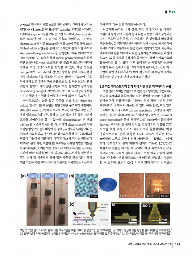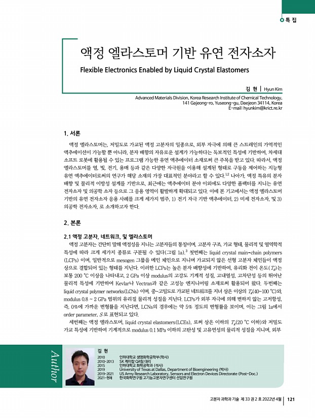 특 집 고분자 과학과 기술 제 33 권 2 호 2022년 4월 121 1. 서론 액정 엘라스토머는, 저밀도로 가교된 액정 고분자의 일종으로, 외부 자극에 의해 큰 스트레인의 가역적인 액추에이션이 가능할 뿐 아니라, 분자 배향의 자유로운 설계가 가능하다는 독보적인 특성에 기반하여, 차세대 소프트 로봇에 활용될 수 있는 프로그램 가능한 유연 액추에이터 소재로써 큰 주목을 받고 있다. 따라서, 액정 엘라스토머를 열, 빛, 전기, 용매 등과 같은 다양한 자극원을 이용해 설계된 형태로 구동을 제어하는 지능형 유연 액추에이터로써의 연구가 해당 소재의 가장 대표적인 분야라고 할 수 있다.1,2 나아가, 액정 특유의 분자 배향 및 물리적 이방성 설계를 기반으로, 최근에는 액추에이터 분야 이외에도 다양한 폼팩터를 지니는 유연 전자소자 및 의공학 소자 등으로 그 응...