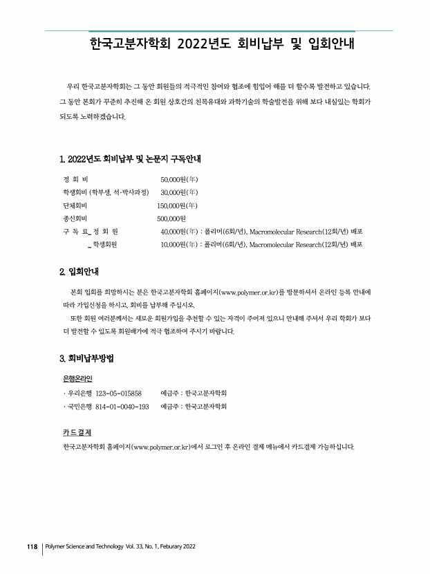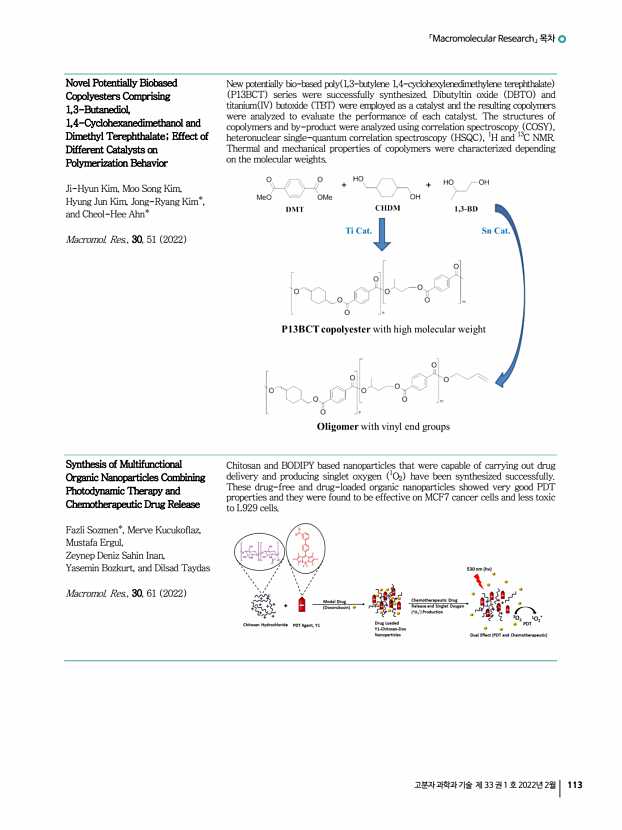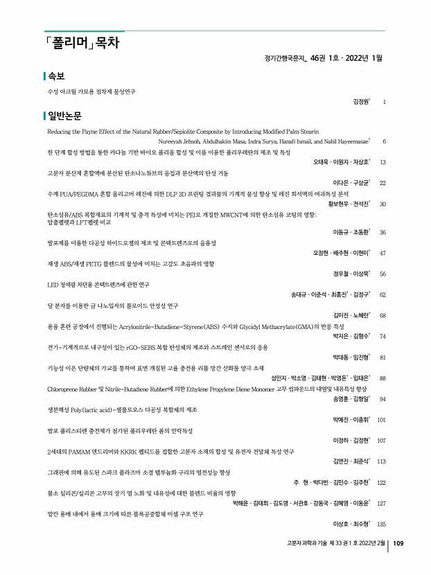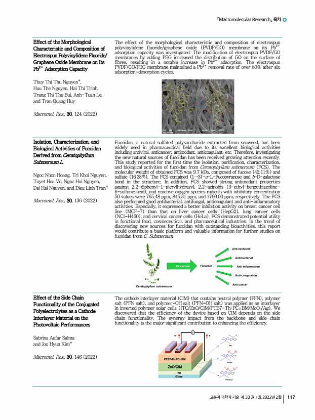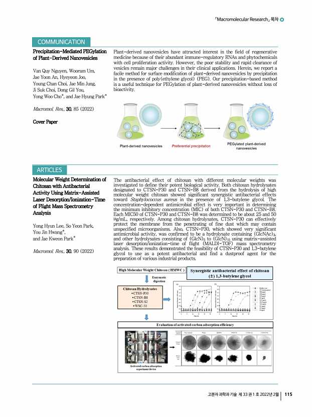 「Macromolecular Research」 목차 고분자 과학과 기술 제 33 권 1 호 2022년 2월 115 COMMUNICATION Precipitation-Mediated PEGylation of Plant-Derived Nanovesicles Van Quy Nguyen, Wooram Um, Jae Yoon An, Hyeyeon Joo, Young Chan Choi, Jae Min Jung, Ji Suk Choi, Dong Gil You, Yong Woo Cho*, and Jae Hyung Park* Macromol. Res., 30, 85 2022 Cover Paper Plant-derived nanovesicles have attracted interest in the field of regenerative medicine because of their abundant immune-regulatory RNAs and phytochemicals with cell proliferation activity. However, the poor stability and rapid clearance of vesicles remain major challenges in their clinical applications. Herein, we report a facile method for surface modification of plant-derived nanovesicles by precipitation in the presence of poly ethylene glycol PEG Our precipitation-based method is a useful technique for PEGylation of plant-derived nanovesicles without loss of bioactivity. ARTICLES Molecular Weight Determination of Chitosan wi...