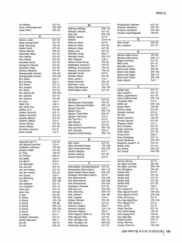색인표 고분자 과학과 기술 제 33 권 1 호 2022년 2월 105 Jin, Kailong VLT-32 Jirayu, Yuenyongsuwan 2PS-209 Josse, Pierre 2PS-34 K Kamcev, Jovan VLT-35 Kang, Hyeong Cheol VLT-14 Kang, Yeo Kyung 1PS-76 Kaplan, David VLT-34 Kataria, Meenal 3PS-42 Katsumata, Reika VLT-16 Kaur, Manjot VLT-26 Kaur, Manjot VLT-45 Kawabata, Kento VLT-29 Kawaguchi, Daisuke VLT-25 Kawahara, Keigo VLT-30 Kawano, Masayuki VLT-25 Khanjanzadeh, Hossein 2PS-251 Khanjanzadeh, Hossein 2PS-252 Kim, DaSol 2L6-4 Kim, EuiJong 2L6-4 Kim, Gaeun VLT-13 Kim, Jungkyu VLT-33 Kim, Minju VLT-33 Kim, Myung-Gil 2PS-254 Kim, Saerona VLT-14 Kim, Saerona VLT-40 Ko, Junsu 1L6-2 Koda, Yuta 1L8-4 Koh, Weon-Kyu VLT-8 Kolekar, G. B. VLT-46 Kolekar, Govind B. VLT-11 Kolekar, Govind B. VLT-22 Koohbor, Behrad VLT-43 Kulkarni, Uddhav 1L3-4 Kumar, Akshay VLT-26 Kumar, Akshay VLT-45 Kuznetsov, Arseniy I. VLT-8 Kwon, SungIll 1L5-9 L Lagerwall, Jan P. F. VLT-44 Lan, Nguyen Xuan Viet 1L3-4 Landfester, Katharina 1PS-90 Laubach, Isabel V...