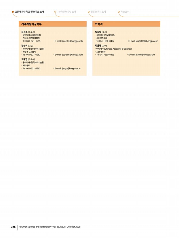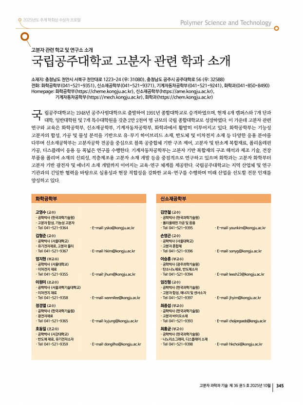 2025년도 추계 학회상 수상자 프로필 고분자 과학과 기술 제 36 권 5 호 2025년 10월 345 고분자 관련 학교 및 연구소 소개 국립공주대학교 고분자 관련 학과 소개 소재지충청남도 천안시 서북구 천안대로 1223-24 우31080 , 충청남도 공주시 공주대학로 56 우32588 전화화학공학부 041-521-9351 , 신소재공학부 041-521-9371 , 기계자동차공학부 041-521-9241 , 화학과 041-850-8490 Homepage화학공학부 https//cheme.kongju.ac.kr , 신소재공학부 https//ame.kongju.ac.kr , 기계자동차공학부 https//mech.kongju.ac.kr , 화학과 https//chem.kongju.ac.kr 립공주대학교는 1948년 공주사범대학으로 출발하여 1991년 종합대학교로 승격하였으며, 현재 4개 캠퍼스와 7개 단과 대학, 일반대학원 및 7개 특수대학원을 갖춘 2만 2천여 명 규모의 국립 종합대학교로 성장하였다. 이 가운데 고분자 관련 연구와 교육은 화학공학부, ...