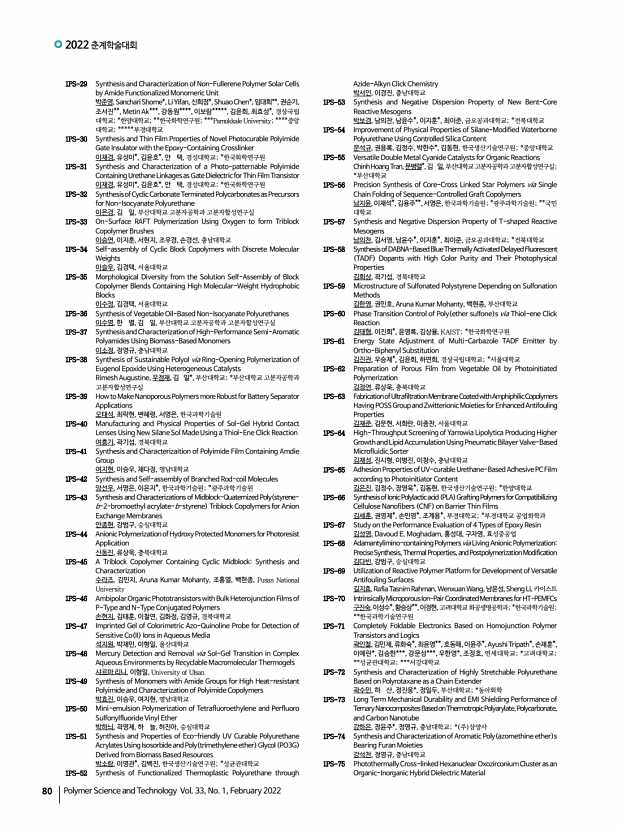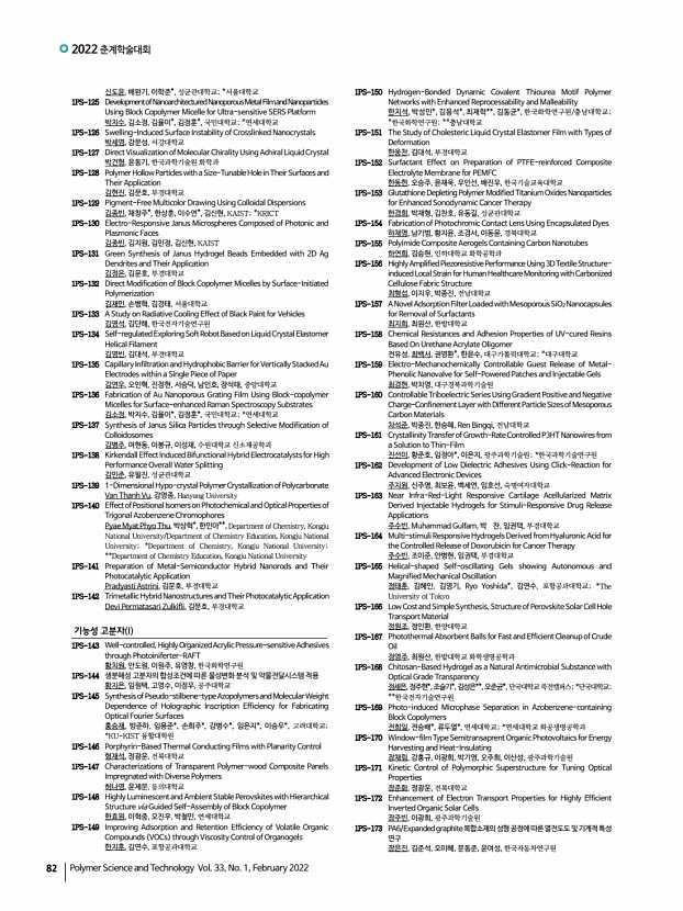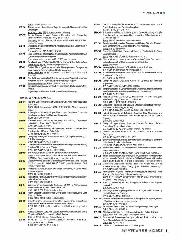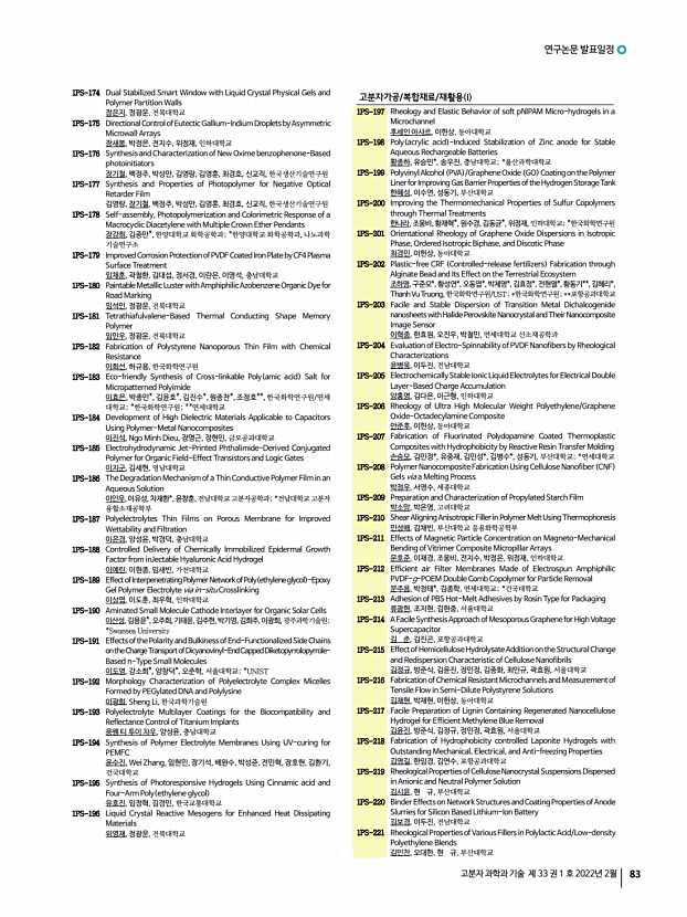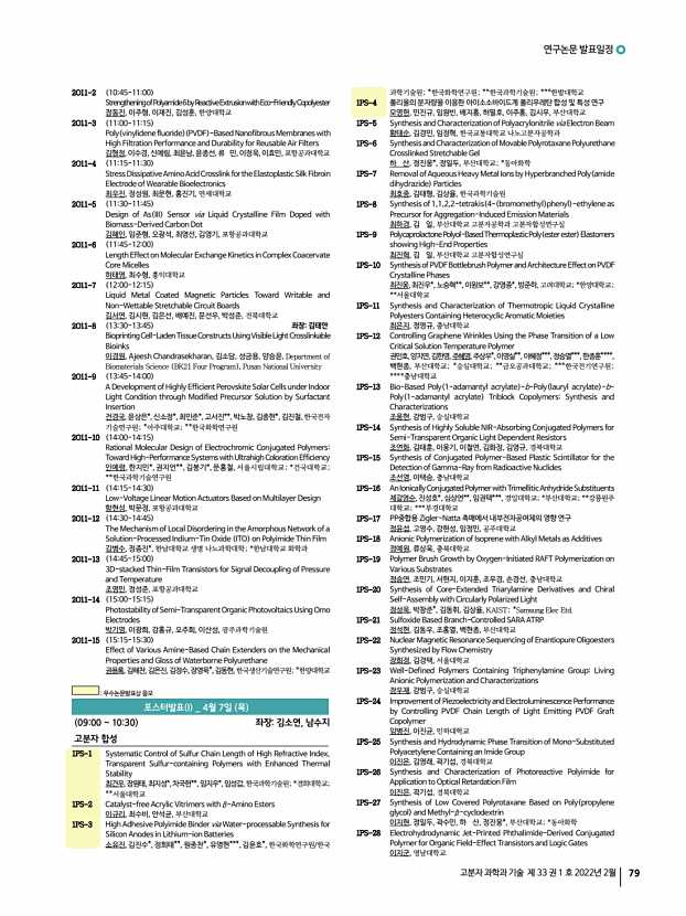 연구논문 발표일정 고분자 과학과 기술 제 33 권 1 호 2022년 2월 83 1PS-174 Dual Stabilized Smart Window with Liquid Crystal Physical Gels and Polymer Partition Walls 장은지, 정광운, 전북대학교 1PS-175 Directional Control of Eutectic Gallium-Indium Droplets by Asymmetric Microwall Arrays 장새봄, 박정은, 전지수, 위정재, 인하대학교 1PS-176 Synthesis and Characterization of New Oxime benzophenone-Based photoinitiators 장기철, 백정주, 박성만, 김영랑, 김영훈, 최경호, 신교직, 한국생산기술연구원 1PS-177 Synthesis and Properties of Photopolymer for Negative Optical Retarder Film 김영랑, 장기철, 백정주, 박성만, 김영훈, 최경호, 신교직, 한국생산기술연구원 1PS-178 Self-assembly, Photopolymerization and Colorimetric Response of a Macrocyclic Diacetylene with Multiple Crown Ether Pendants 장강희, 김종만*, 한양대학교 화학공학과; *한양대학교 화학공학과, 나노과학 기...
