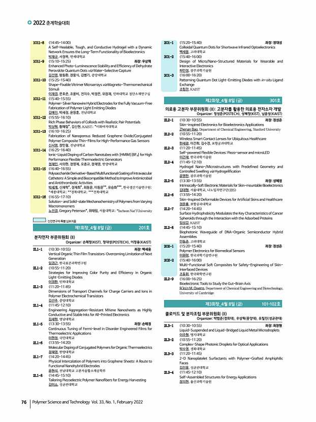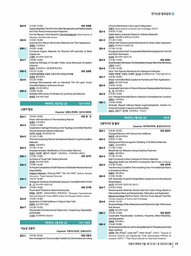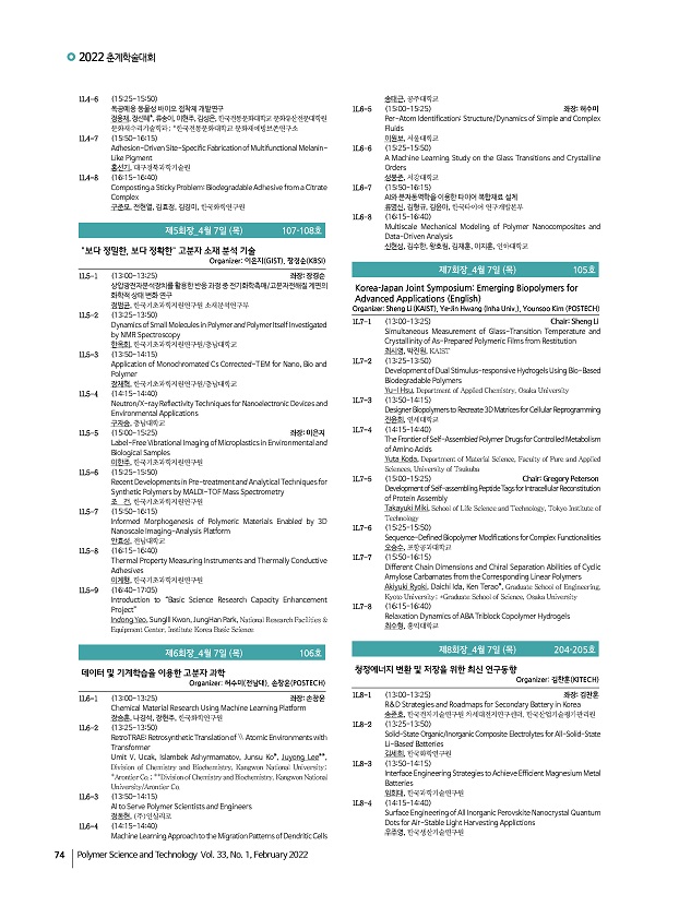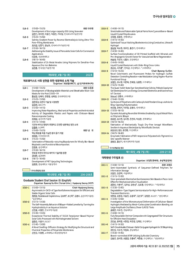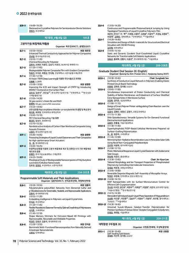 ...기, 이유진, SK케미칼 화학연구소 2L7-3 1120-1145 Biodegradable Polymer Composite Film with Gradient Composition 박종진, 차석준, 최형섭, 안다혜, 전남대학교 고분자융합소재공학부 2L7-4 1145-1210 AI Vision 기반의 Deep Learning을 이용한 무인사출조건 최적화 김월룡, LG화학 2L7-5 1330-1355 좌장윤명한 Improving the ILSS and Impact Strength of CFRTP by Introducing MWNCT Anchored on the Carbon Fiber 김민국, 임준우*, 천진실**, 한국과학기술연구원; *전북대학교; **한국섬유 기계융합연구원 2L7-6 1355-1420 SK geo centric’s Green Biz and R&D 함형택, SK geo centric/SK innovation 2L7-7 1420-1445 난연 섬유용 Poly vinylidene chloride-co-acrylonitrile 의 중합 및 특성 분석 육지호, 최호원, 인하대학교 화학공학과 2L7-8 1445-1510 PET Chemical Recycling 기술 동향 홍성민, 임성수, 롯데케미칼 2L7-9 1510-1535 Nondestructive Analysis of Carbon Fiber Reinforced Composite Usin...