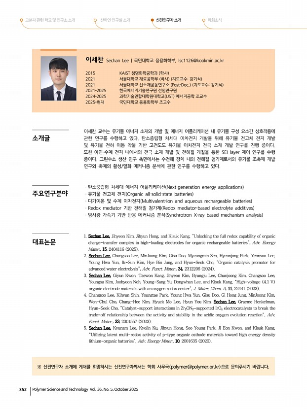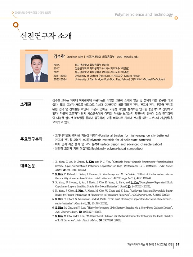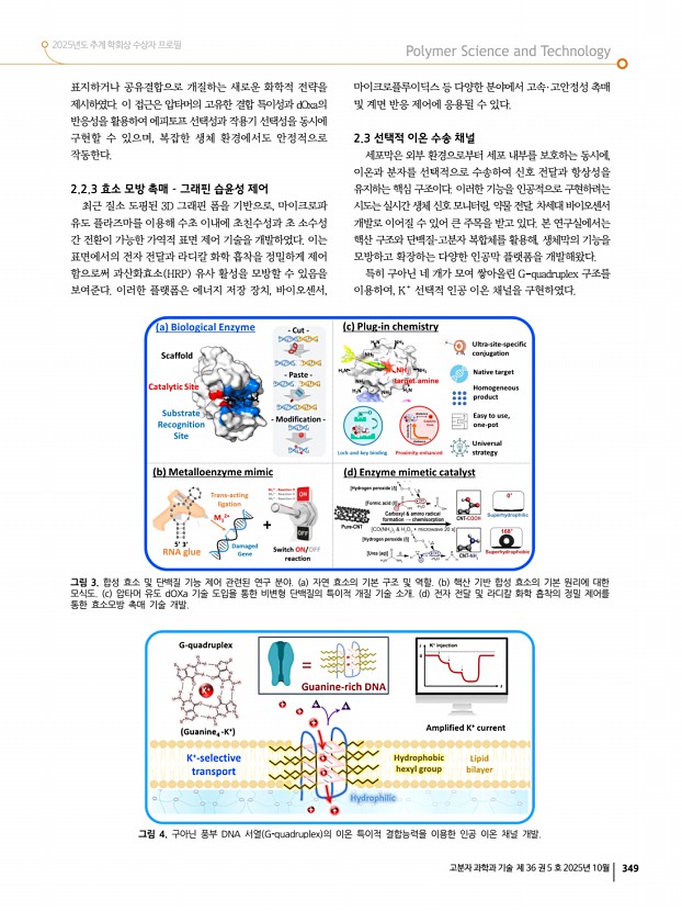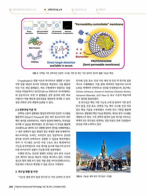 ...ence Advances, Journal of American Chemical Society, Advanced Materials, ACS Nano 등 최고 수준의 학술지에 연구 결과를 발표하였다. 본 연구실은 핵산 기반 기능성 소재 및 압타머 기반 분자 인식 물질, 인공 효소, 단백질 기능 제어 시스템, 인공 막과 같은 핵심 기술을 구축하였다. 이러한 연구 기반을 활용해 앞으로도 생명체의 핵심 기능을 확장하는 새로운 분자 시스템을 개발하고자 한다. 기초 과학적 발견과 응용 연구를 아우르는 세계적 선도 연구실로 성장하는 것을 목표로 전체 구성원들이 최선을 다해 노력하고 있다. 그림 5. 단백질 기반 반투과성 인공막 시스템 구현 및 핵산 기반 압타머 센서의 활용 가능성 확장. 그림 6. 기능성 생체 분자 연구실의구성원.