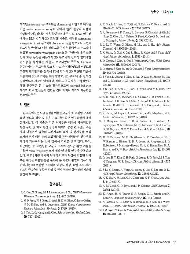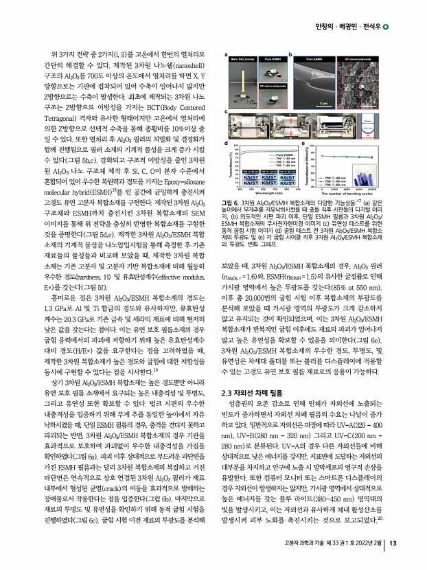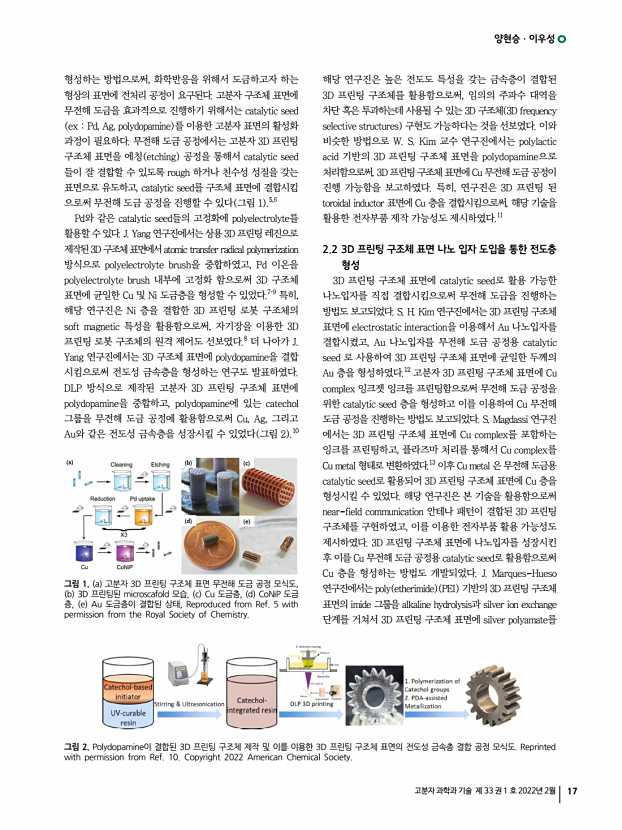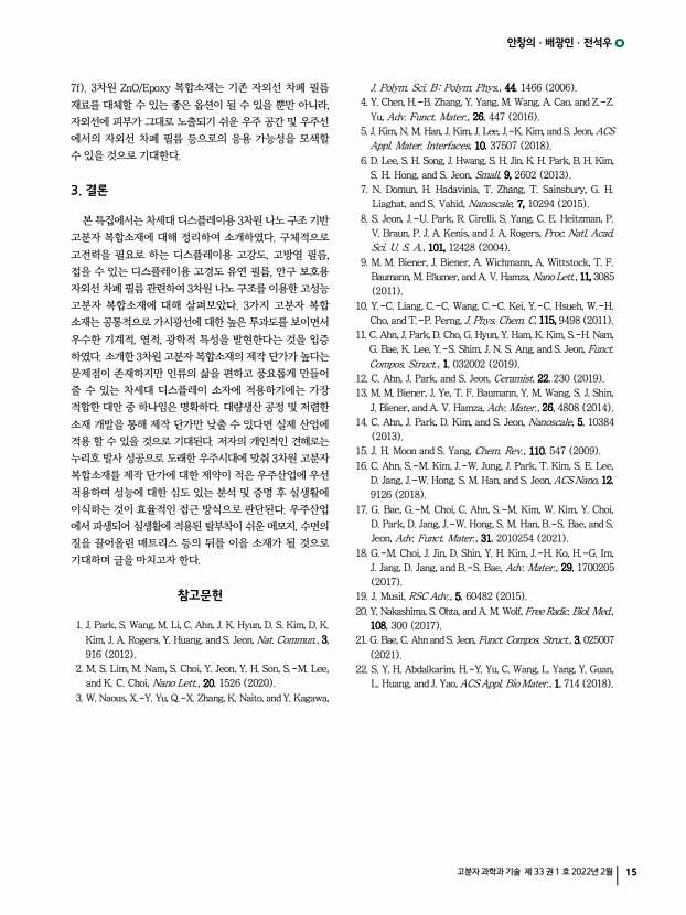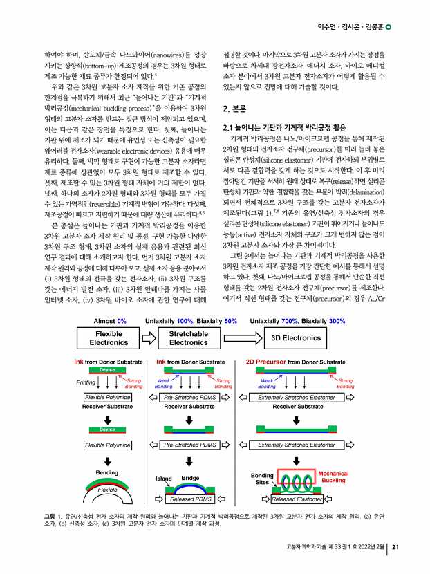 이수언ㆍ김시몬ㆍ김봉훈 고분자 과학과 기술 제 33 권 1 호 2022년 2월 21 하여야 하며, 반도체/금속 나노와이어 nanowires 를 성장 시키는 상향식 bottom-up 제조공정의 경우는 3차원 형태로 제조 가능한 재료 종류가 한정되어 있다.4 위와 같은 3차원 고분자 소자 제작을 위한 기존 공정의 한계점을 극복하기 위해서 최근 “늘어나는 기판”과 “기계적 박리공정 mechanical buckling process ”을 이용하여 3차원 형태의 고분자 소자를 만드는 접근 방식이 제안되고 있으며, 이는 다음과 같은 장점을 특징으로 한다. 첫째, 늘어나는 기판 위에 제조가 되기 때문에 유연성 또는 신축성이 필요한 웨어러블 전자소자 wearable electronic devices 응용에 매우 유리하다. 둘째, 박막 형태로 구현이 가능한 고분자 소자라면 재료 종류에 상관없이 모두 3차원 형태로 제조할 수 있다. 셋째, ...