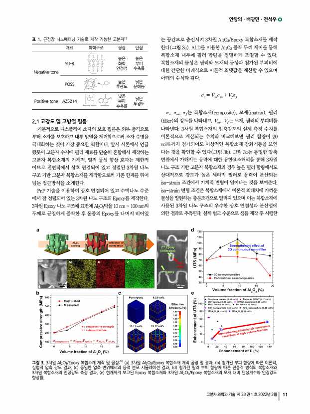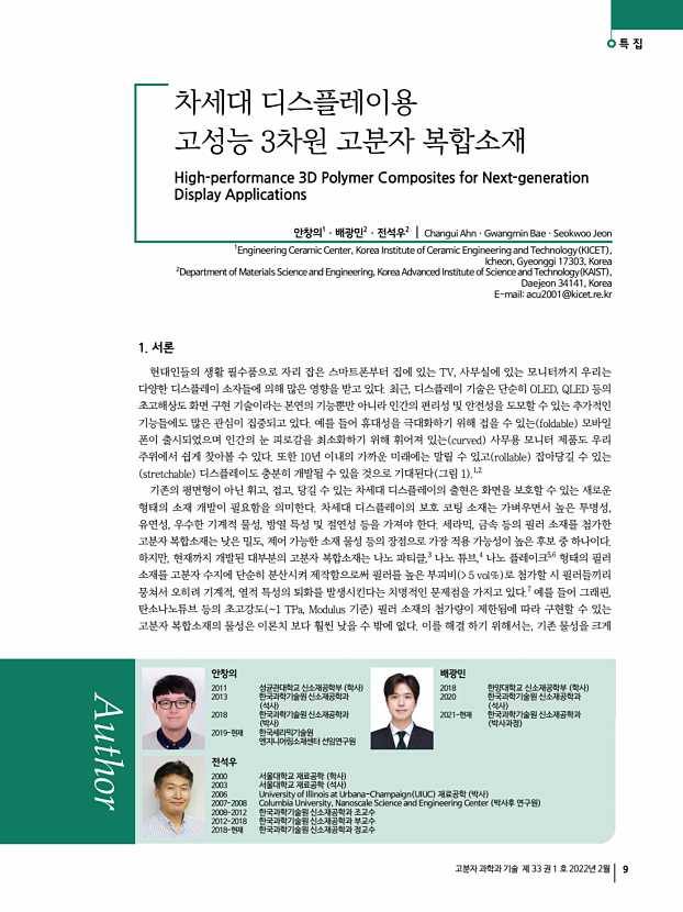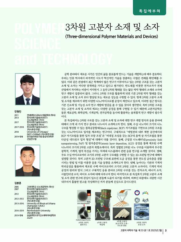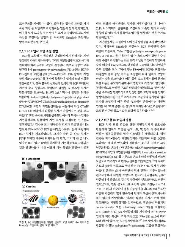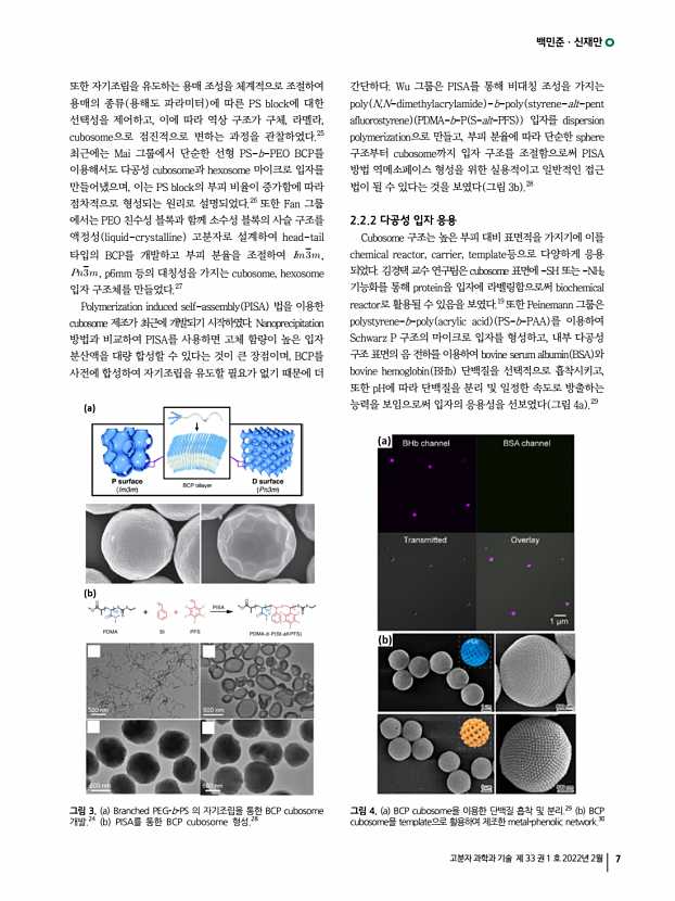 백민준ㆍ신재만 고분자 과학과 기술 제 33 권 1 호 2022년 2월 7 또한 자기조립을 유도하는 용매 조성을 체계적으로 조절하여 용매의 종류 용해도 파라미터 에 따른 PS block에 대한 선택성을 제어하고, 이에 따라 역상 구조가 구체, 라멜라, cubosome으로 점진적으로 변하는 과정을 관찰하였다.25 최근에는 Mai 그룹에서 단순한 선형 PS-b-PEO BCP를 이용해서도 다공성 cubosome과 hexosome 마이크로 입자를 만들어냈으며, 이는 PS block의 부피 비율이 증가함에 따라 점차적으로 형성되는 원리로 설명되었다.26 또한 Fan 그룹 에서는 PEO 친수성 블록과 함께 소수성 블록의 사슬 구조를 액정성 liquid-crystalline 고분자로 설계하여 head-tail 타입의 BCP를 개발하고 부피 분율을 조절하여 , , p6mm 등의 대칭성을 가지는 cubosome, hexosome 입자 구조체를 만들었다.27 Polymer...
