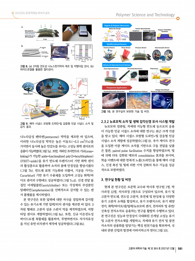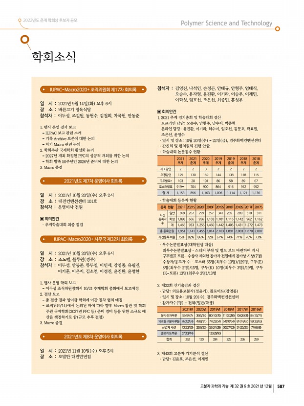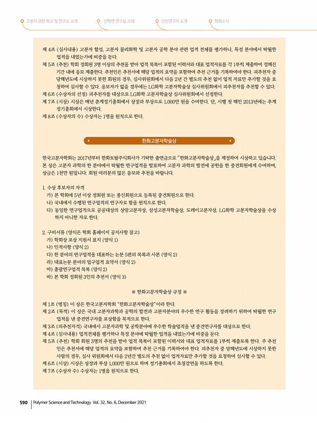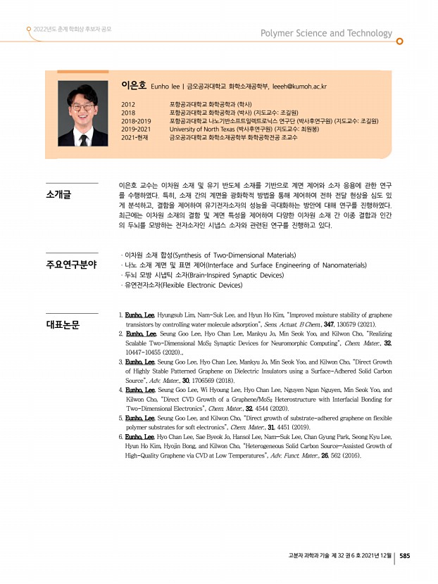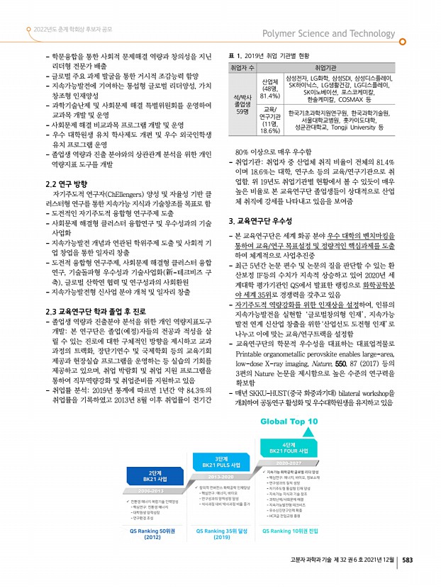 2022년도 춘계 학회상 후보자 공모 고분자 과학과 기술 제 32 권 6 호 2021년 12월 583 취업자 수 취업기관 석/박사 졸업생 59명 산업체 48명, 81.4% 삼성전자, LG화학, 삼성SDI, 삼성디스플레이, SK하이닉스, LG생활건강, LG디스플레이, SK이노베이션, 포스코케미칼, 한솔케미칼, COSMAX 등 교육/ 연구기관 11명, 18.6% 한국기초과학지원연구원, 한국과학기술원, 서울대학교병원, 훗카이도대학, 성균관대학교, Tongji University 등 학문융합을 통한 사회적 문제해결 역량과 창의성을 지닌 표 1. 2019년 취업 기관별 현황 리더형 전문가 배출 글로벌 주요 과제 발굴을 통한 거시적 조감능력 함양 지속가능발전에 기여하는 통섭형 글로벌 리더양성, 가치 창조형 인재양성 과학기술난제 및 사회문제 해결 특별위원회를 운영하여 교과목 개발 및 운영 사회문제 해결 비교과목 프로그램 ...