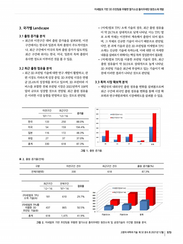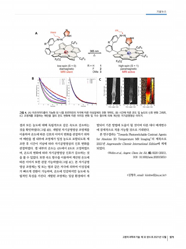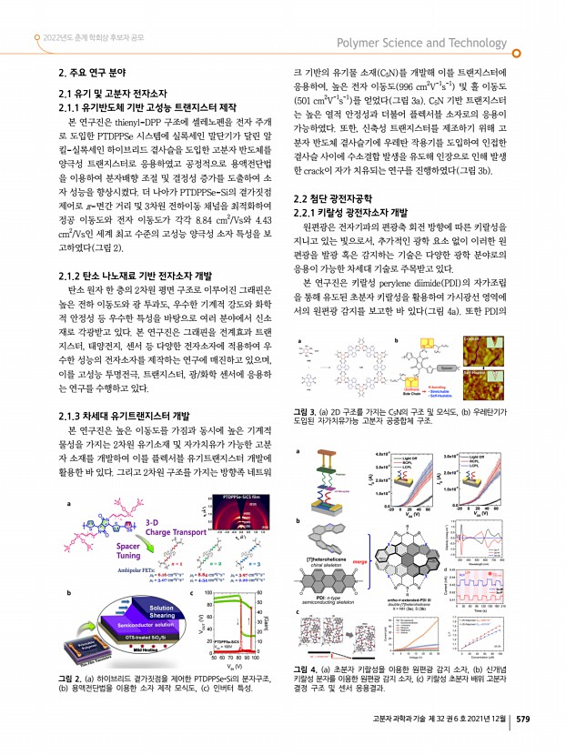 2022년도 춘계 학회상 후보자 공모 고분자 과학과 기술 제 32 권 6 호 2021년 12월 579 그림 2. a 하이브리드 곁가짓점을 제어한 PTDPPSe-Si의 분자구조, b 용액전단법을 이용한 소자 제작 모식도, c 인버터 특성. 그림 3. a 2D 구조를 가지는 C5N의 구조 및 모식도, b 우레탄기가 도입된 자가치유가능 고분자 공중합체 구조. 그림 4. a 초분자 키랄성을 이용한 원편광 감지 소자, b 신개념 키랄성 분자를 이용한 원편광 감지 소자, c 키랄성 초분자 배위 고분자 결정 구조 및 센서 응용결과. 2. 주요 연구 분야 2.1 유기 및 고분자 전자소자 2.1.1 유기반도체 기반 고성능 트랜지스터 제작 본 연구진은 thienyl-DPP 구조에 셀레노펜을 전자 주개 로 도입한 PTDPPSe 시스템에 실록세인 말단기가 달린 알 킬-실록세인 하이브리드 곁사슬을 도입한 고분자 반도체를 양극성 트랜지스터로 응...