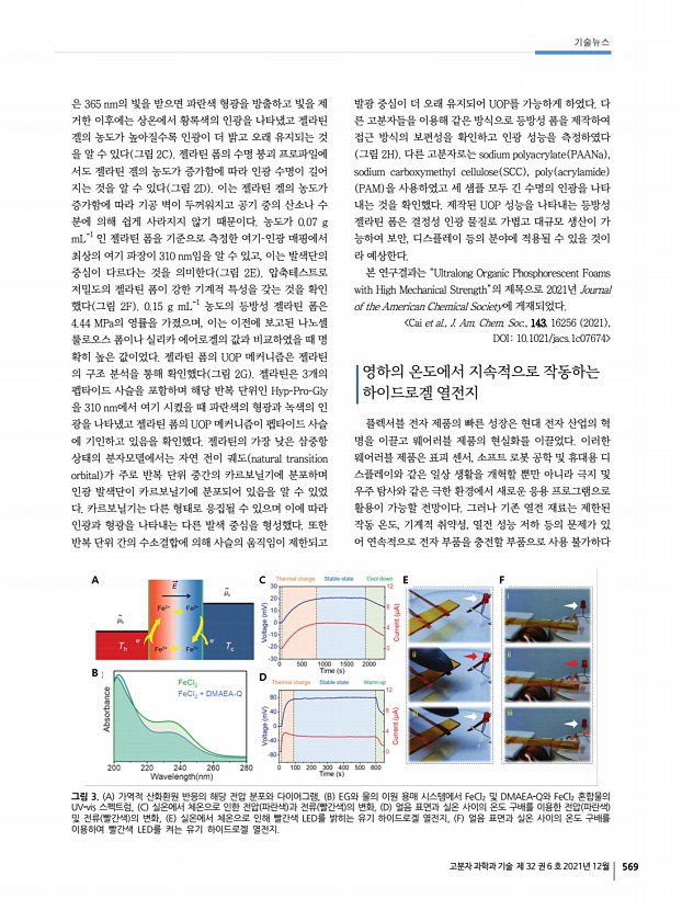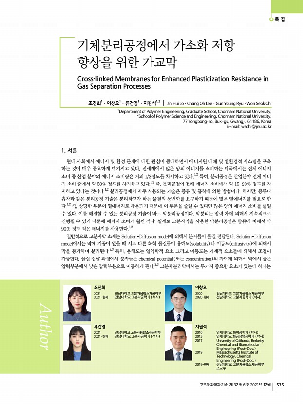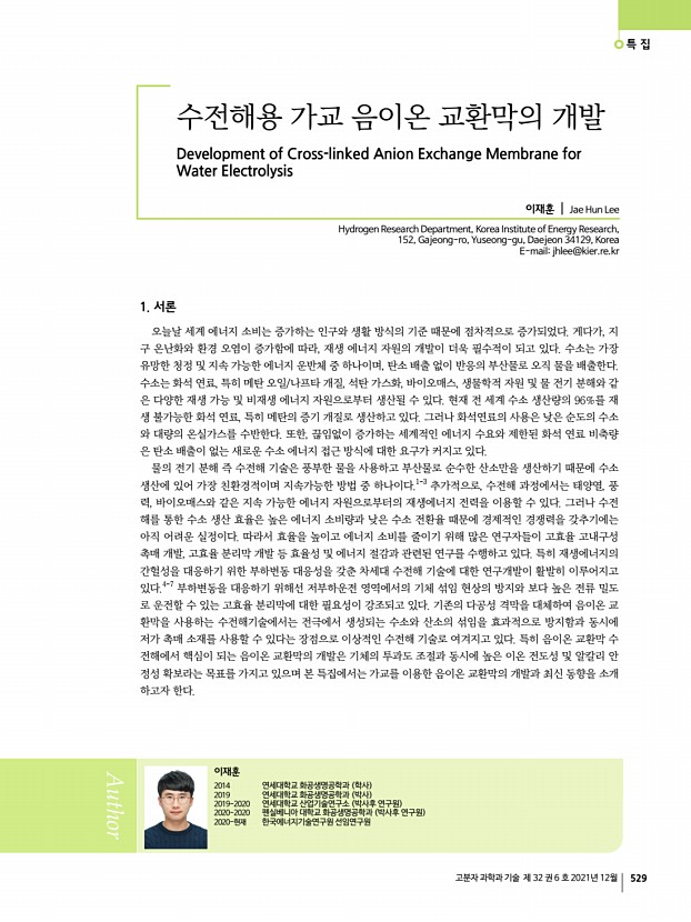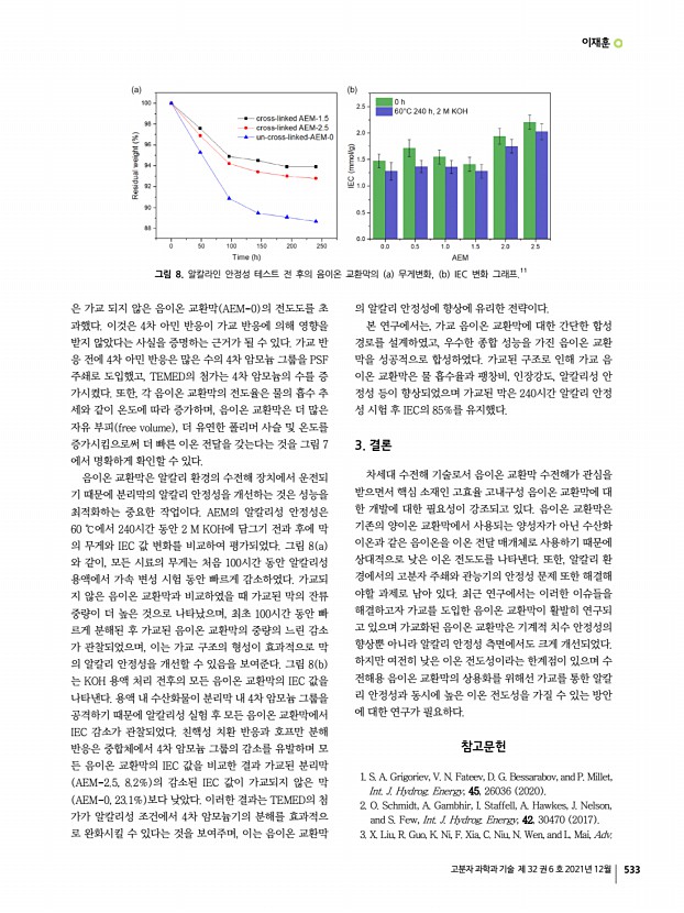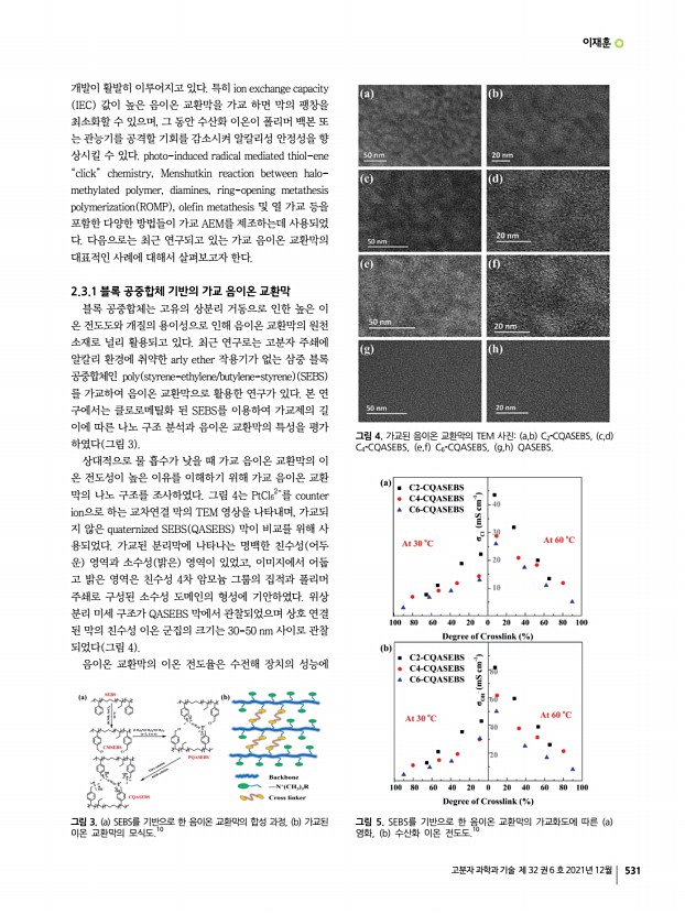 이재훈 고분자 과학과 기술 제 32 권 6 호 2021년 12월 531 그림 3. a SEBS를 기반으로 한 음이온 교환막의 합성 과정, b 가교된 이온 교환막의 모식도.10 그림 4. 가교된 음이온 교환막의 TEM 사진a,b C2-CQASEBS, c,d C4-CQASEBS, e,f C6-CQASEBS, g,h QASEBS. 그림 5. SEBS를 기반으로 한 음이온 교환막의 가교화도에 따른 a 염화, b 수산화 이온 전도도.10 개발이 활발히 이루어지고 있다. 특히 ion exchange capacity IEC 값이 높은 음이온 교환막을 가교 하면 막의 팽창을 최소화할 수 있으며, 그 동안 수산화 이온이 폴리머 백본 또 는 관능기를 공격할 기회를 감소시켜 알칼리성 안정성을 향 상시킬 수 있다. photo-induced radical mediated thiol-ene “click” chemistry, Menshutkin reaction between halomethylated polymer, diamines, ring-opening metathesis polymerization ROMP , olefin metathesis 및 열 가교 등을 포함한 다양한 방법들이 ...