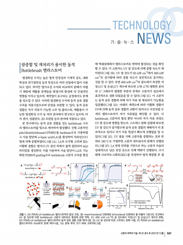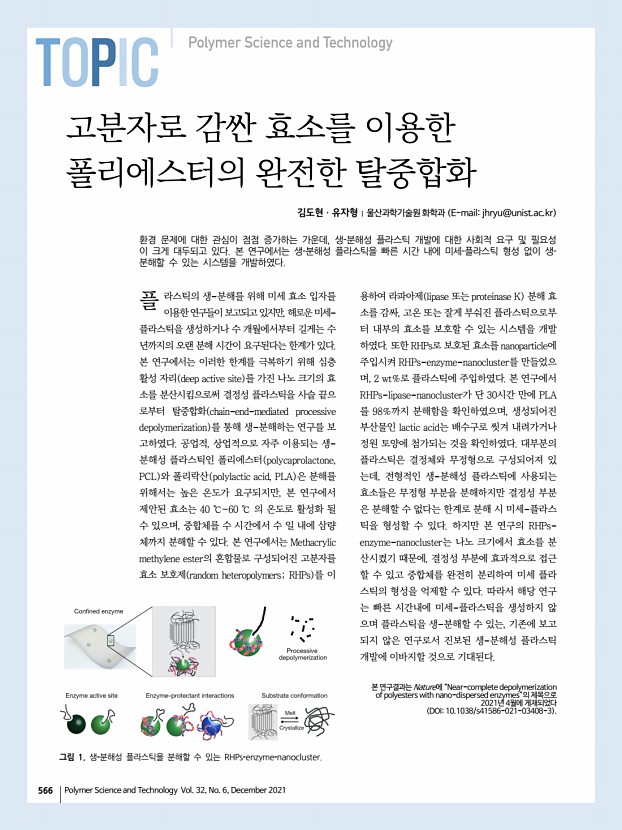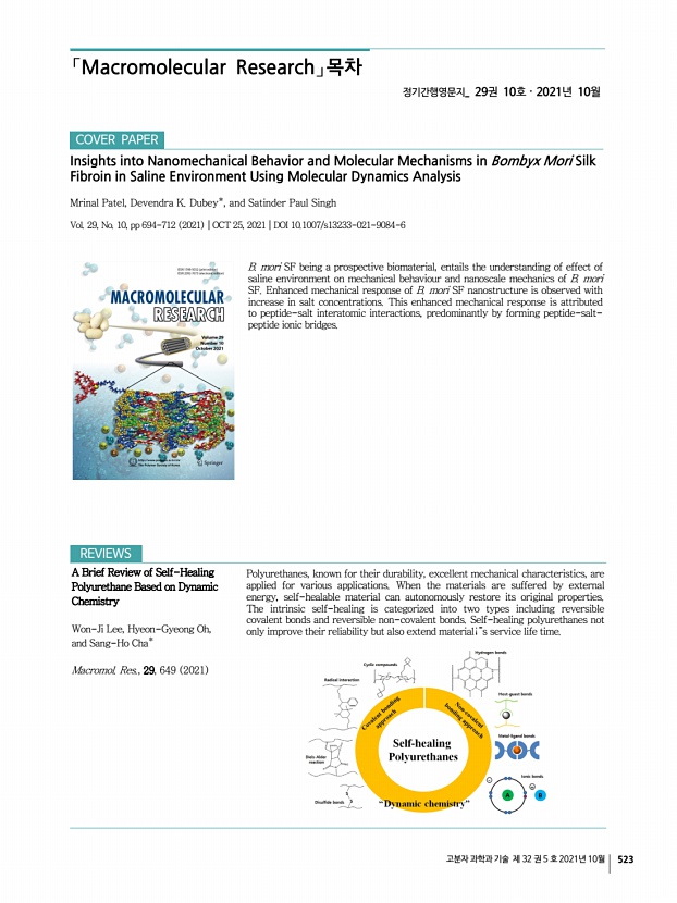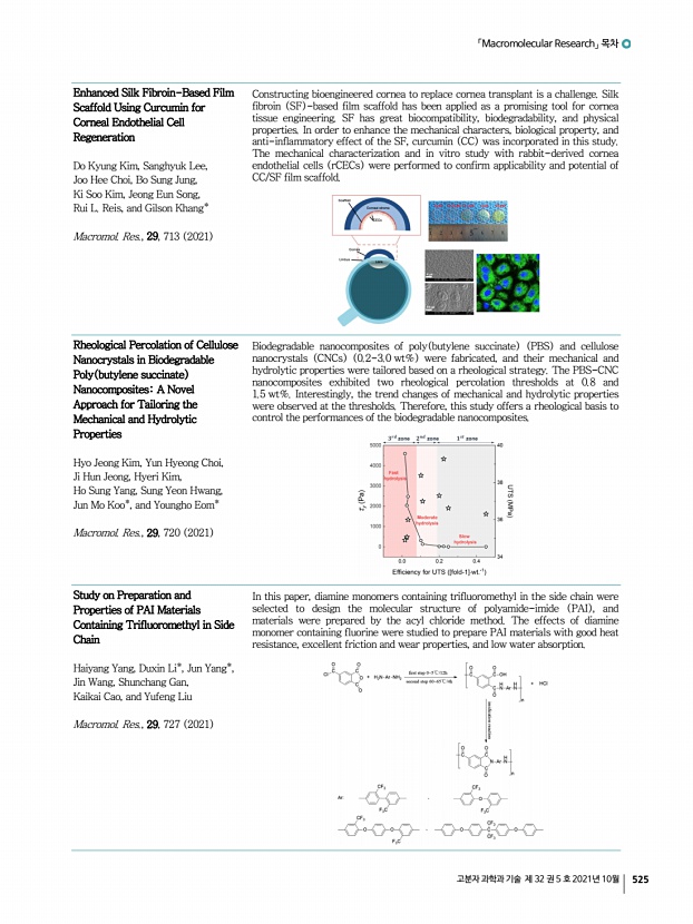 「Macromolecular Research」 목차 고분자 과학과 기술 제 32 권 5 호 2021년 10월 525 Enhanced Silk Fibroin-Based Film Scaffold Using Curcumin for Corneal Endothelial Cell Regeneration Do Kyung Kim, Sanghyuk Lee, Joo Hee Choi, Bo Sung Jung, Ki Soo Kim, Jeong Eun Song, Rui L. Reis, and Gilson Khang* Macromol. Res., 29, 713 2021 Constructing bioengineered cornea to replace cornea transplant is a challenge. Silk fibroin SF -based film scaffold has been applied as a promising tool for cornea tissue engineering. SF has great biocompatibility, biodegradability, and physical properties. In order to enhance the mechanical characters, biological property, and anti-inflammatory effect of the SF, curcumin CC was incorporated in this study. The mechanical characterization and in vitro study with rabbit-derived cornea endothelial cells rCECs were performed to confirm applicability and potential of CC/SF film scaffold. Rheological Percolation of Cellulose Nanocrystals in Biodegradable P...